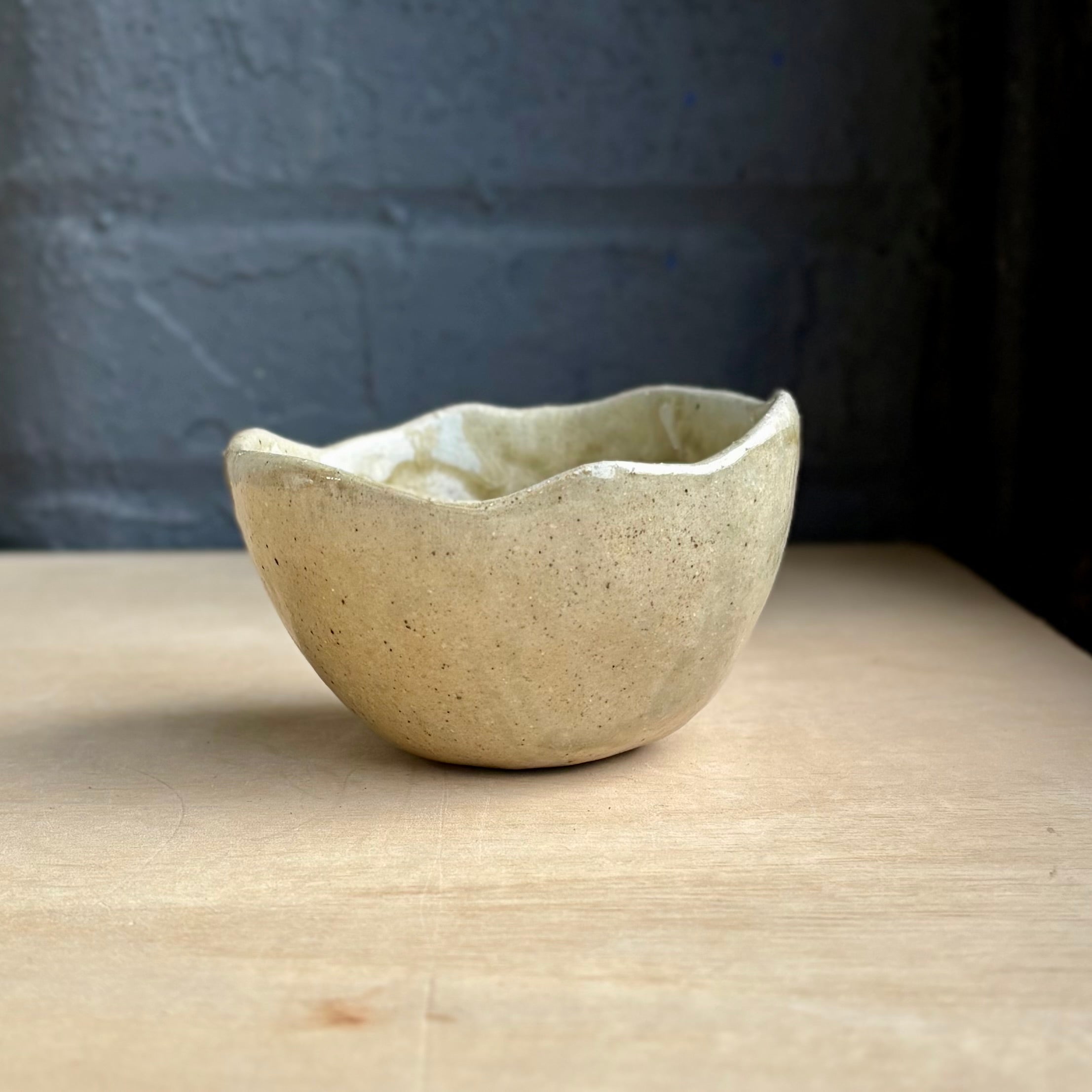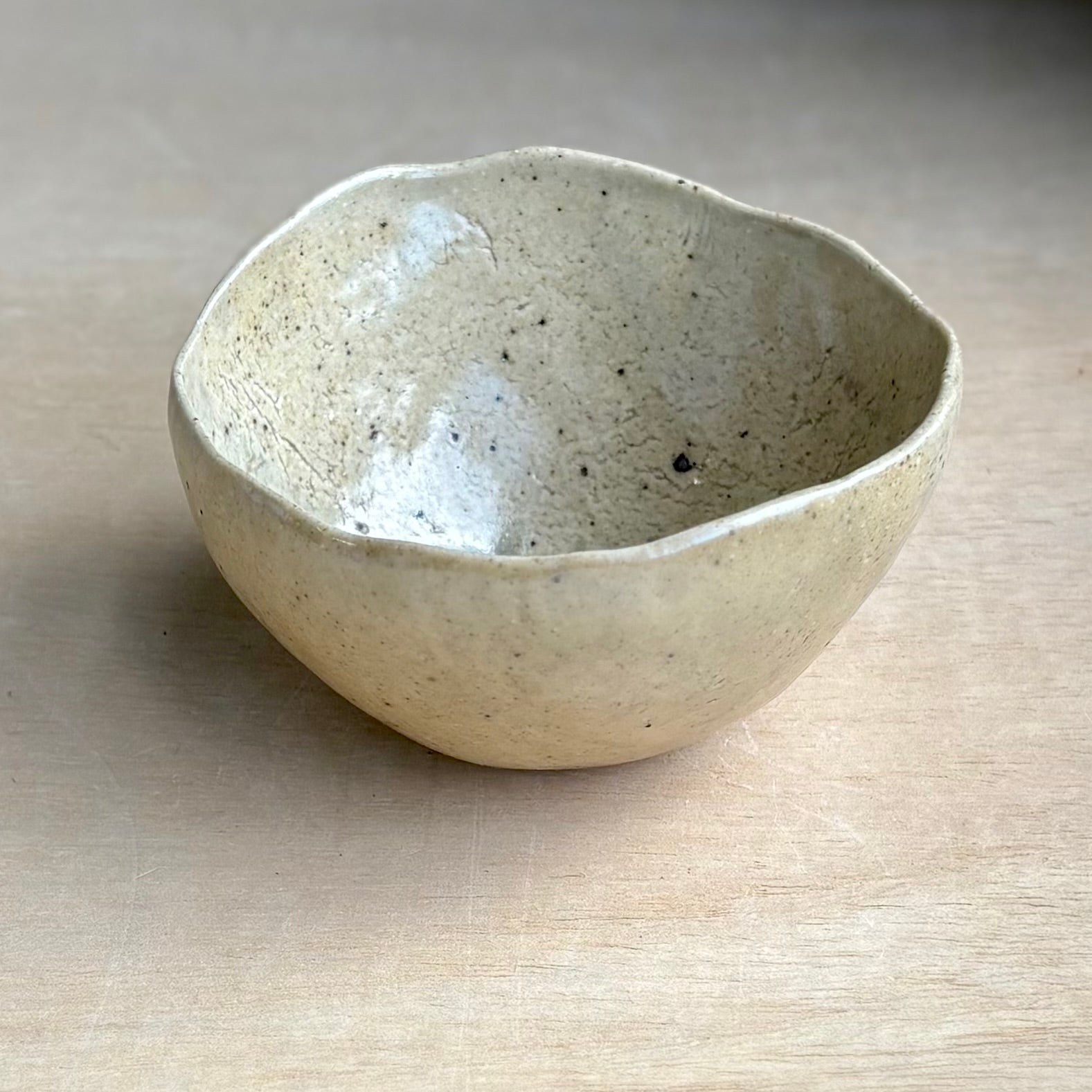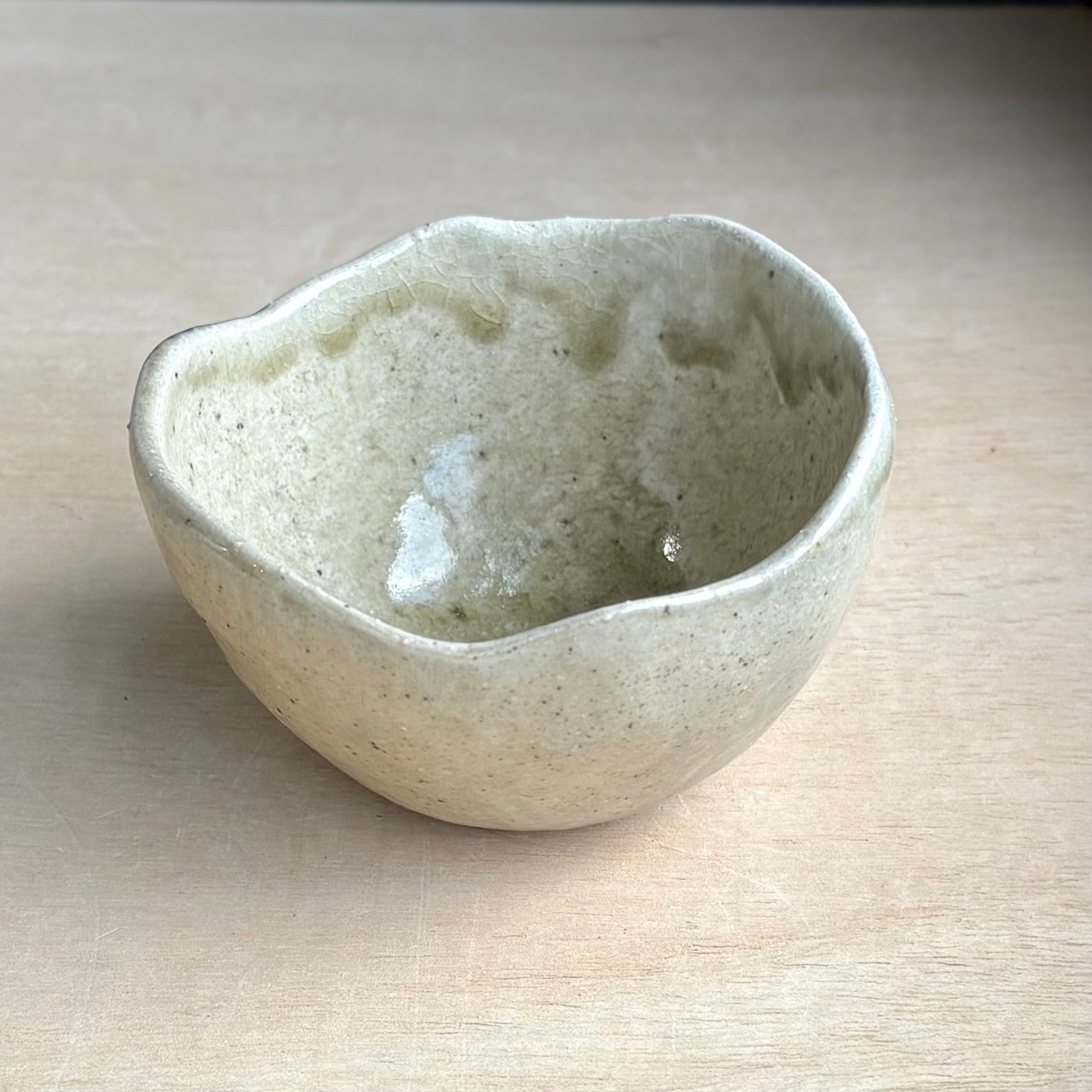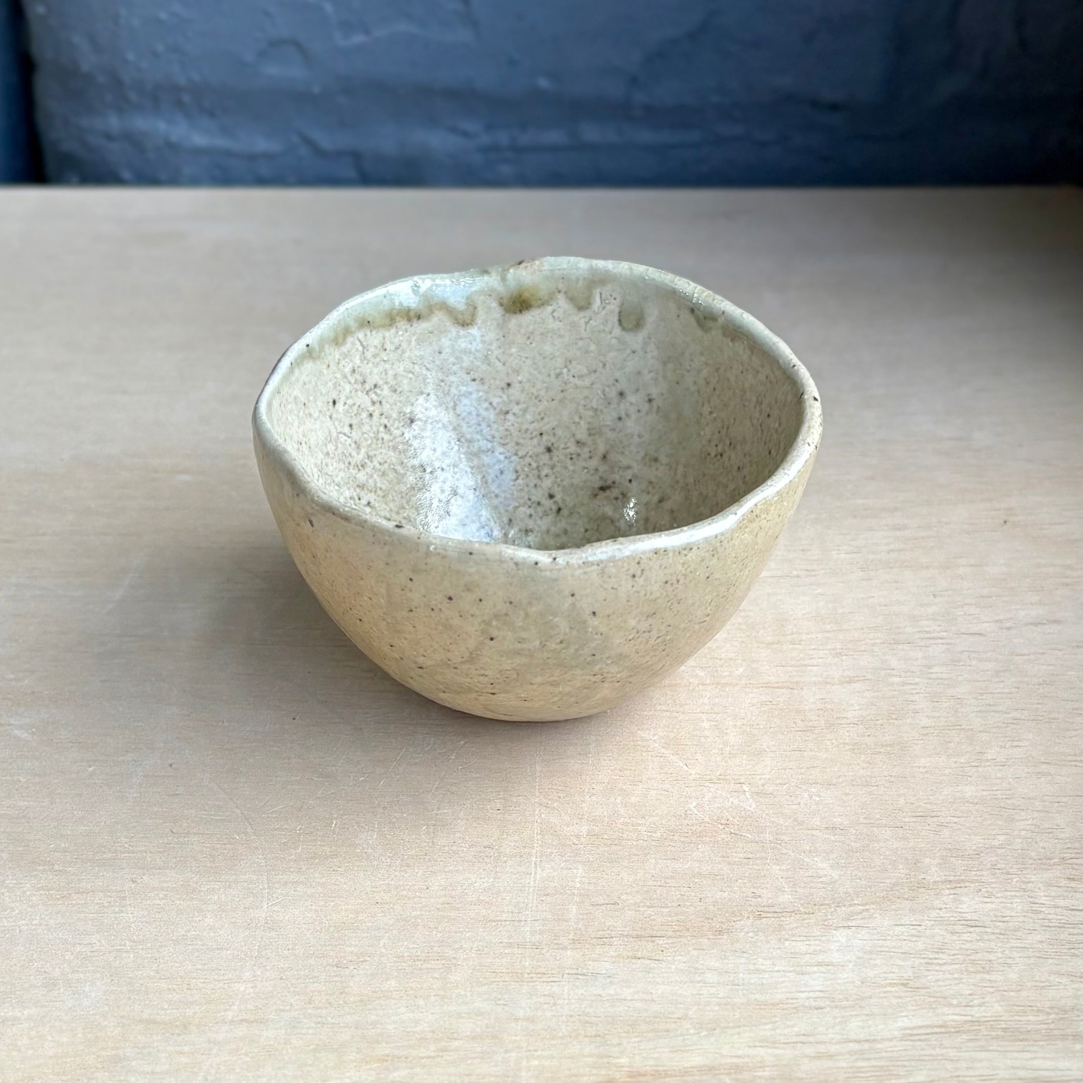 陶芸家 アンディ・ヴロック (Andy Vlock) によるこの萩焼(はぎやき)小鉢は、薪窯焼成による手作り陶器の繊細な美しさを表現した作品です。白色の陶土を用いて成形されており、他の小鉢よりも薄手で、軽やかで洗練された印象を持っています。