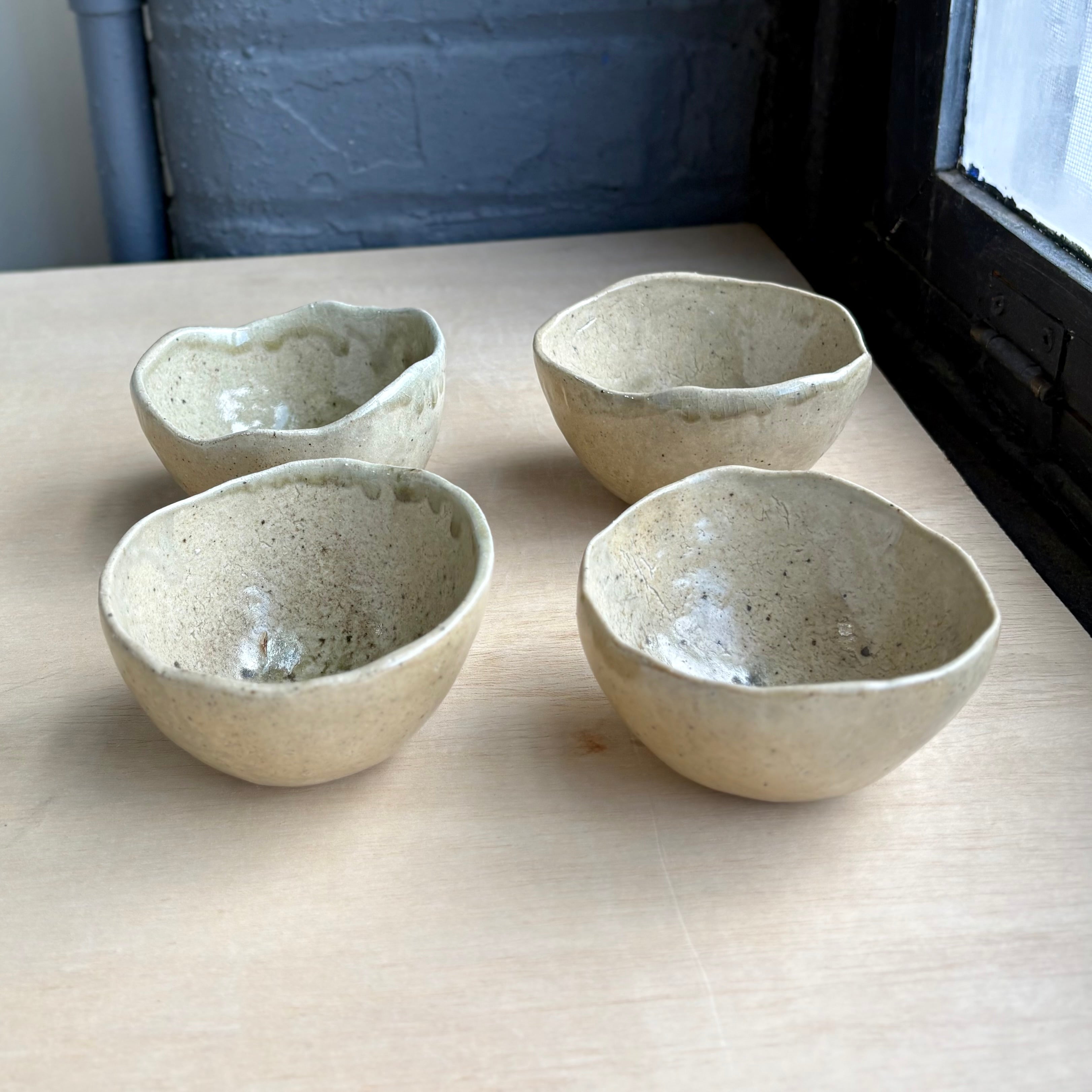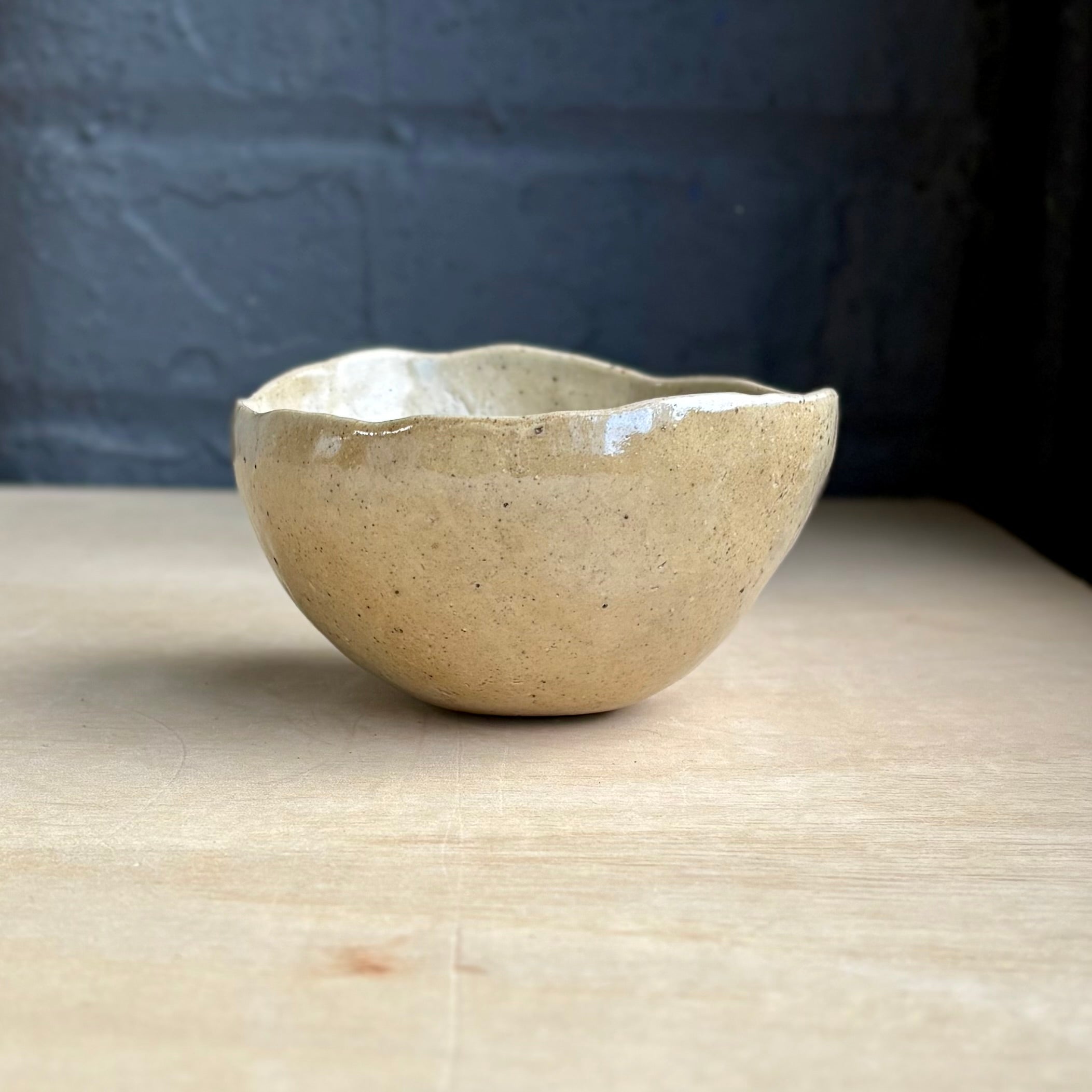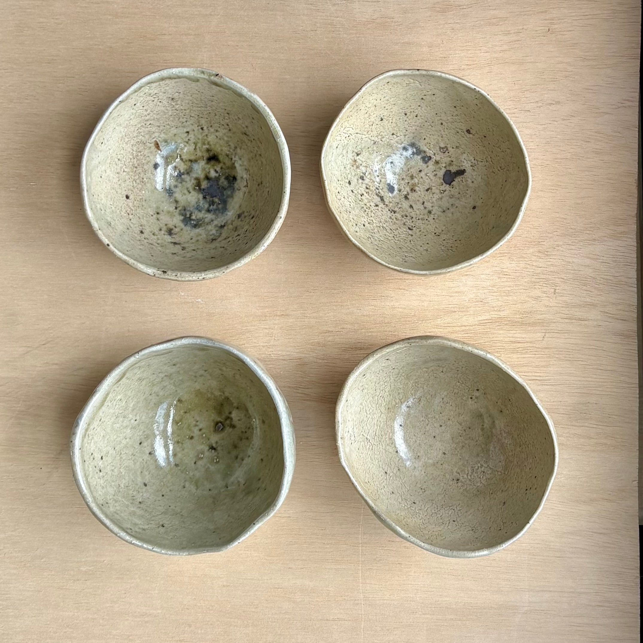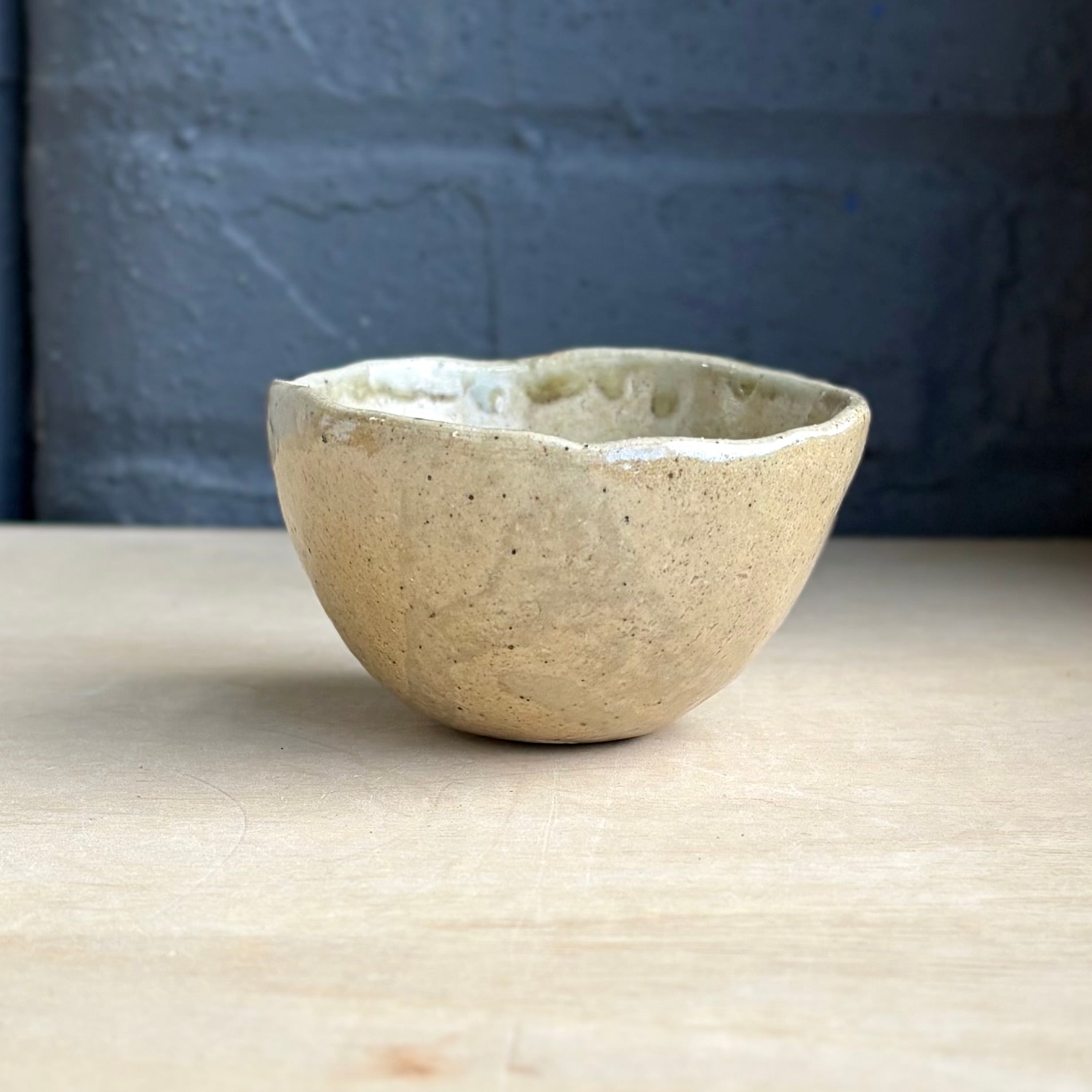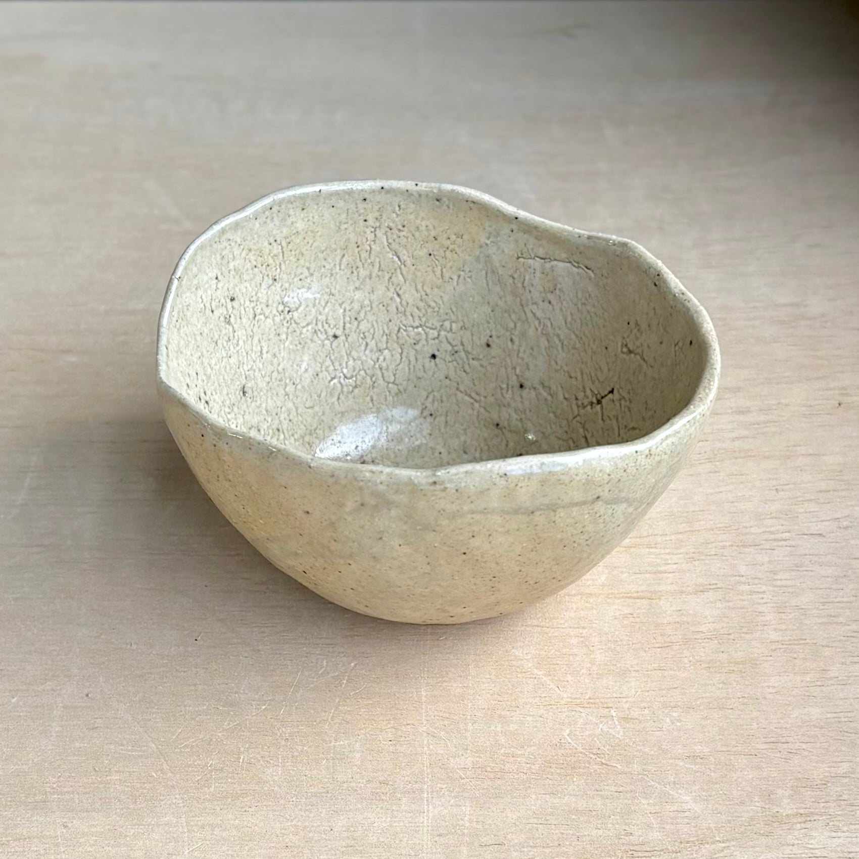 陶芸家 アンディ・ヴロック (Andy Vlock) によるこの萩焼(はぎやき)小鉢は、薪窯焼成による手作り陶器の繊細な美しさを表現した作品です。白色の陶土を用いて成形されており、他の小鉢よりも薄手で、軽やかで洗練された印象を持っています。