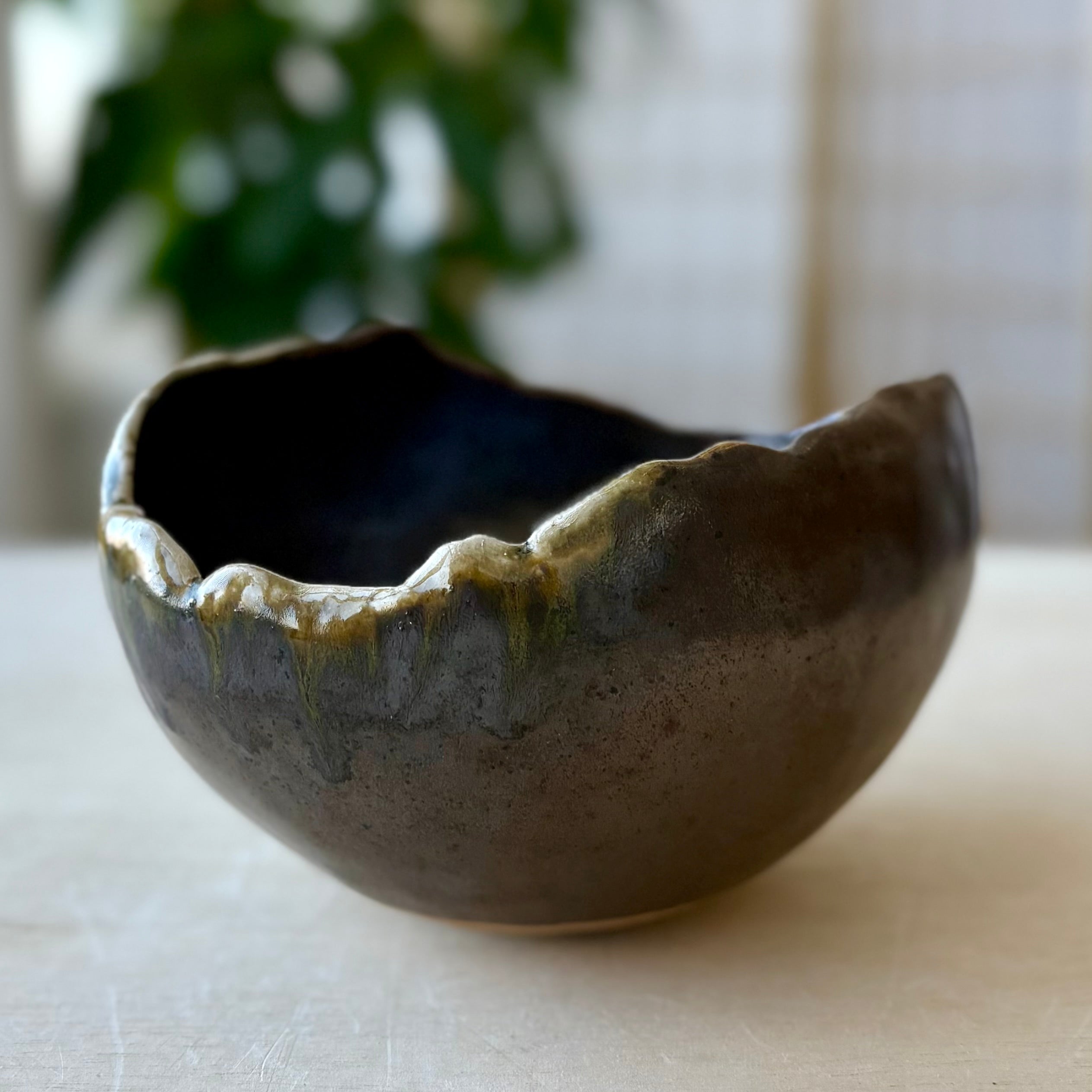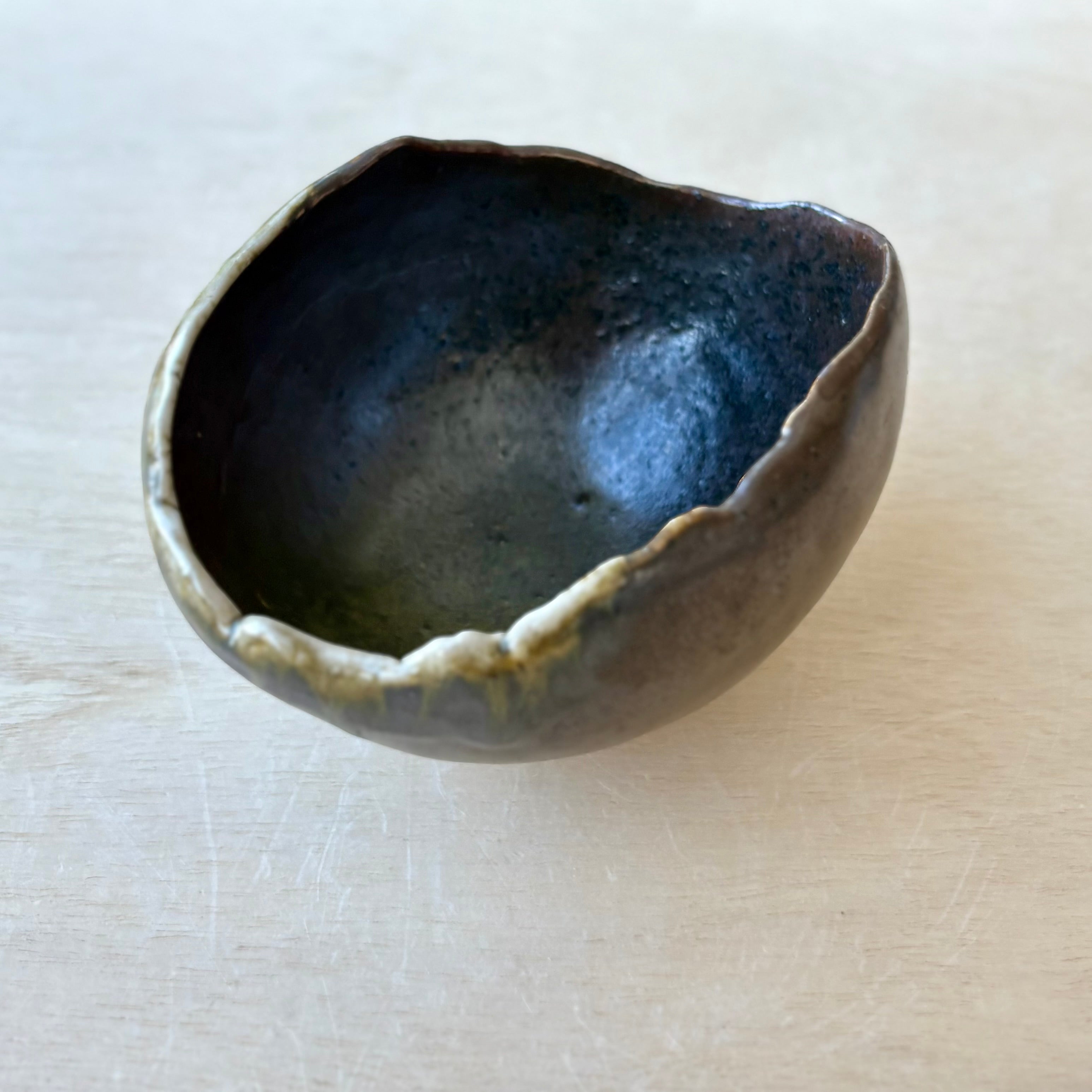 縁はあえて不均一に仕上げられており、緩やかな起伏が釉のハイライトを受け止め、視覚的にも触感的にも豊かな印象を与えます。器の下部は安定感があり、全体として静けさと動きが心地よく共存しています。