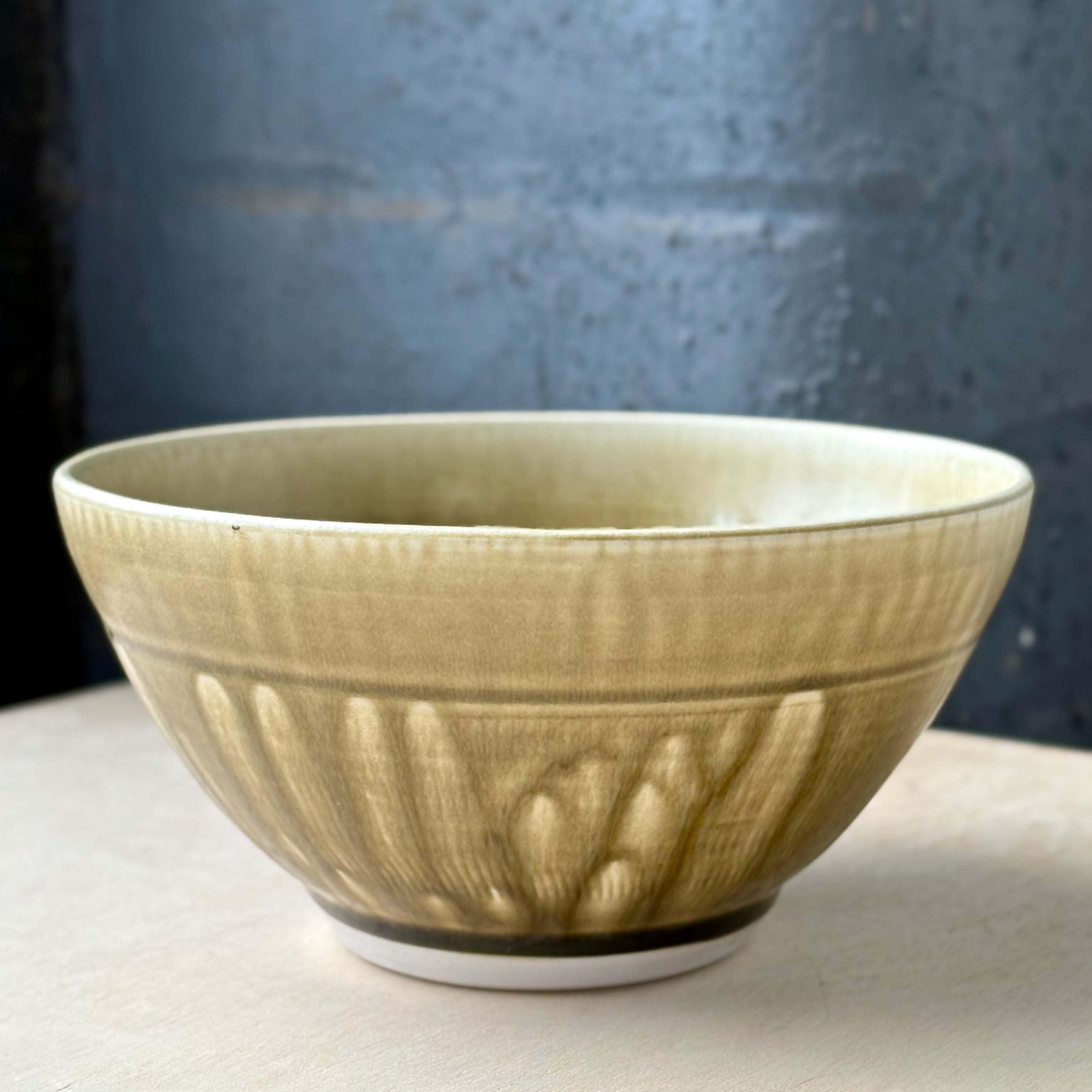 ガイ・マツダによるこの丼鉢は、木灰釉を施し、ガス窯で焼成された作品です。内外に施されたチャターマーク(装飾的な削り跡)の上を釉薬が流れ、リズミカルな質感の上に、柔らかなクリーム色、淡い金、温かなベージュが重なり合い、炎と道具の動きが器の表情をかたちづくっています。ろくろ成形によって作られた2点は、サイズと形はほぼ同じですが、焼成の自然な変化により、それぞれ異なる表情を持っています。丼物やそば、ラーメン、果物や雑穀の盛り付けにもぴったりです。食品使用可、電子レンジ・食洗機対応。
