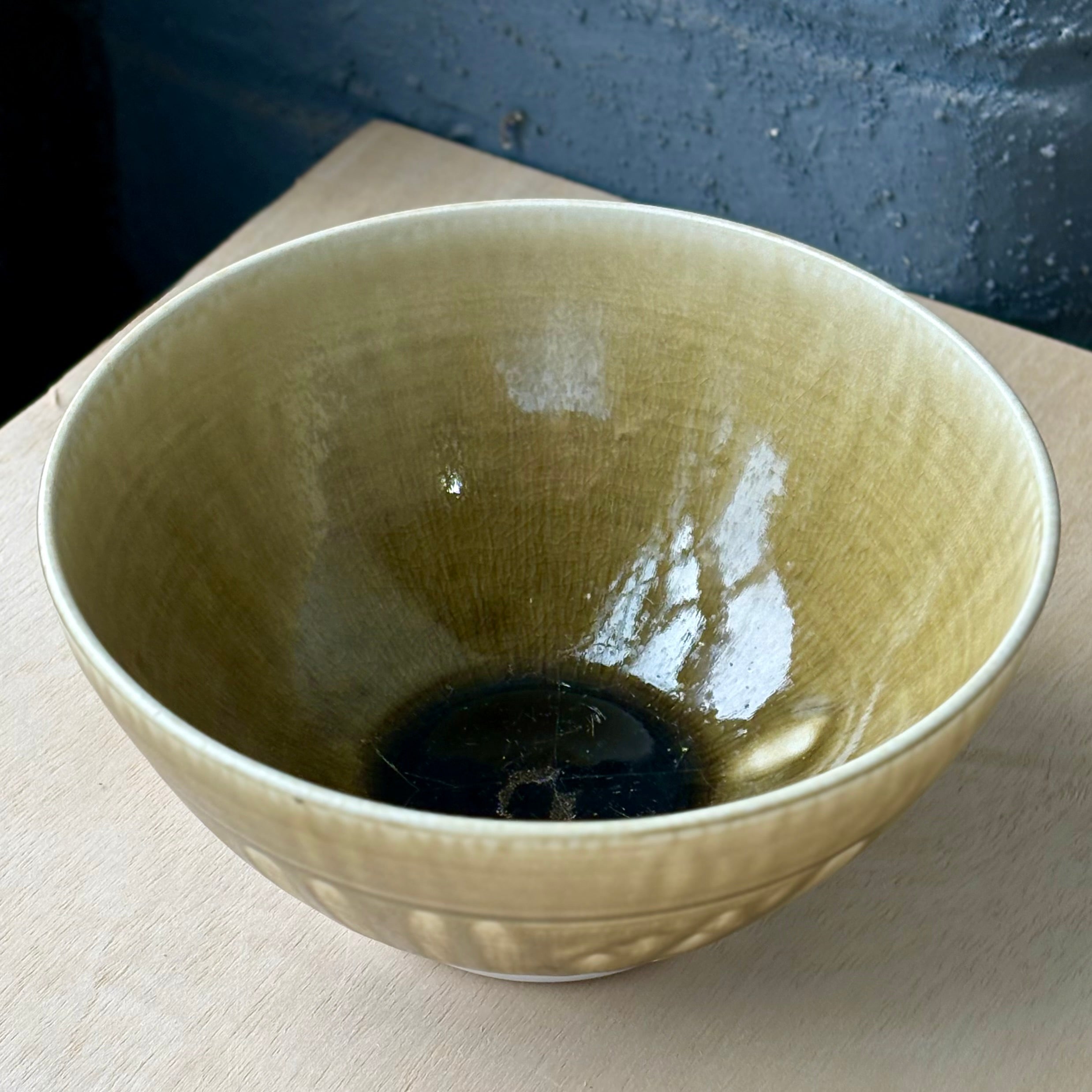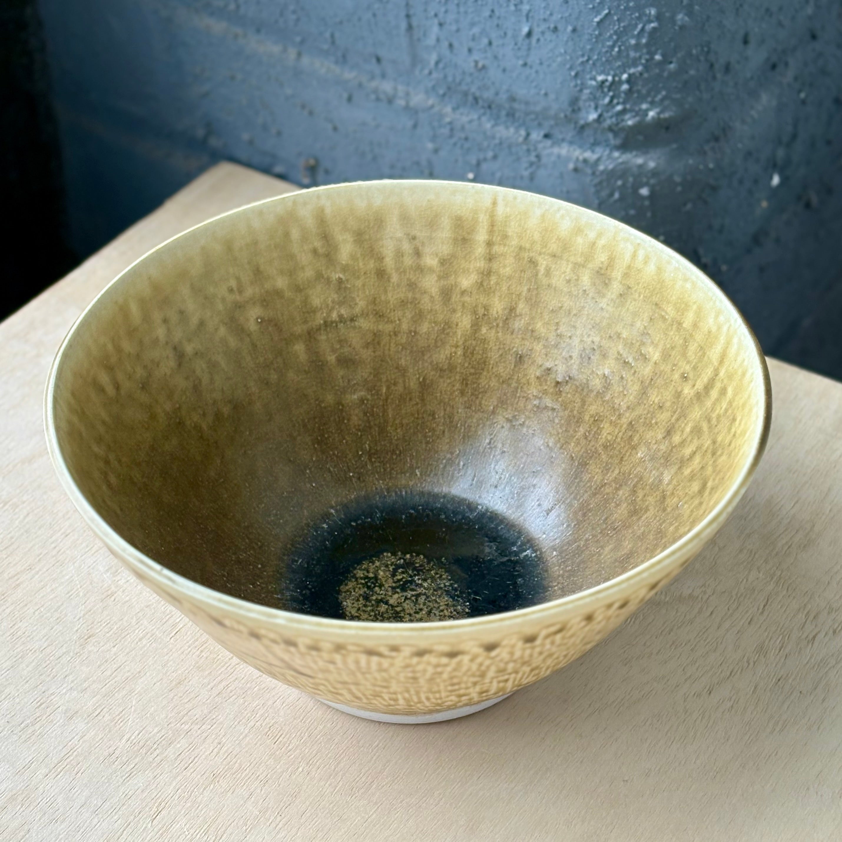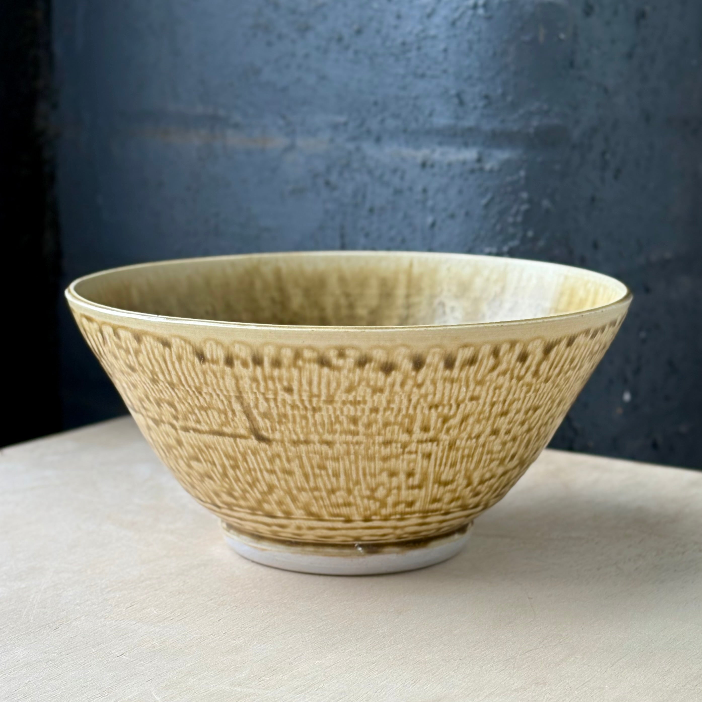 These donburi bowls by Guy Matsuda are glazed in wood ash and gas fired, with lively chatter marks circling the interior and exterior. The glaze pools and breaks over the rhythmic surface, revealing soft creams, pale golds, and warm beige tones shaped by flame and tool alike. Wheel-thrown and similar in size and proportion, each bowl is unique, with minor variations that reflect the natural flow of making. Perfect for donburi, soba, ramen, or generous servings of fruit or grains. Food safe, microwave safe, and dishwasher safe.