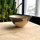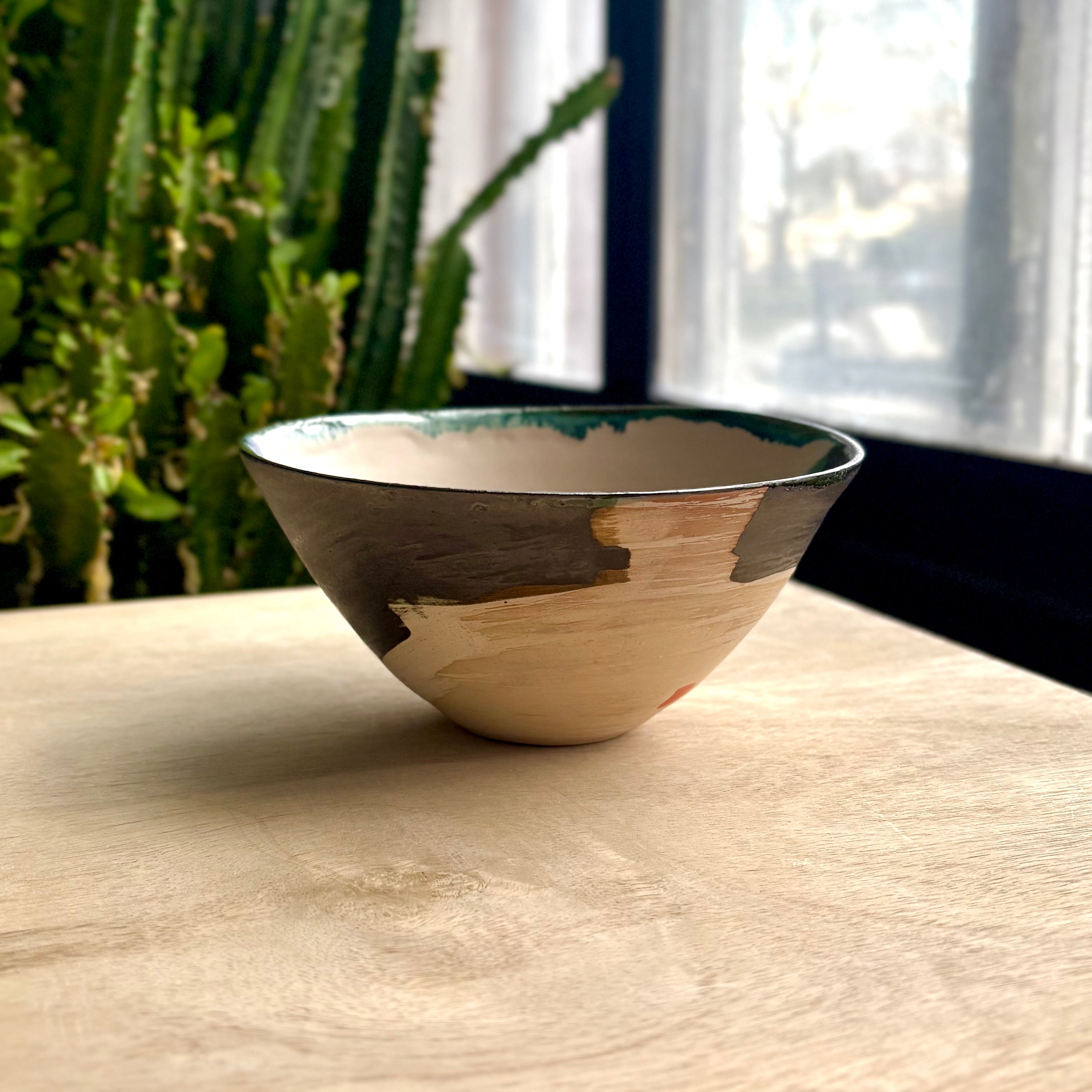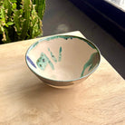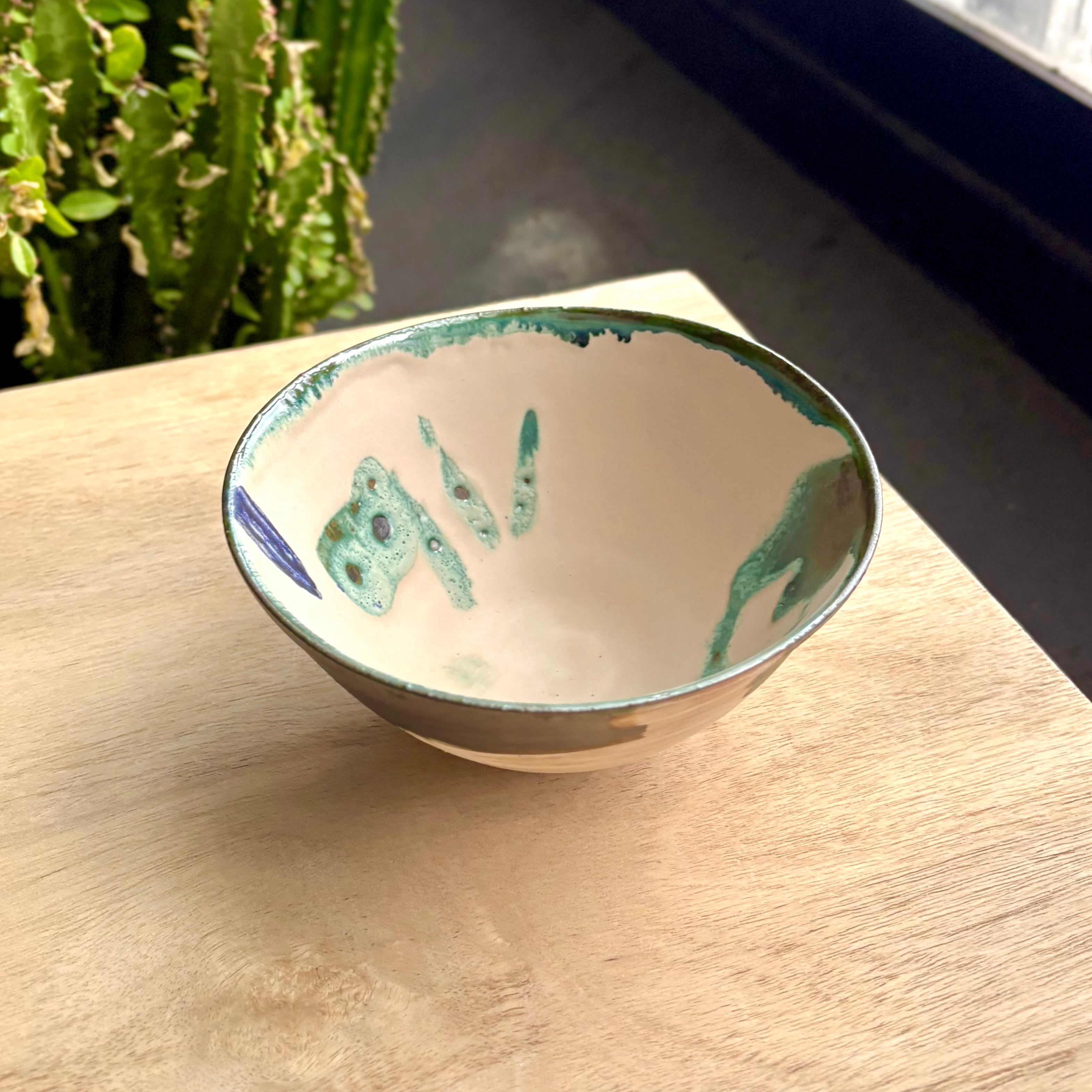 ジュリ・カークによる手作りの中鉢。テラシギラタと釉薬を何層にも重ね、電気窯で複数回焼成することで、偶然と意図が溶け合う絵画的な表情を生み出しています。内側には柔らかな緑と青の流れ、外側には土の温もりがわずかにのぞく穏やかな仕上がり。日常の器としても、静かな飾りの器としても楽しめます。
