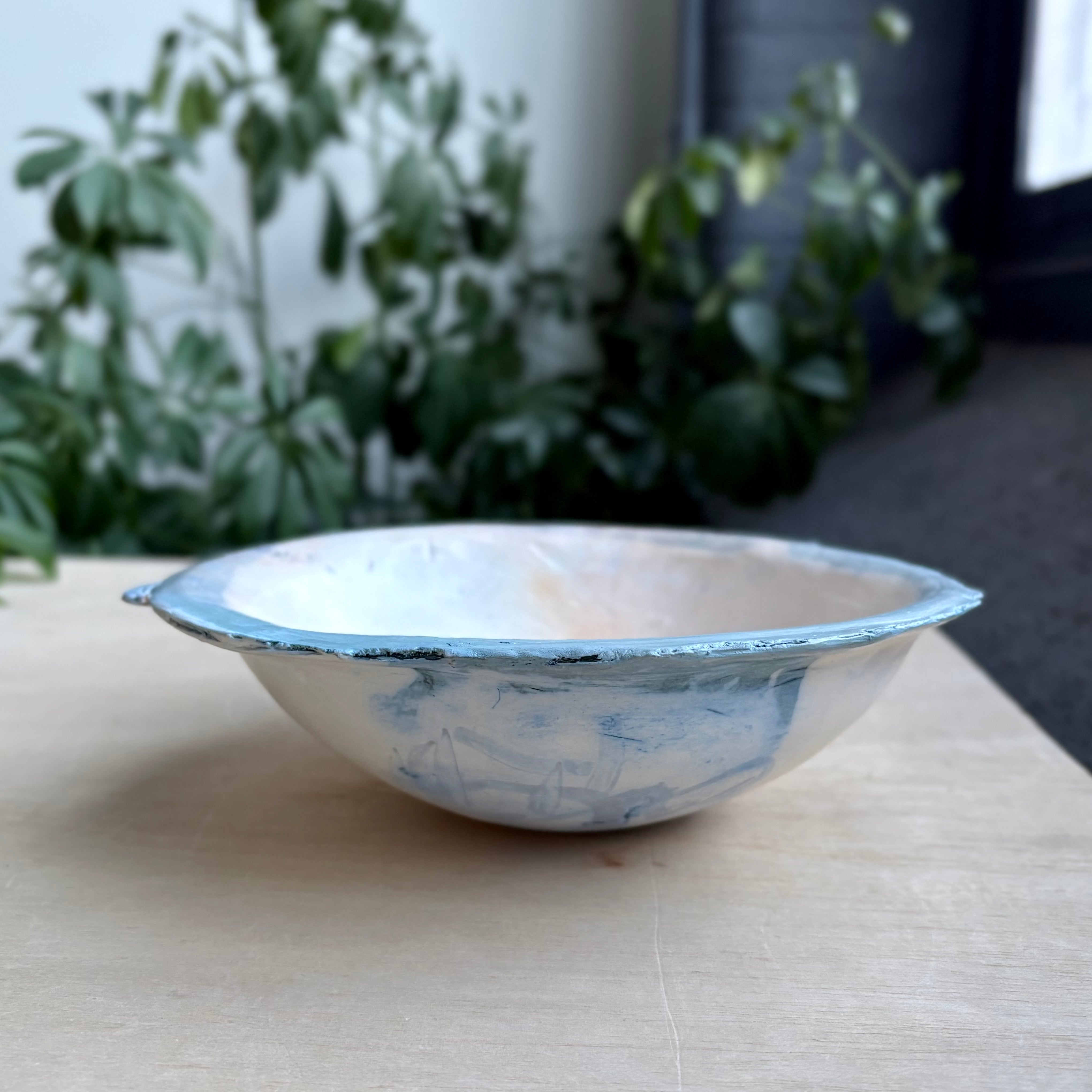 Juli Kirkによるミディアムサイズのボウル。電気窯で焼成されたストーンウェアにテラシジラータを施し、コバルト酸化物によって奥行きのある表情が加えられています。なめらかな質感と穏やかな色の揺らぎが、落ち着きのある中にも静かな動きを感じさせます。