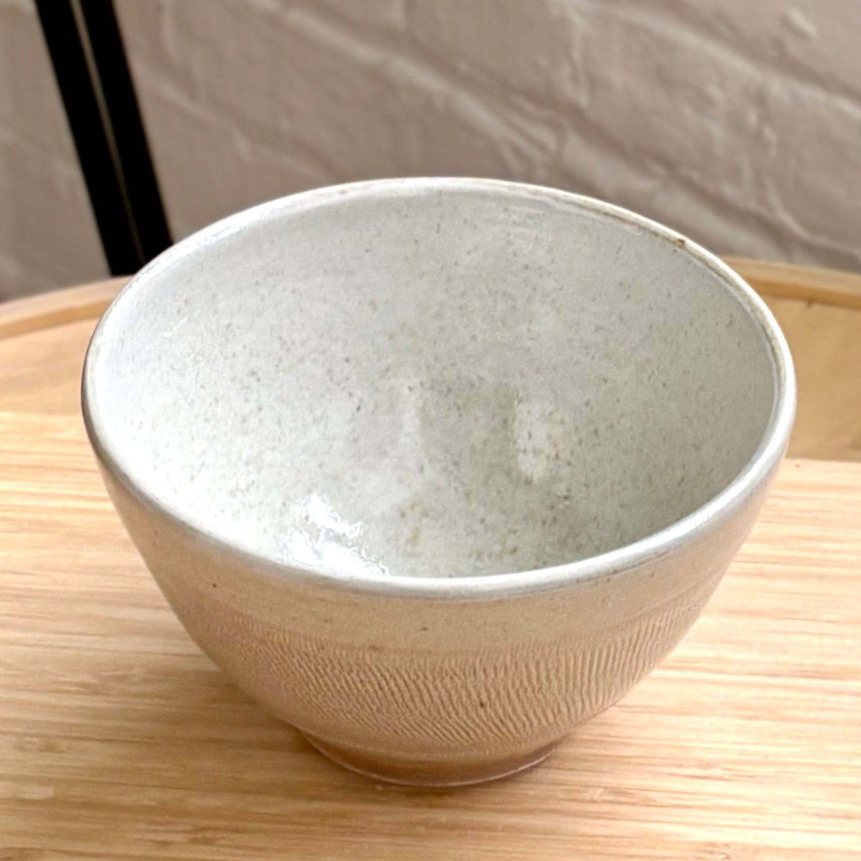 Guy Matsudaによるどんぶり鉢。ストーンウェアを轆轤成形し、外側は釉薬をかけずに薪窯で焼成。柔らかな炎の景色と繊細なチャターマークが表情を生み出しています。内側は青磁釉が施され、淡い緑が静かな奥行きを感じさせます。高さ約9.5cm、口径約15cm、底径約7.5cm。丼ものや麺料理、たっぷりのサラダにもぴったりのサイズです。