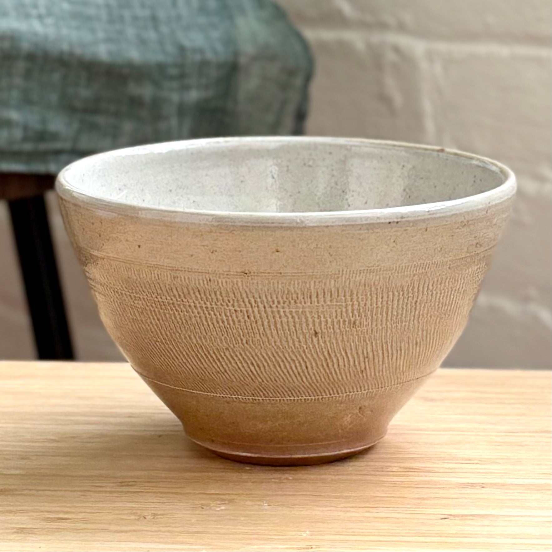 A beautifully balanced donburi bowl by Guy Matsuda, wheel-thrown from stoneware and wood fired. The exterior is left unglazed, showcasing soft flame blushes and fine chatter marks that invite the touch. Inside, a smooth celadon glaze pools into gentle greens, offering contrast and quiet depth. At 3.75” high with a 6” rim and 3” foot, it’s ideal for rice bowls, noodle dishes, or generous salads.