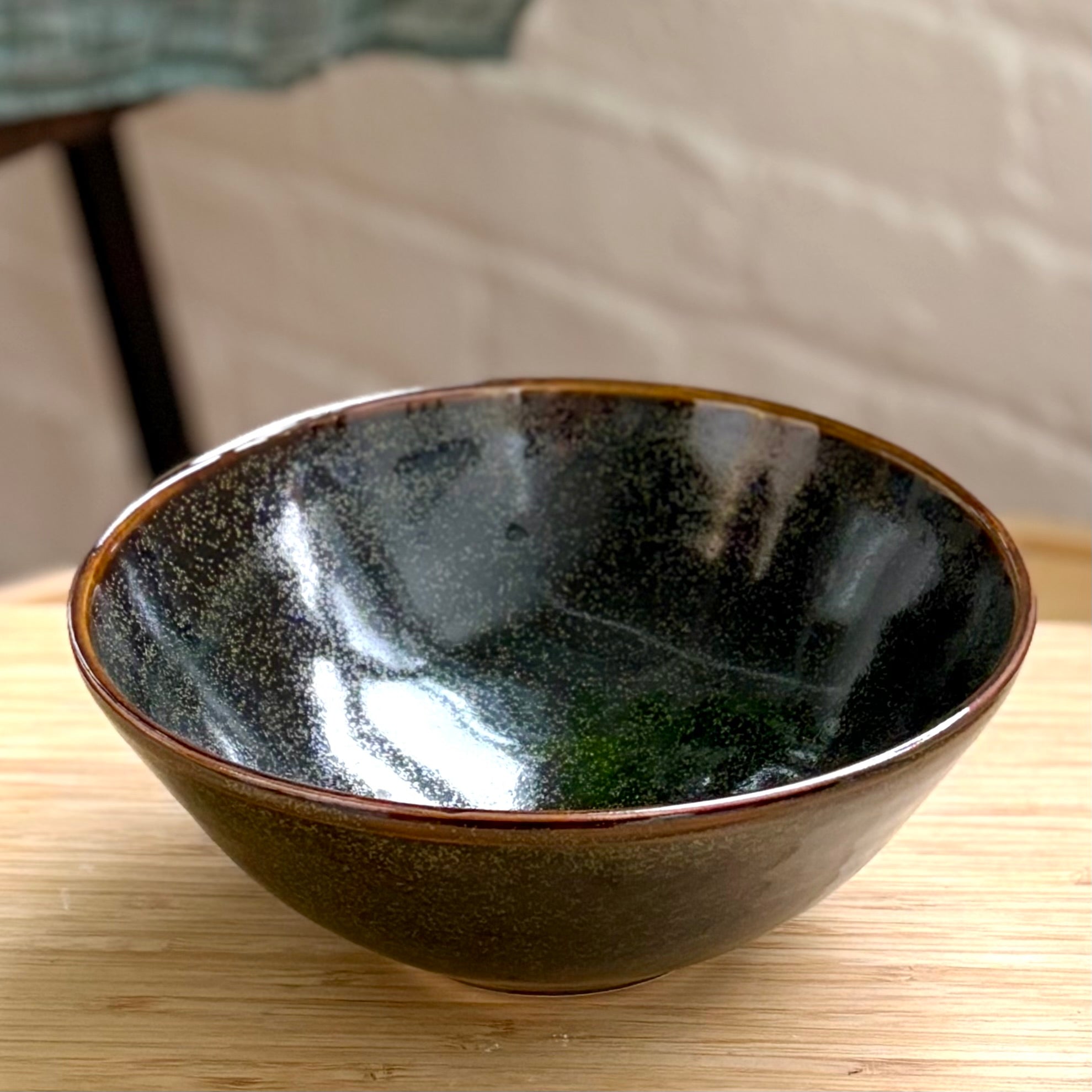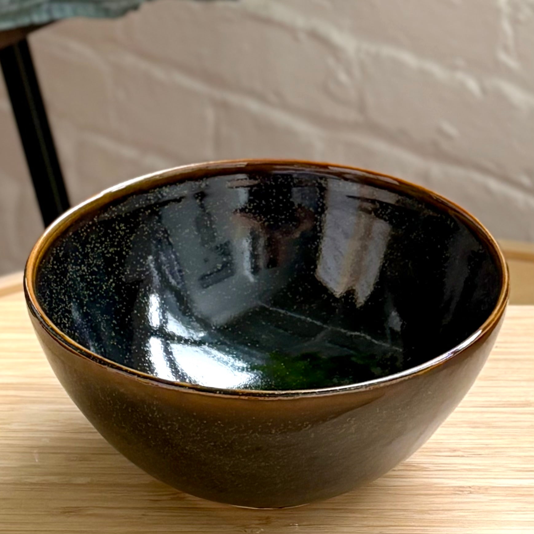 Guy Matsudaによる磁器製の丼鉢。ガス窯で焼成され、黒のティーダスト釉が施されており、光の角度によって金や緑の細かな粒子が浮かび上がります。釉薬が縁ではやや薄く、底では深くたまり、赤みを帯びた縁が全体を引き締めています。高さ約9cm、口径約19cm、底径約8.5cm。ラーメンや丼ものなど、しっかりとした料理に最適です。