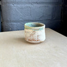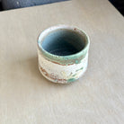 ジュリ・カークによる手作りのぐい呑み。ざらりとした質感に、白いスリップと淡い緑の釉薬が重なり、まるで風にさらされた壁や苔むした石のような表情を見せてくれます。フォルムや釉薬の揺らぎには、作り手の感覚と手の動きがそのまま息づいています。日本酒や少量の飲み物に最適。食品安全で、電子レンジ・食洗機にも対応しています。