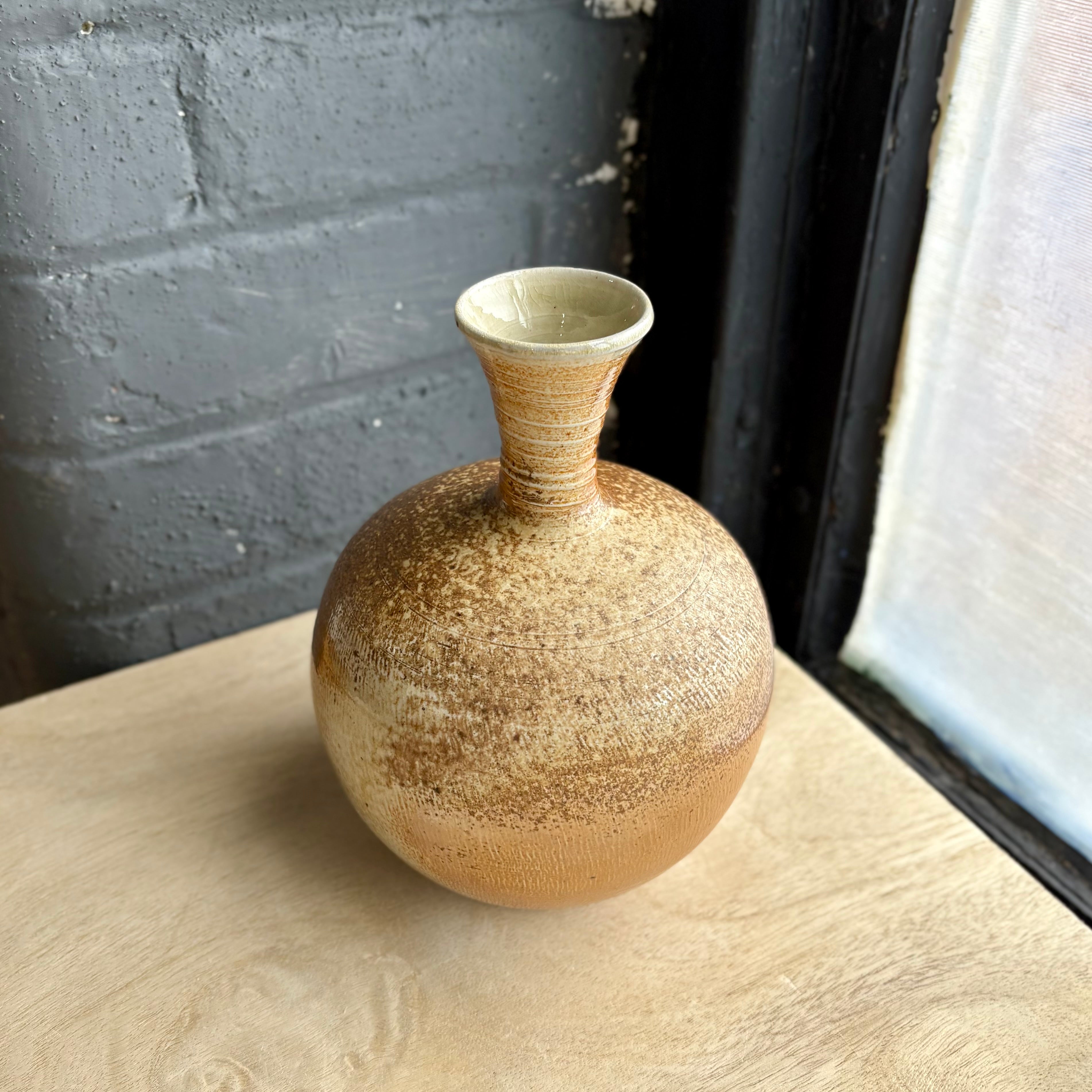 The interior is glazed, allowing it to hold water for flowers. The flared neck lends itself to slightly more open arrangements—small clusters of stems or a few loosely gathered branches—while the form itself holds a quiet presence when unadorned.