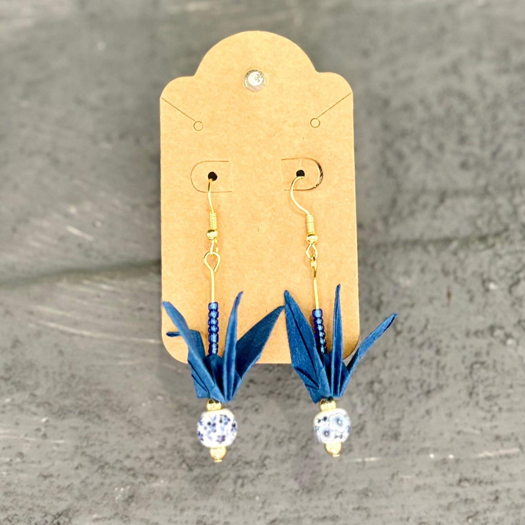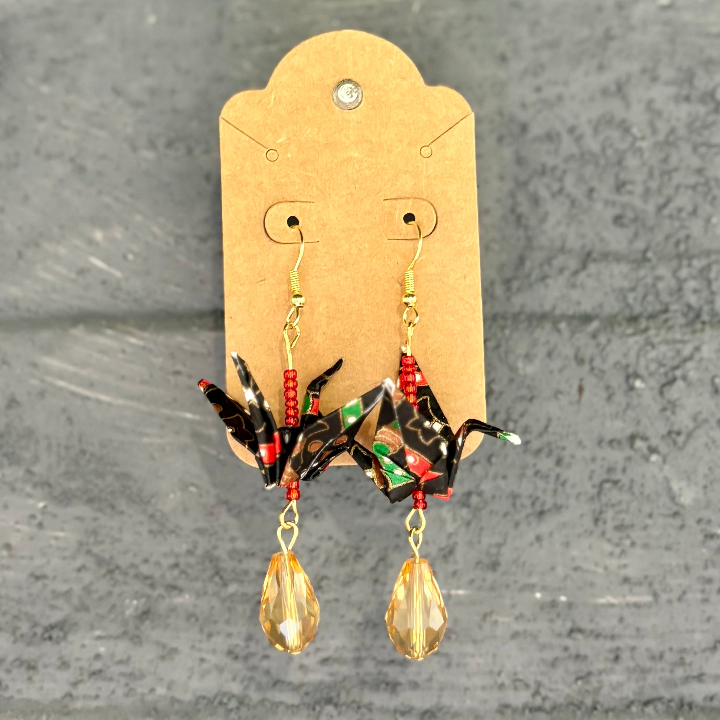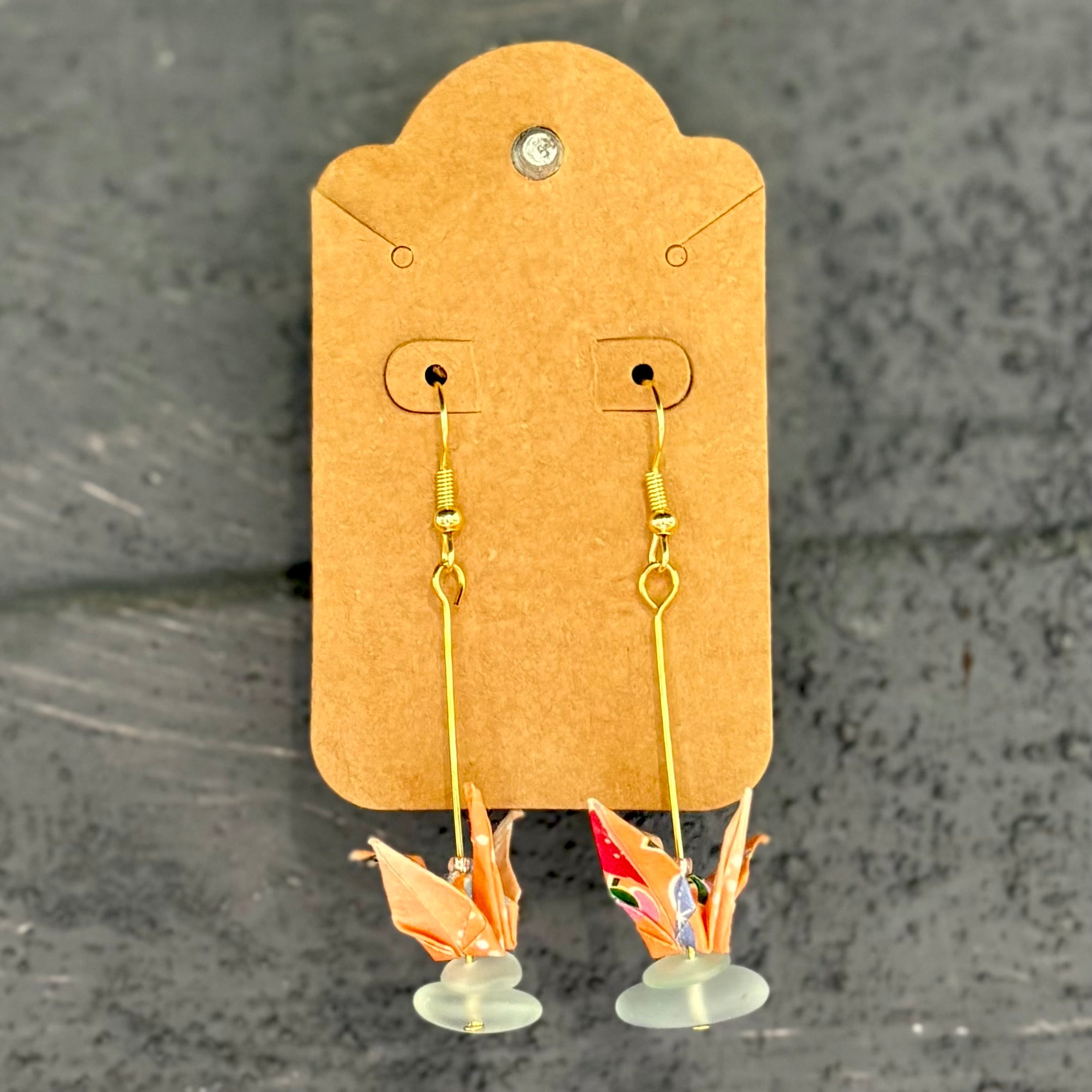 Delicate, joyful, and full of grace, these origami crane earrings are handmade by Liana Rice using traditional washi paper and glass or metal bead accents. Each pair features its own color palette and unique details—some with suspended cranes, some double-tiered, some with sea glass bases or vibrant beads. Liana, the daughter of longtime Hashi artist Akemi, carries on the spirit of care and craft with her own expressive touch. Lightweight and full of motion, they make lovely gifts or personal treasures.
