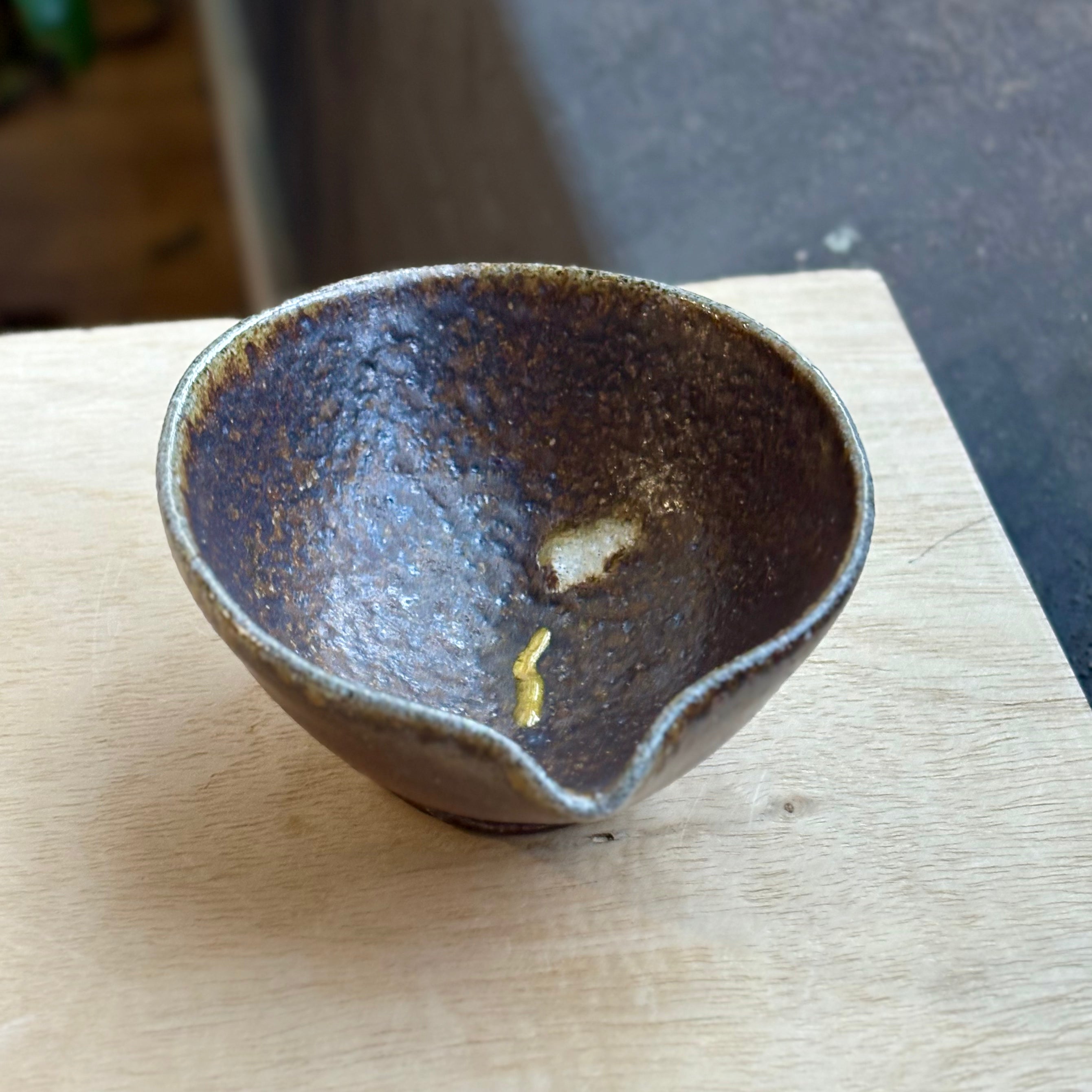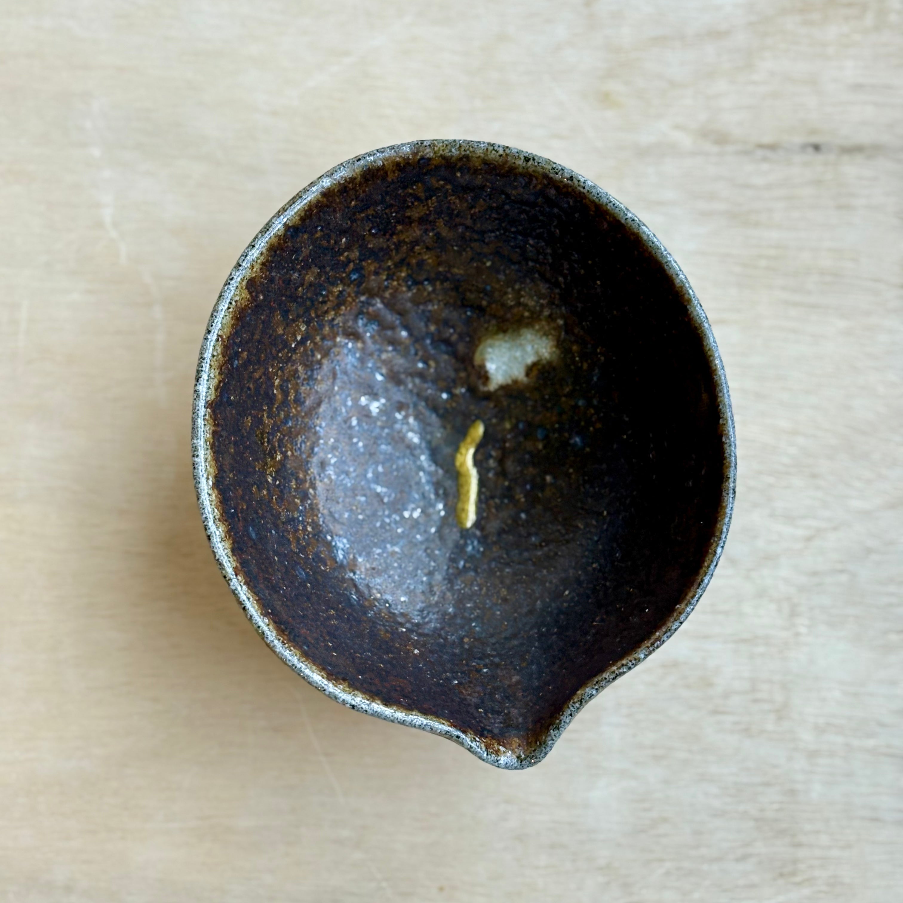Handmade by Brandon Hale and wood fired for rich variation and depth, this small katakuchi features a warm shino glaze that gathers light across its textured surface. The piece arrived with a break during transit and has been repaired in-house using a contemporary kintsugi-inspired method with linseed resin and metallic mica. The visible join adds a subtle note of continuity while preserving the quiet character of the form.