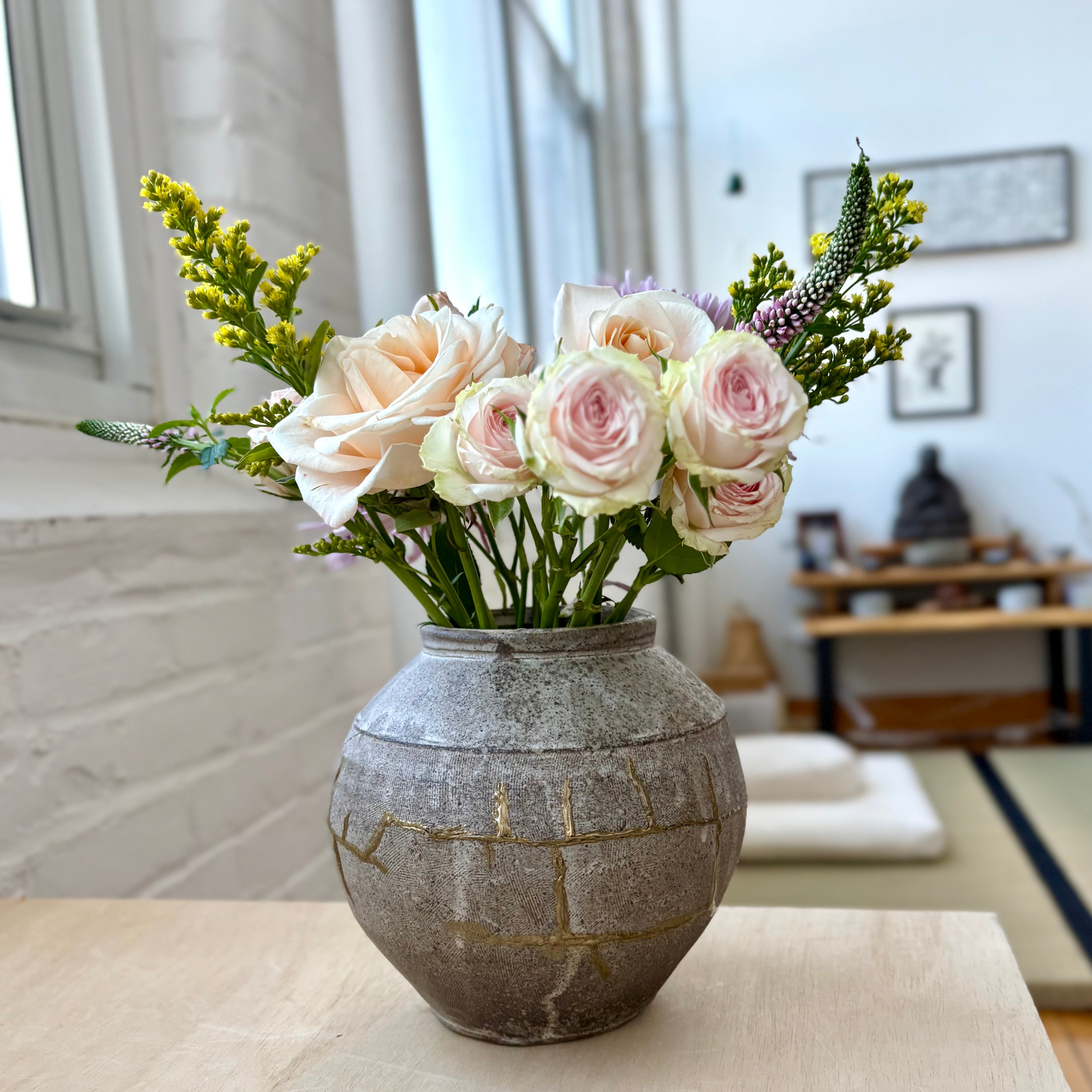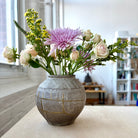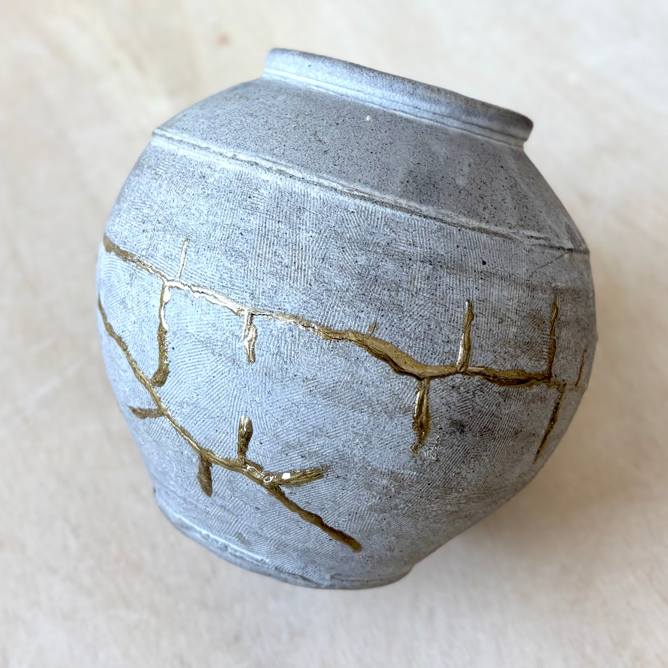 The vase arrived with superficial exterior hairline cracks that did not penetrate the form. These were carefully repaired in-house using a contemporary kintsugi-inspired method with linseed resin and metallic mica. The golden lines remain intentionally visible, tracing the vessel’s history while reinforcing its structure without altering its function.