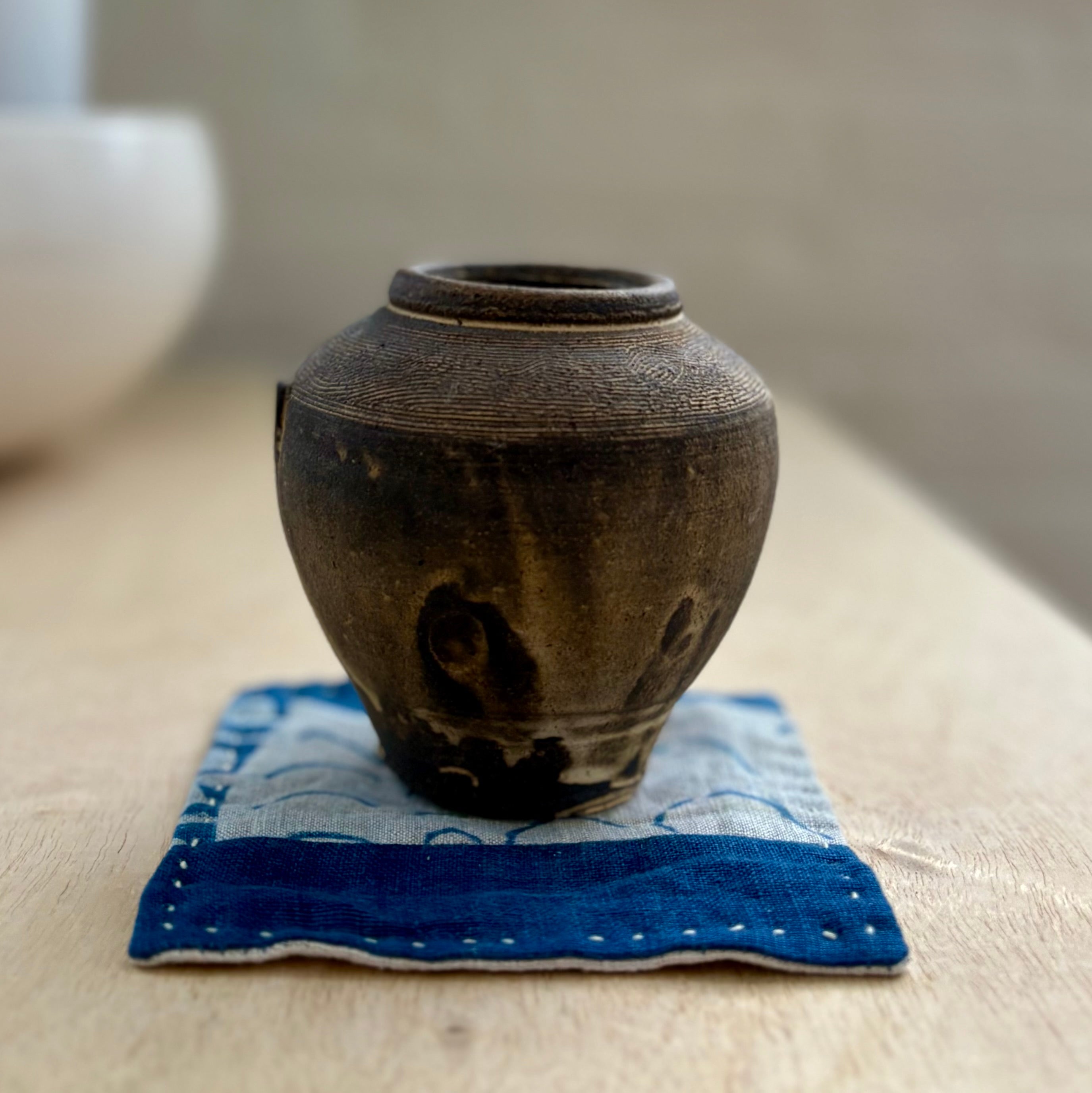 The softly rounded vessel is well suited for a single stem or small floral arrangement, and also stands comfortably on its own as a sculptural object. Measuring approximately 3.75” high and 4” in diameter, it carries its own mended history while remaining fully functional. Food safe, microwave safe, and dishwasher safe.