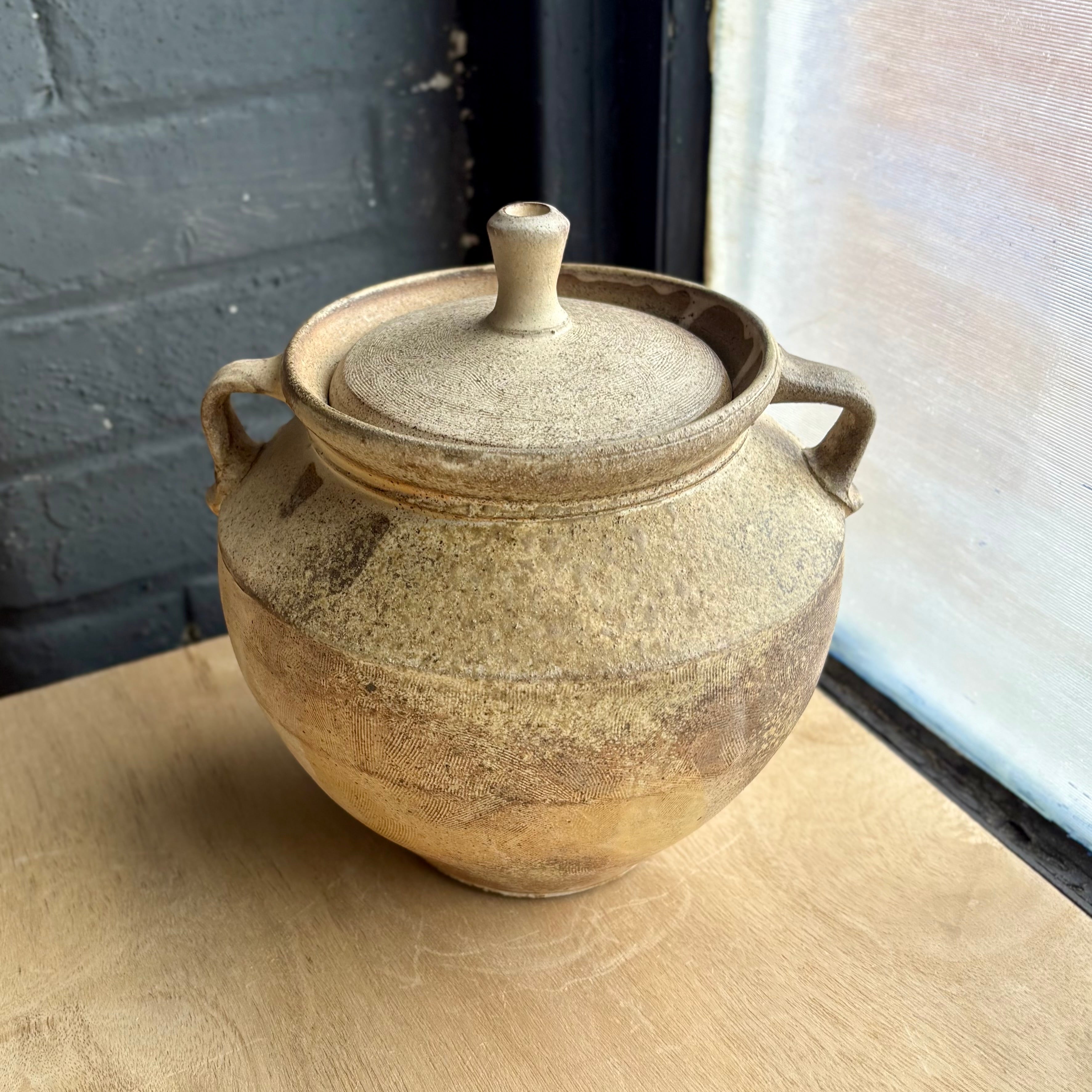バーモント州の陶芸家 Silene DeCiucies による薪窯焼成のストーンウェア蓋物。ろくろ成形の器体にカオリンの化粧土を施し、薪窯の炎と自然に降りかかる灰の作用によって、柔らかな灰色やクリーム色、温かみのある土の層が表面に現れています。一つ一つ異なる景色を持ち、薪窯ならではの深みと奥行きを感じさせます。安定感のある大らかなフォルムに、しっかりと収まる蓋が加わり、器としての完結した佇まいを備えています。高さ約19cm、直径約22cmで、茶葉や乾物、小物の収納にも、空間に静かに置かれるオブジェとしても適しています。食器用・電子レンジ対応・食洗機対応。