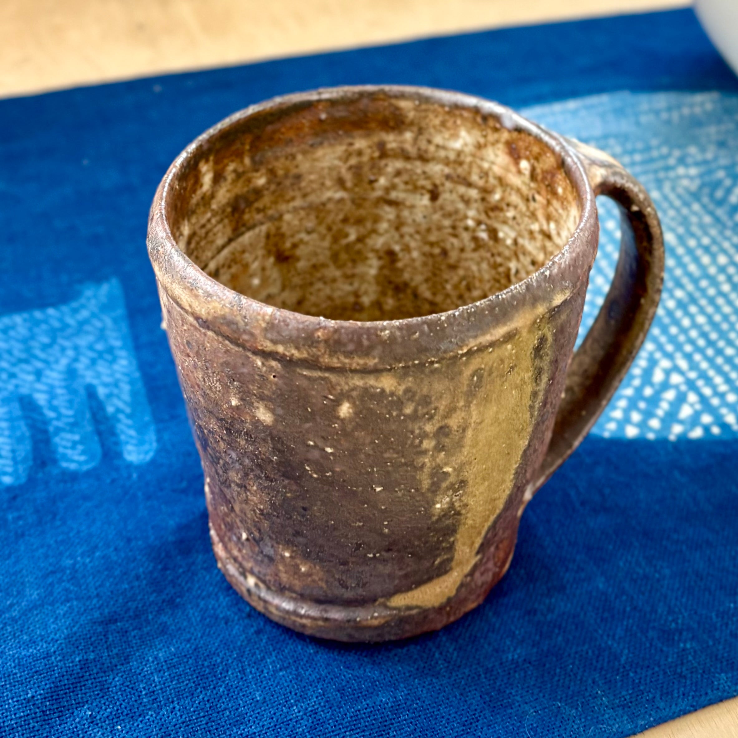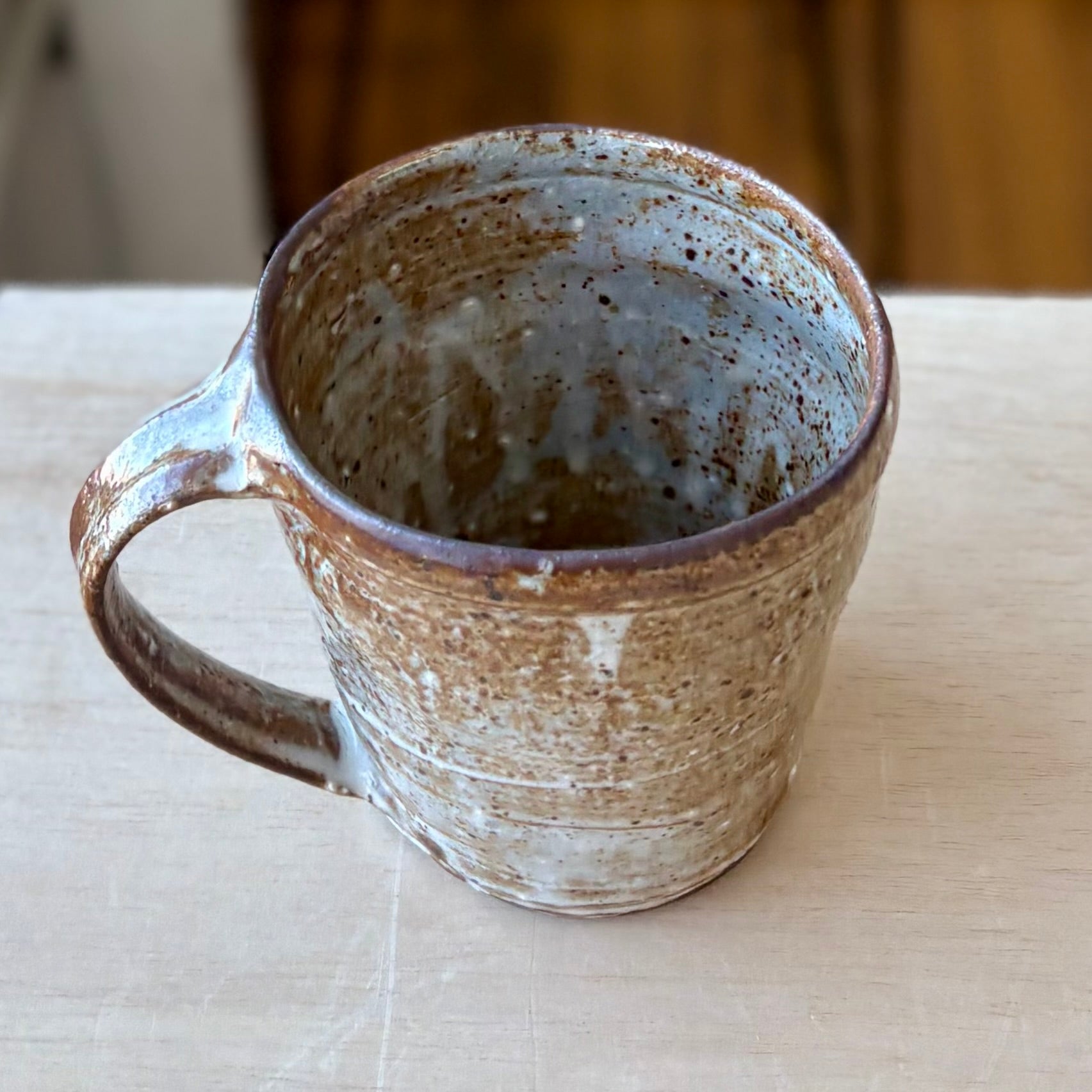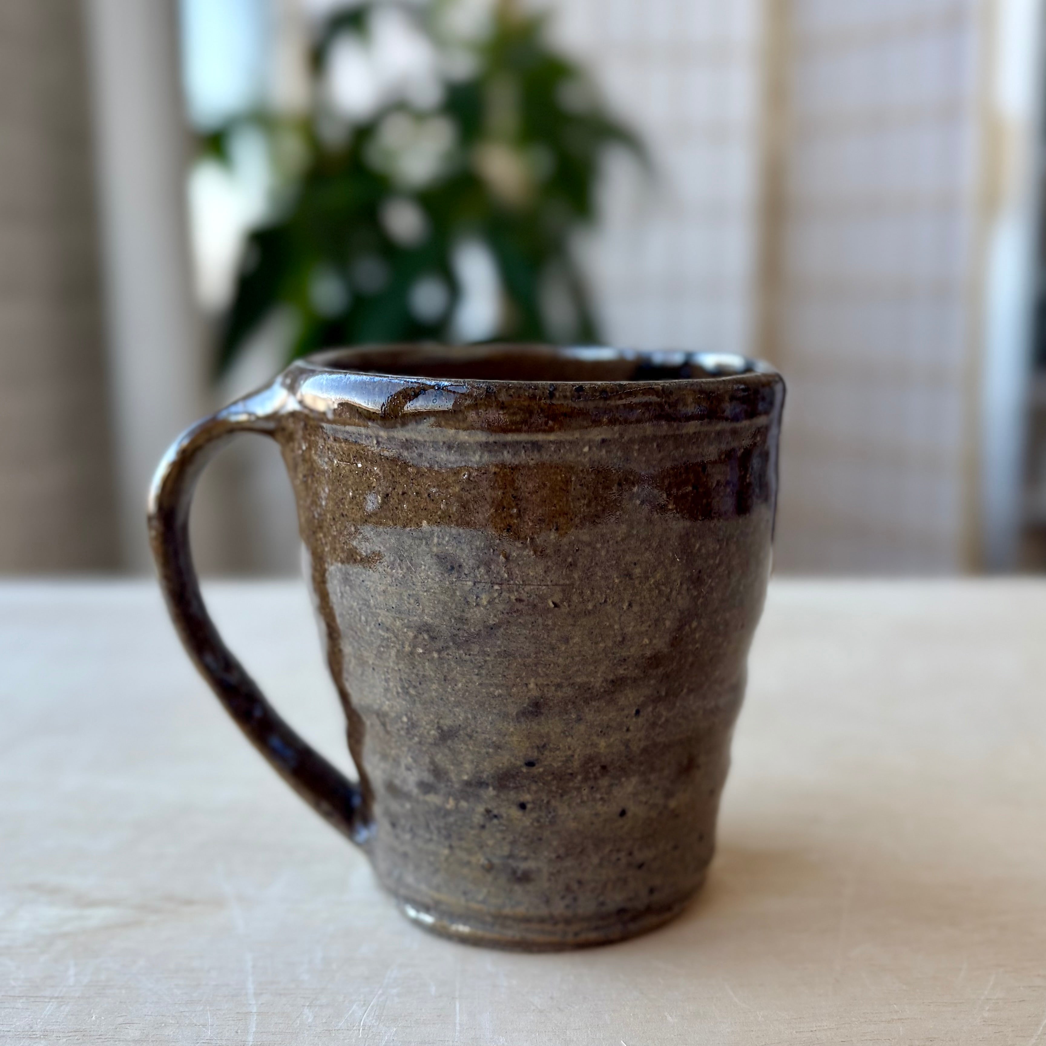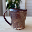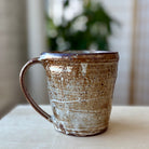 This handmade coffee mug by Andy Vlock is wheel-thrown and reduction fired, with each piece carrying its own distinct glaze character shaped by flame and atmosphere. Subtle shifts in color, texture, and surface depth emerge through the firing, giving each mug a quiet individuality while maintaining a shared form and scale.