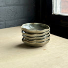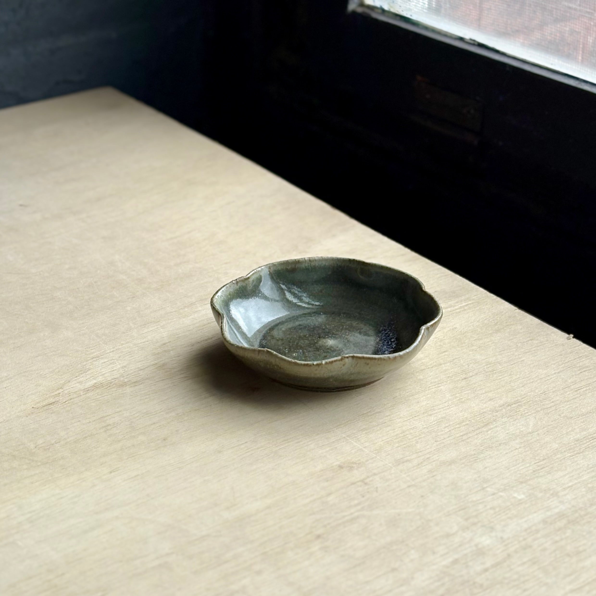 These hand-formed shoyuzara by Ayumi Nojiri are shaped like flowers slowly opening to the rain. Her homemade gray glaze flows in gentle rivulets of olive, gray, and blue, pooling in the center like a still puddle. Each dish is slightly different—irregular rims, shifting tones, delicate asymmetries—all part of Ayumi’s quiet, unhurried way of making.
