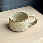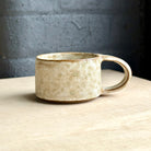 Wheel-thrown by Ayumi Nojiri, this coffee mug is full of tactile interest and quiet delight. Its softly speckled sea salt glaze creates a mottled, almost frothy surface—warm cream and pale green merging like shoreline foam. The rounded, generous handle echoes the curve of the form, making each sip feel unrushed and grounding. A mug for morning rituals and afternoon pauses alike.
