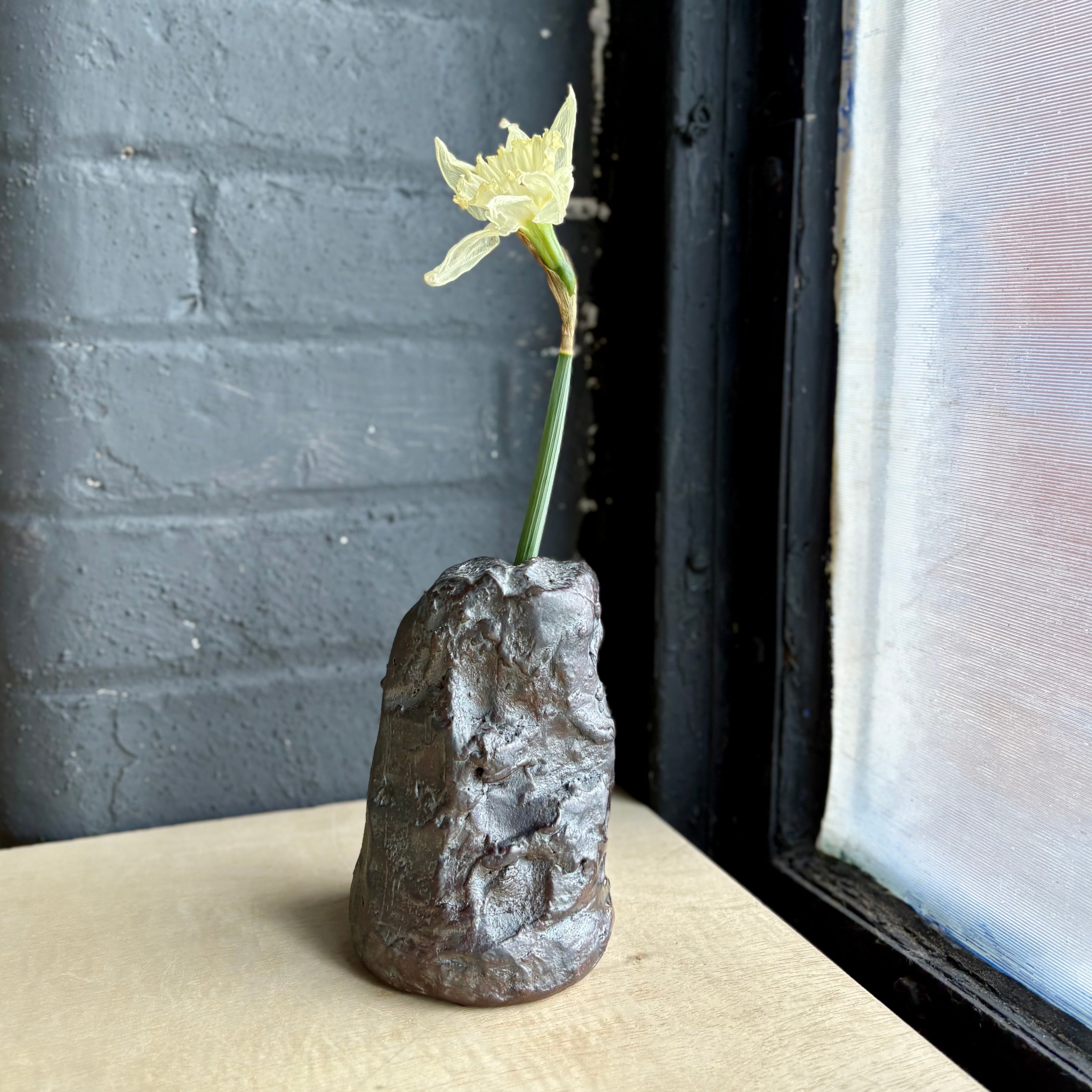 Brandon Haleによる手びねりの花器。塊の土を削り出して成形する「くり抜き(くりぬき)」技法により作られています。付け加えるのではなく削り出すことで形が現れ、どこか発見されたような、自然で静かな存在感を持ちます。