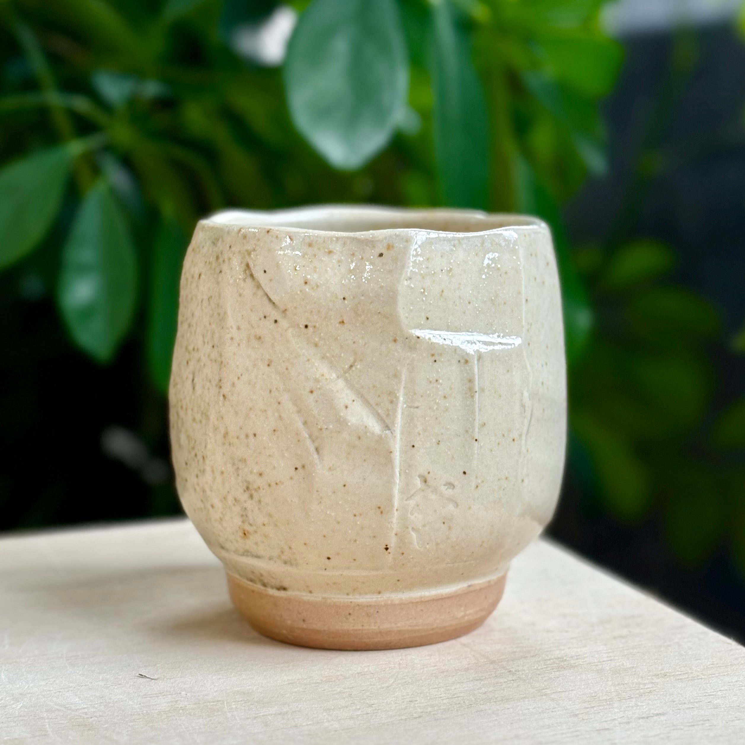 ガイ・マツダによるこの湯呑みは、静かで奥深い輝きを放ちます。薪窯焼成、糠釉に加えて薪灰が降りかかり、やわらかな白と透けるようなクリーム色の表情に、火の跡や自然な垂れが現れています。丸みのある形は手に安定して収まり、お茶やお酒、あるいは温かなひとときに寄り添います。釉薬、炎、土がひとつになって語りかける、控えめで光をたたえた一碗。食品使用可、電子レンジ・食洗機対応。