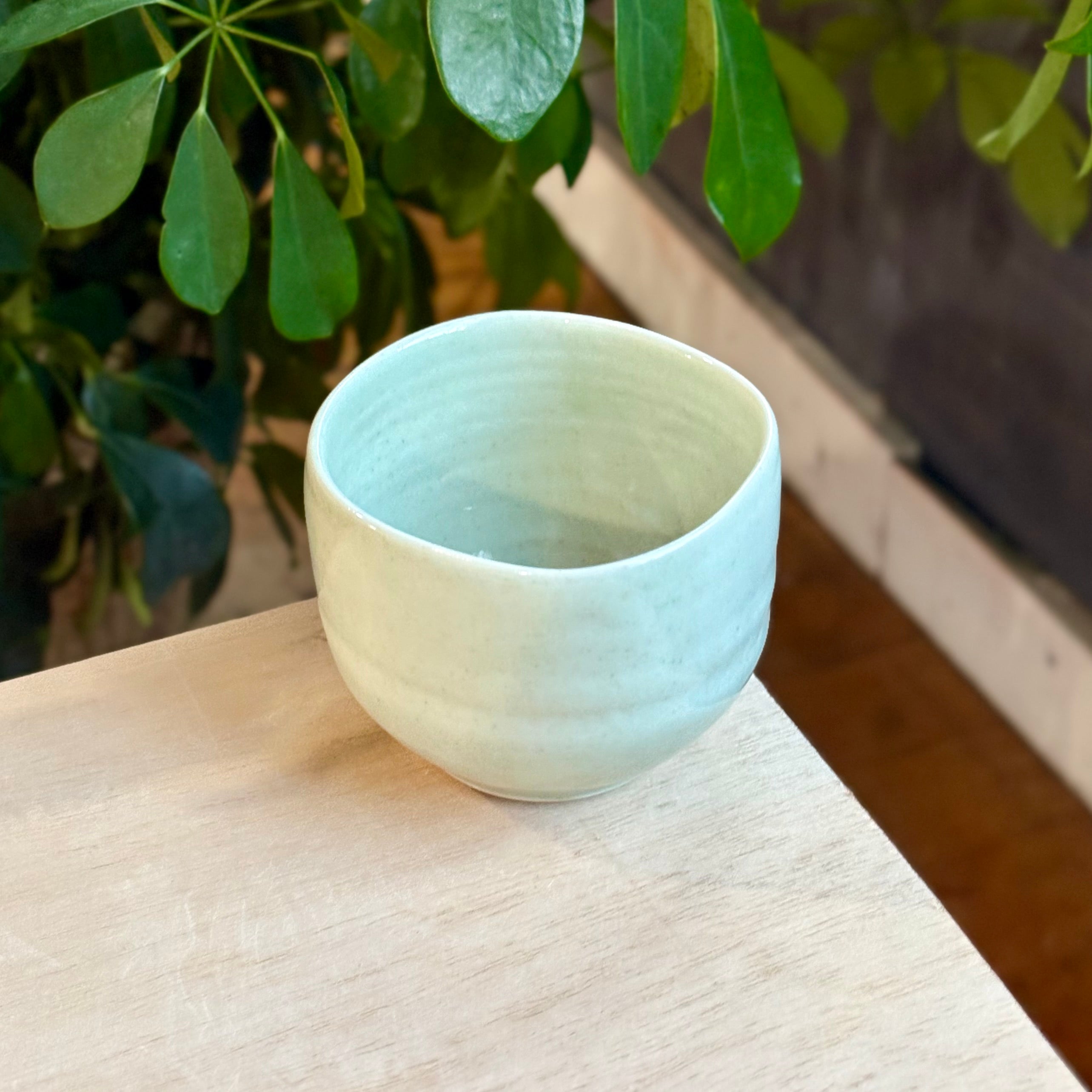 ガイ・マツダによるこの磁器のカップは、ガス窯で焼成され、やわらかな光沢を持つ青磁釉で仕上げられています。光を受けて水面のように輝き、縁や曲面に釉薬がたまり、美しい表情を見せます。ゆるやかに広がるフォルムは手に馴染み、お茶やお酒、スープやデザートにも最適です。