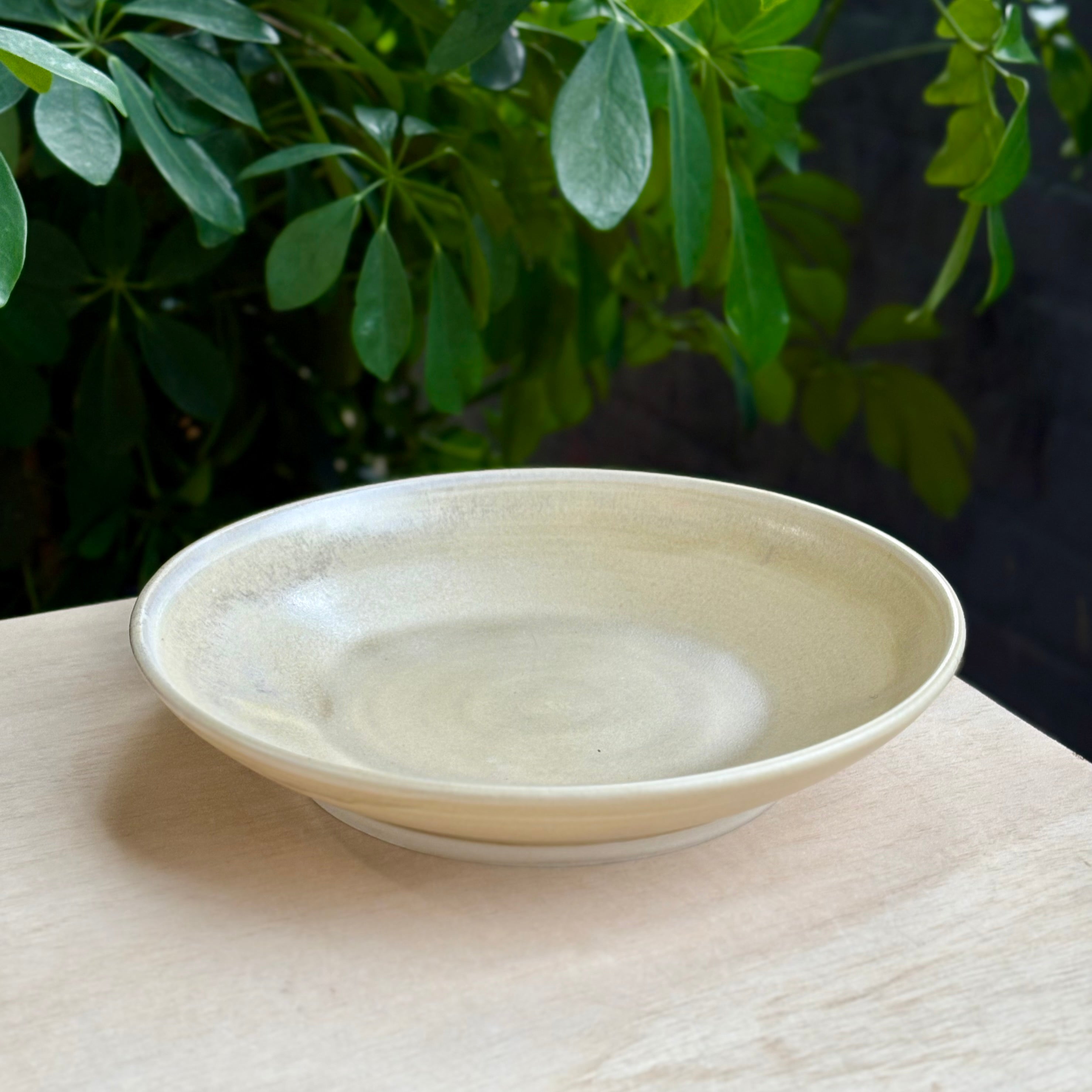 This porcelain dinner plate by Guy Matsuda is gas-fired and finished in a titanium glaze with a surface that shifts gently between pale grey, soft blue, and warm blush depending on the light. The proportions are generous without excess—elegant and restrained. A beautiful canvas for meals both simple and celebratory.