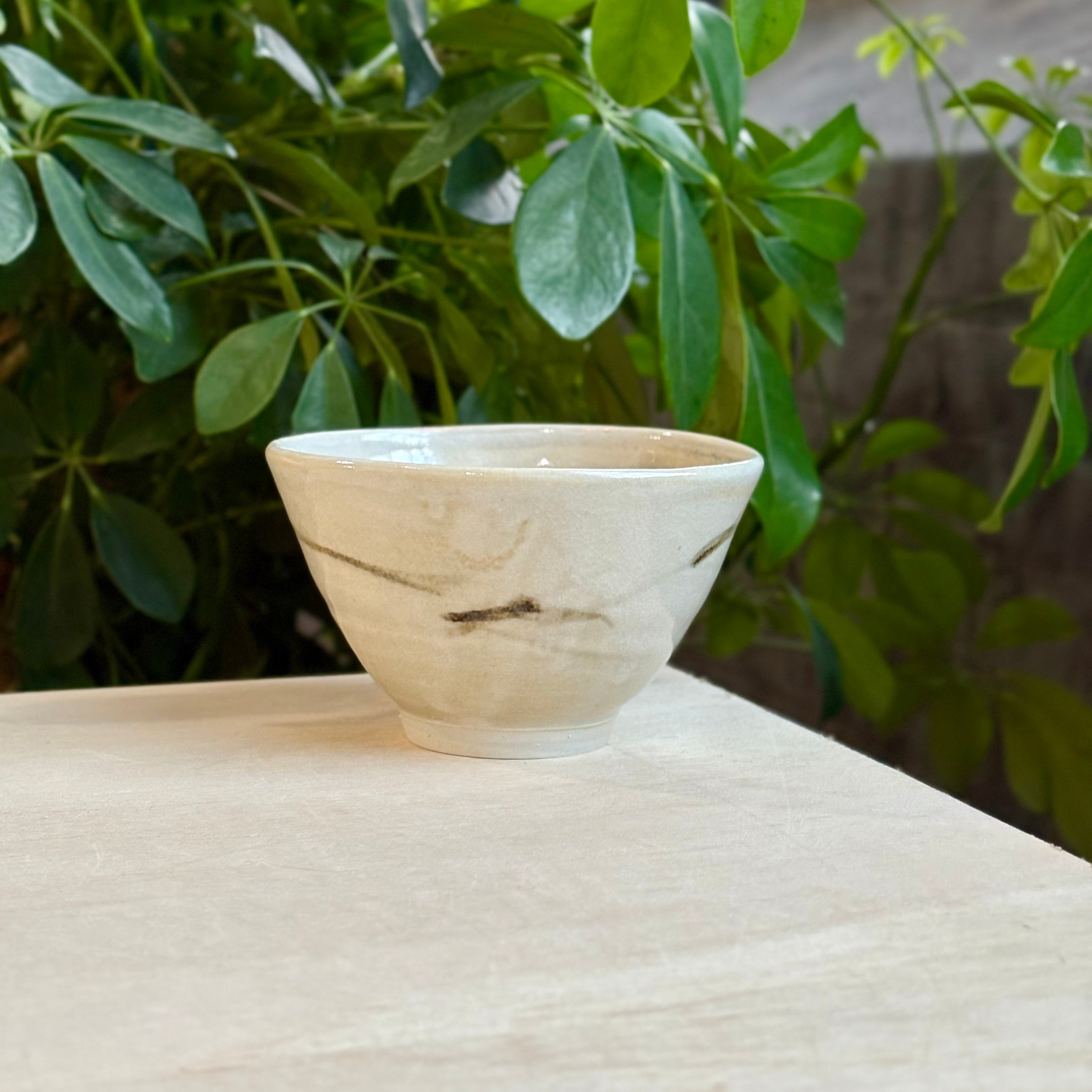 ガイ・マツダによるこの磁器のご飯茶碗は、ガス窯で焼成され、表情豊かな志野釉で仕上げられています。釉薬の流れや焼成の変化により、ひとつひとつに微妙な個体差があり、まったく同じものはありません。手に馴染む伝統的な形で、ご飯はもちろん、小さな食事やおやつにもぴったりです。