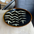 guy matsuda による磁器のサービングプレート。ガス焼成の青磁にワックスレジストを施し、その上から黒い tea dust 釉を重ねた、静かな奥行きを持つ一品です。浅い形状の上で青磁のやわらかな緑が広がり、tea dust が細かな黒の表情を添えています。ワックスレジストの帯が動きを生み、重なり合う釉薬の中に土のあたたかさが見え隠れします。