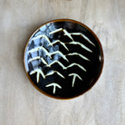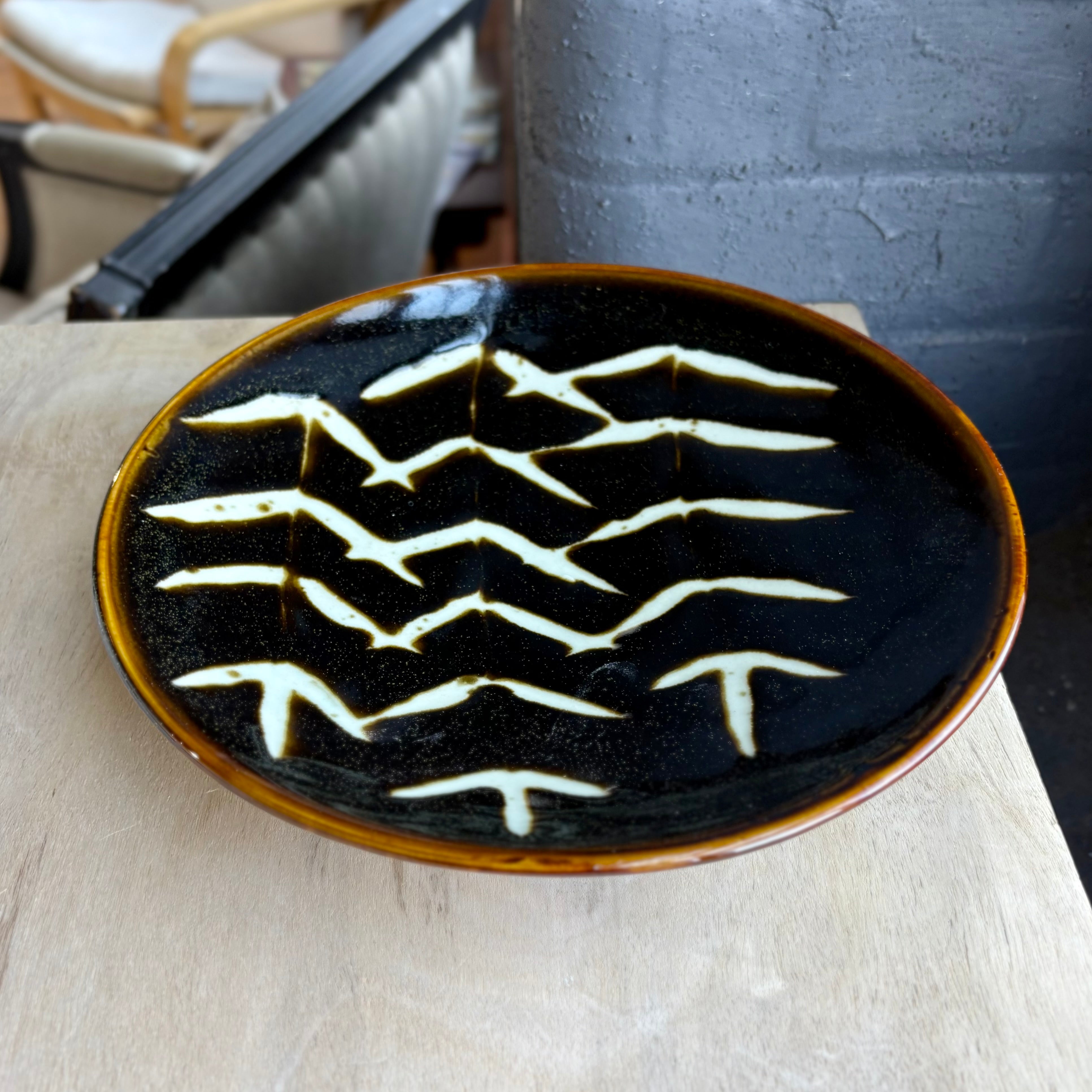 Wheel-thrown in porcelain by Guy Matsuda, this low, wide serving platter is gas-fired in celadon with a wax-resist band and an overlay of black tea-dust glaze. The celadon’s soft green transparency plays beautifully across the shallow form, while the tea dust adds a delicate constellation of dark flecks. The wax-resist pattern brings a subtle sense of motion and reveals the quiet warmth of the clay beneath.