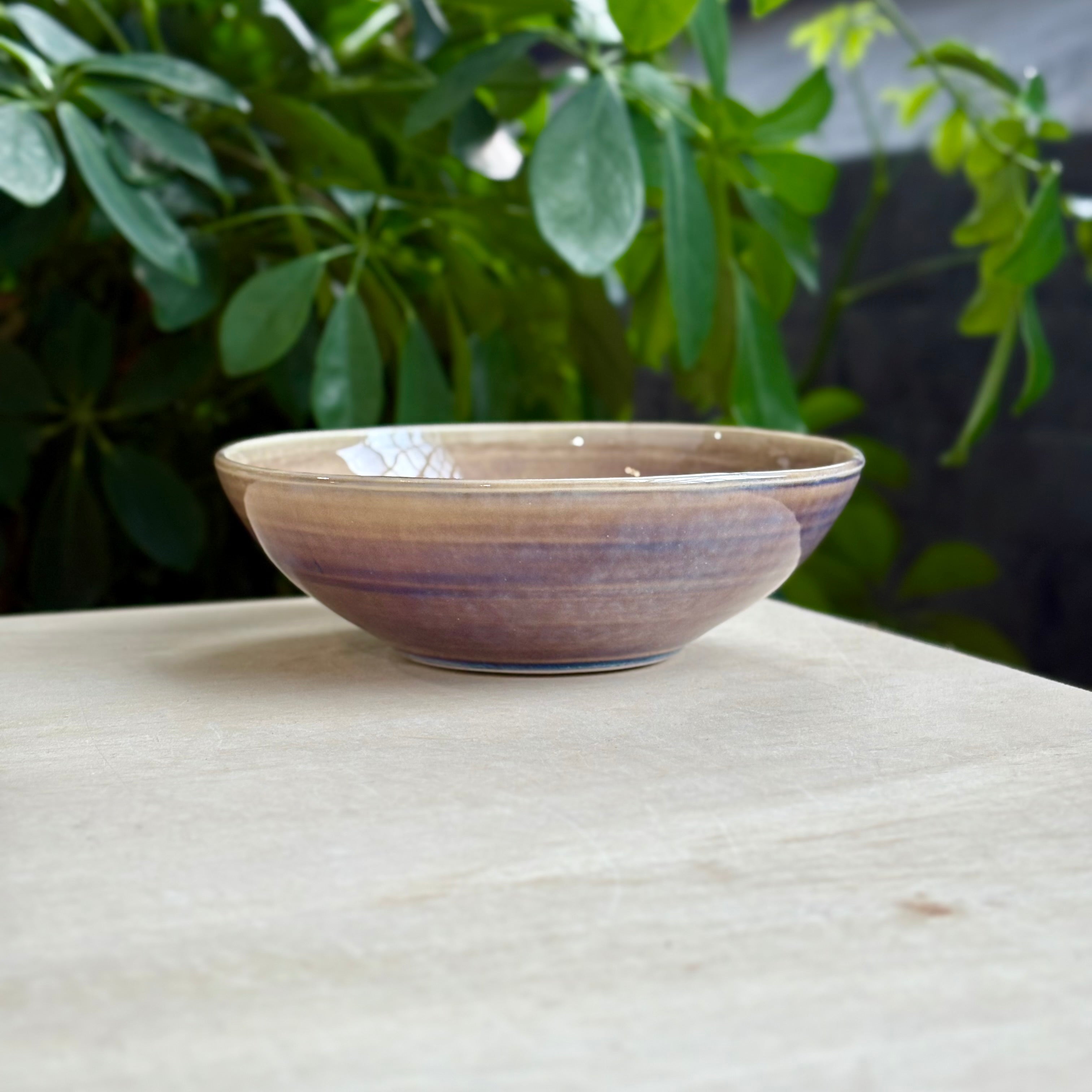 ガイ・マツダによるこの浅めの磁器の鉢は、ガス窯で焼成され、チタン釉で仕上げられています。光の当たり方によって、淡いグレーやブルー、やわらかな赤みが浮かび上がる、美しい表情を見せてくれます。広く開いた浅いフォルムは、サラダ、果物、麺類、または小さな盛り皿としても最適です。上品でありながら気取らない、日常に寄り添う器です。