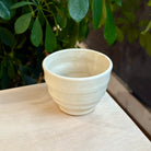 ガイ・マツダによるこの器は、開かれた形とやわらかな深さが静かな使用を誘います。釉薬の詳細は不明ですが、柔らかな白と淡い琥珀色が薪窯焼成によって生まれた灰の表情とともに器面を彩り、穏やかな温もりを感じさせます。コンパクトながら程よい広がりがあり、小さな抹茶碗として、お菓子や副菜の器として、または静けさをたたえた存在としても美しく映えます。食品使用可、電子レンジ・食洗機対応。