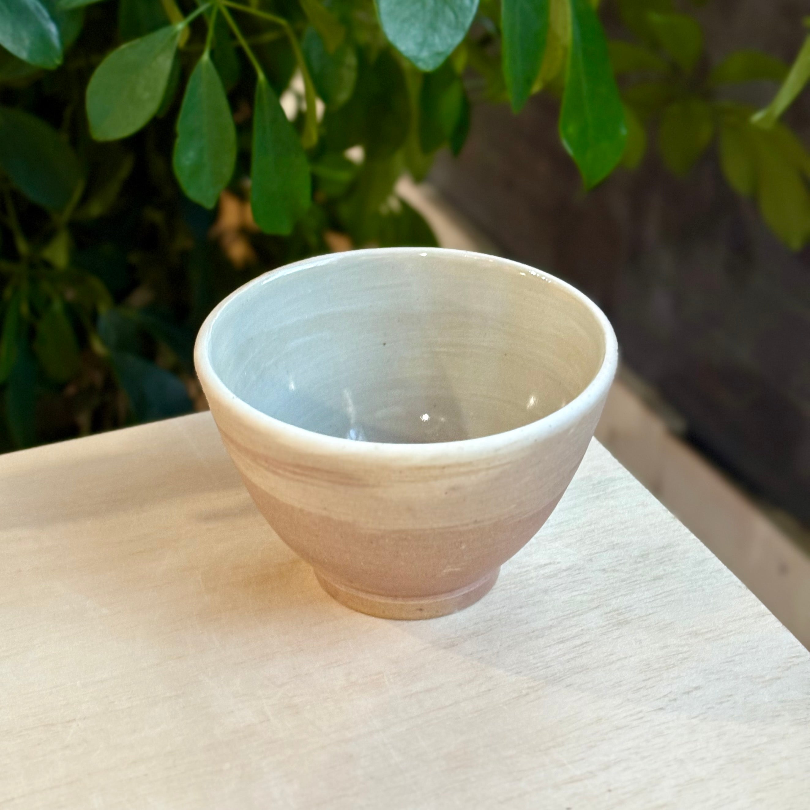 ガイ・マツダによるこの陶器のご飯茶碗は、内側に青磁釉、外側に白化粧を施し、薪窯焼成による炎と灰の偶然の作用で、柔らかく味わい深い表情に仕上がっています。釉と化粧土のやさしい対比が美しく、静かな存在感を放つ器です。ご飯はもちろん、小さな食事やお茶の時間にもおすすめです。