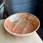 Wheel-thrown in stoneware by Guy Matsuda, this serving bowl is glazed in Shino with wax-resist markings and shaped by two firings—first in a wood kiln, then refired in gas. The wood firing leaves soft flashing, ember shadows, and warm tonal shifts, while the gas refiring clarifies the surface and draws out subtle variations of white, peach, and smoke. Wax-resist patterns reveal the clay underneath, giving the exterior a quiet movement that feels both intentional and organic.