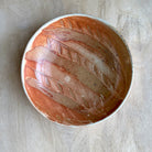 guy matsuda による石器土のサービングボウル。薪窯での焼成の後、ガス窯で再焼成することで、志野釉に柔らかな火色と奥行きのある表情が生まれています。薪窯特有の淡いフラッシングや灰の景色に、再焼成による整った質感が重なり、白、桃色、淡い灰のニュアンスが穏やかに広がります。外側のワックスレジスト模様からは土の色がのぞき、自然で心地よい動きを感じさせます。