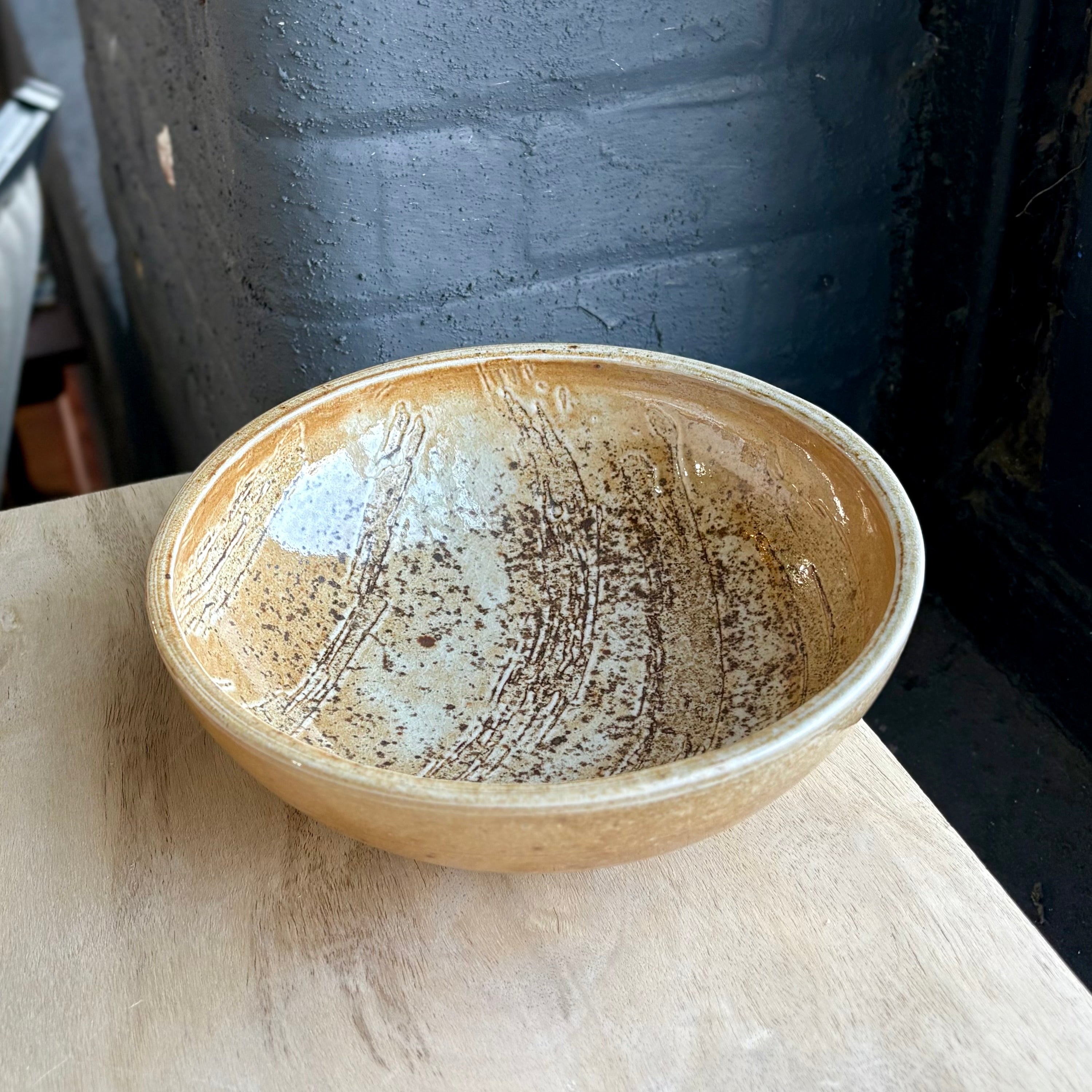 Wheel-thrown in stoneware by Guy Matsuda, this small serving bowl carries the warmth and depth of Shino glaze shaped by two firings—first in a wood kiln, then refired in gas. The wood firing leaves soft flashes and ember-kissed tones, while the second firing refines the surface, creating a gentle interplay of white, peach, and smoky grey. Wax-resist markings trace subtle patterns across the exterior, revealing the clay body and adding an understated rhythm to the form.