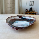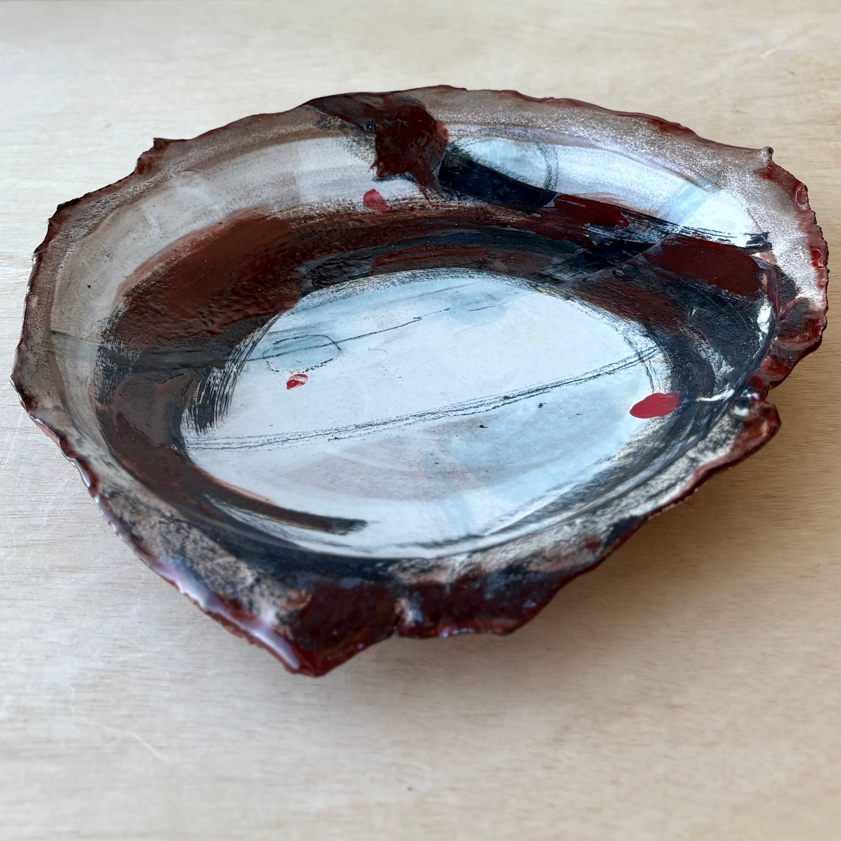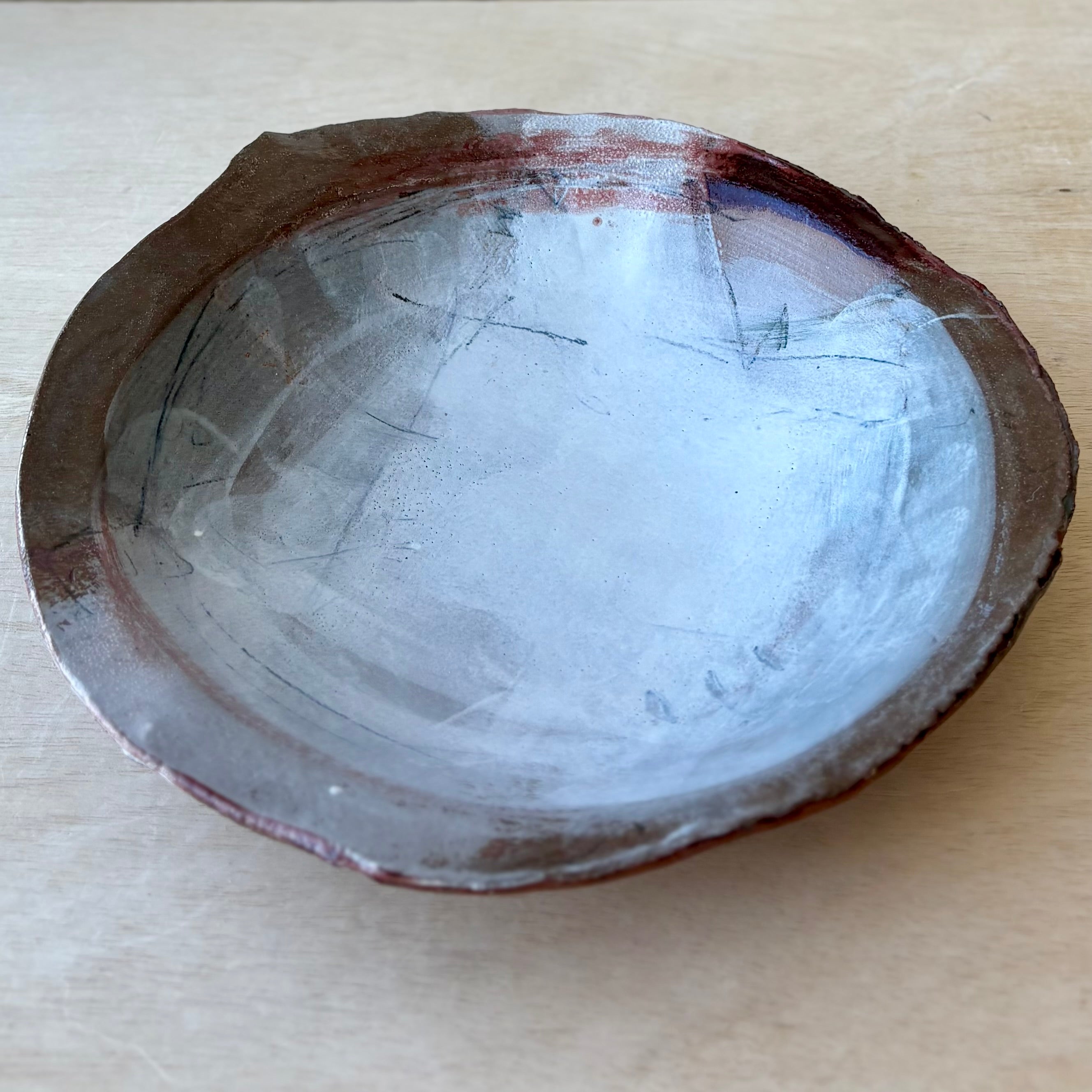 内側には淡い青磁と柔らかなグレーの色調が広がり、制作の痕跡を思わせる自由な線や筆致が静かな動きを与えています。縁にかけては鉄分を含んだ赤やスモーキーな茶色が現れ、料理を引き立てる印象的なフレームを形づくります。縁の高さや表情には一点ごとの自然な違いがあります。