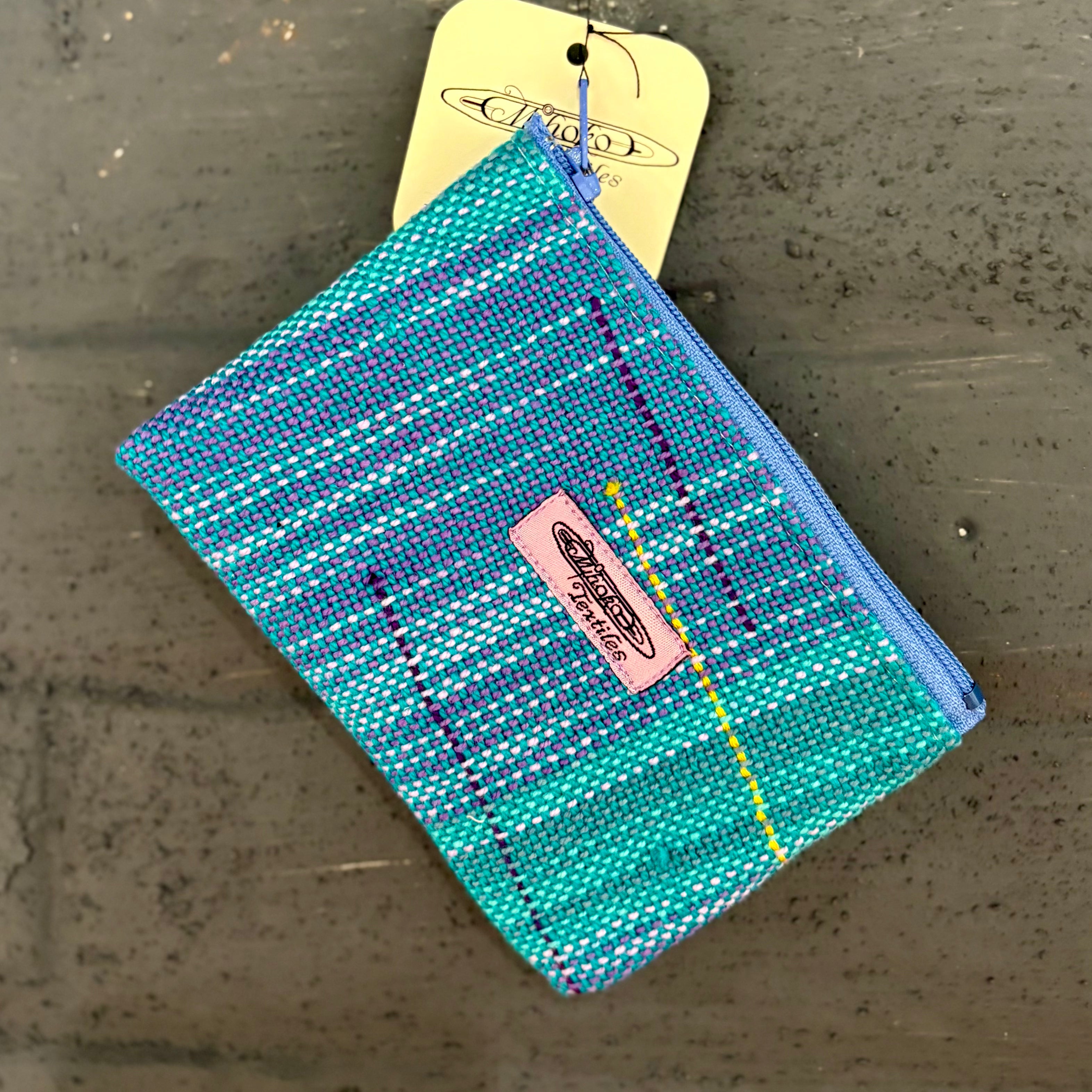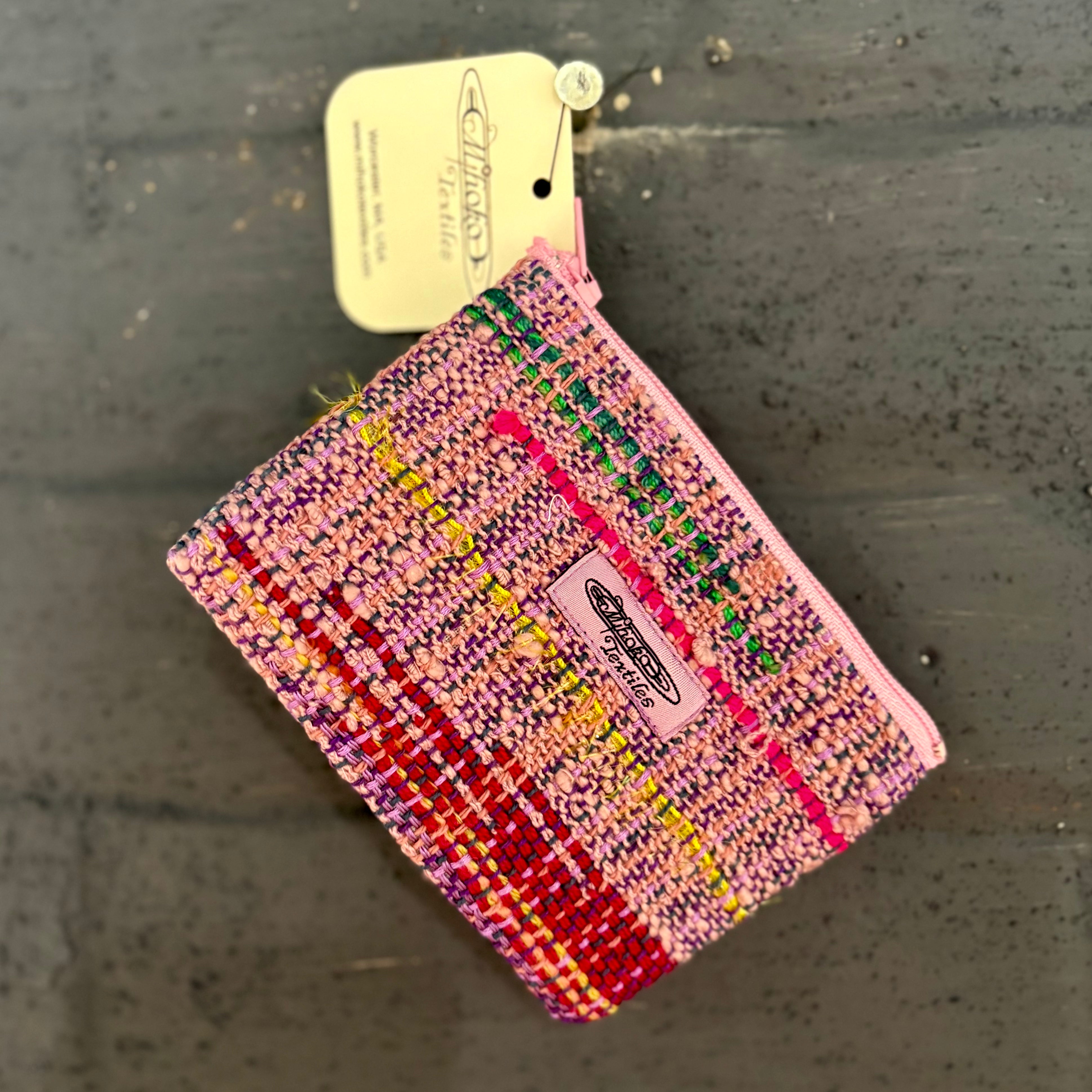 These small zippered pouches are handwoven improvisations by Mihoko Wakabayashi. Each one is a spontaneous composition—woven without predetermined pattern, using varied textures, colors, and natural fibers in free-flowing harmony. Perfect for cards, keys, lip balm, or other daily essentials.