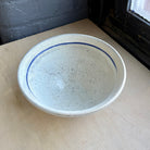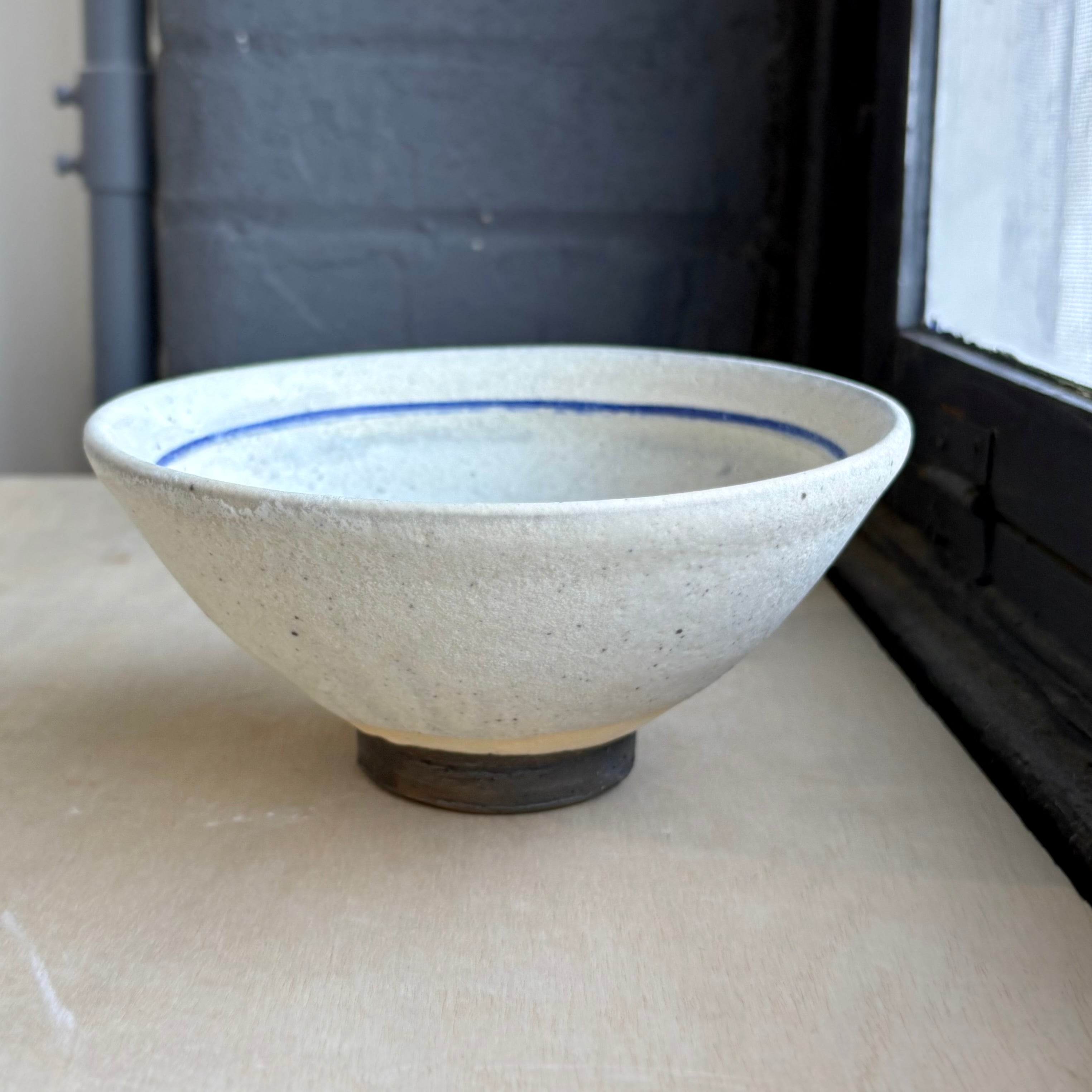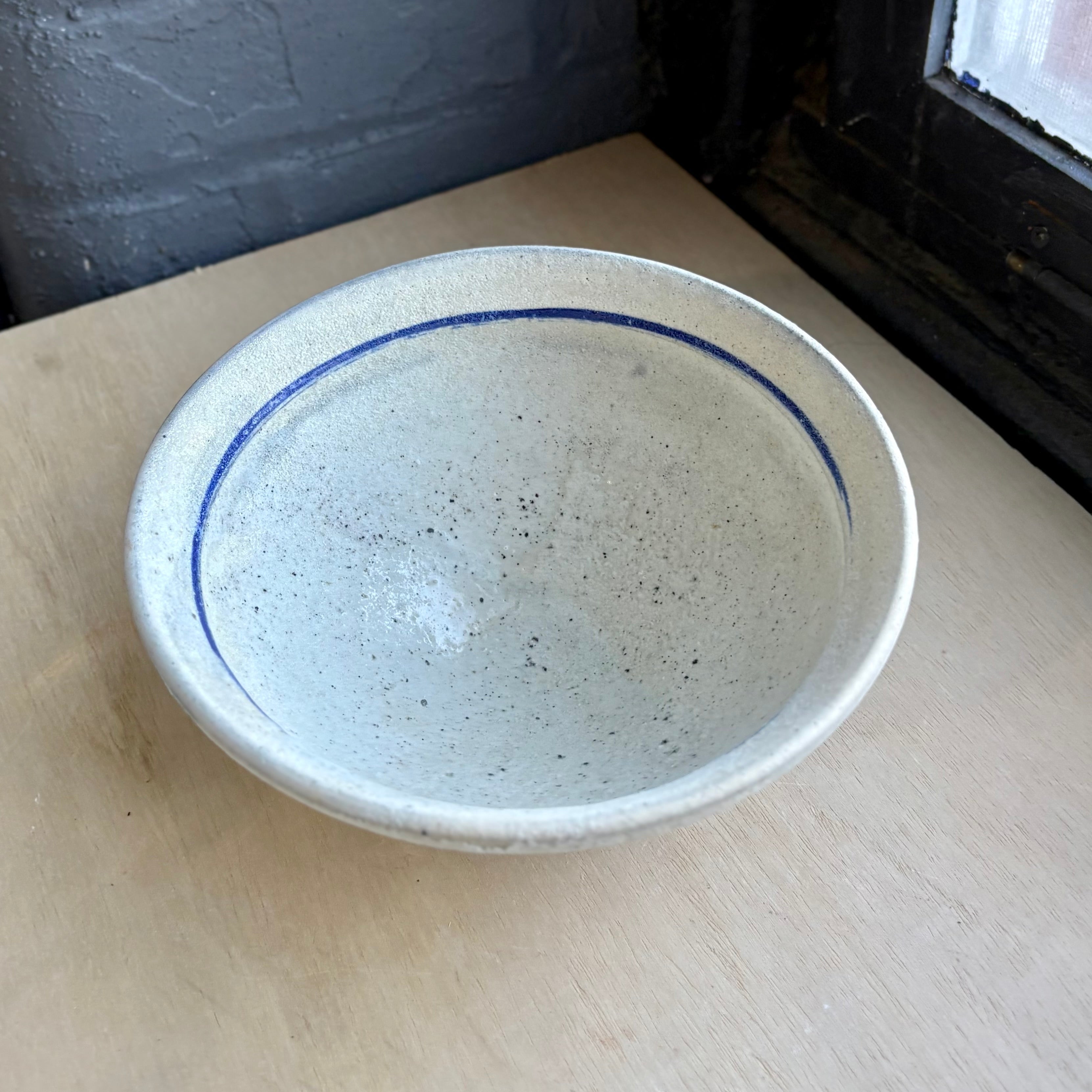 バーモント州の陶芸家 Silene DeCiucies による薪窯焼成の中鉢。長石と灰釉が炎の中でやわらかな灰色やクリーム色、土の色合いを映し出し、口縁近くに添えられたコバルトが鮮やかな青のアクセントとなっています。高さ約8cm、口径約18cm、底径約6.5cm。ご飯や麺類、副菜などに幅広く使える器です。一つ一つ異なる仕上がりを持ち、唯一無二の表情を楽しめます。食器用・電子レンジ対応・食洗機対応。