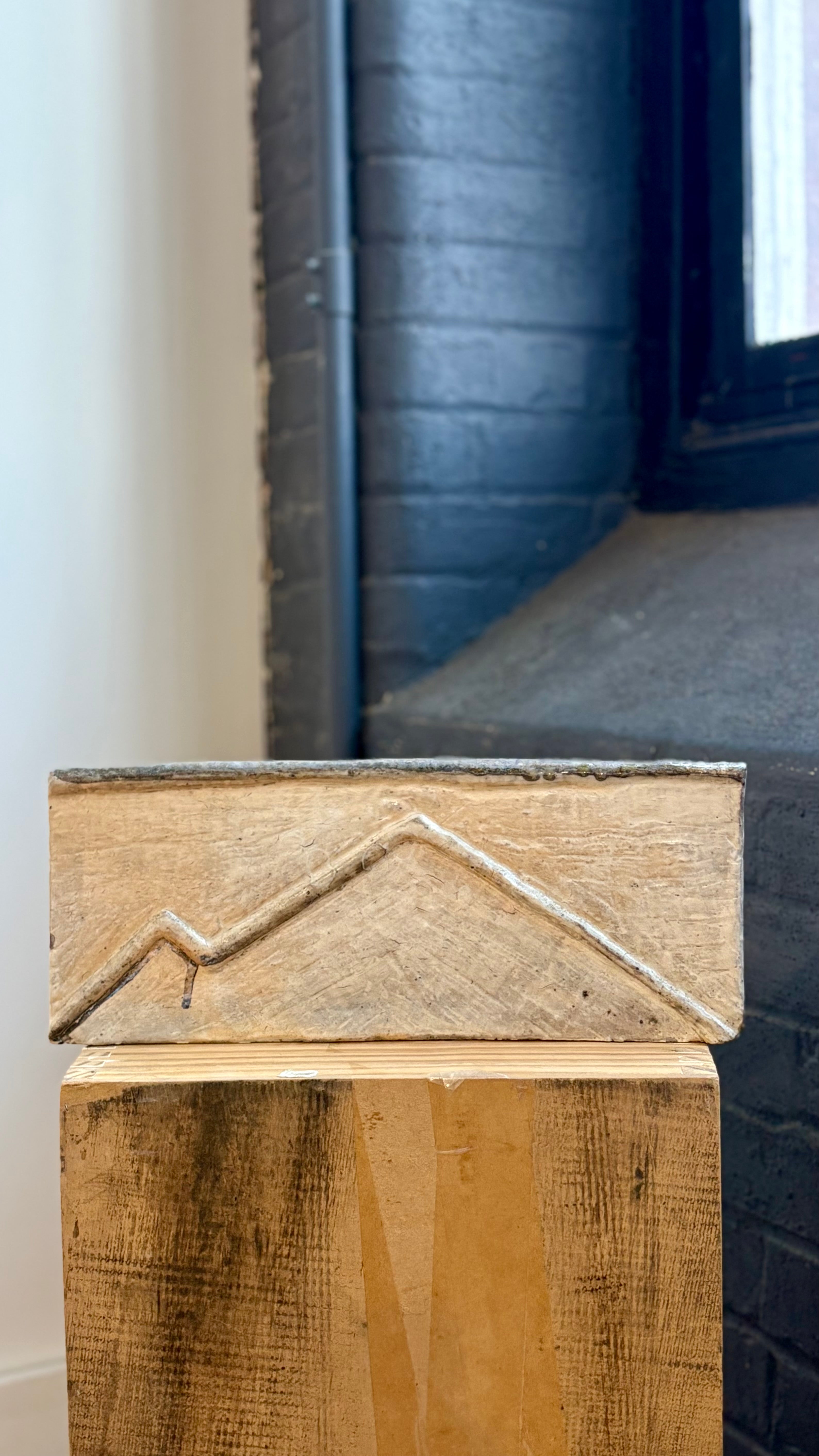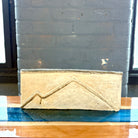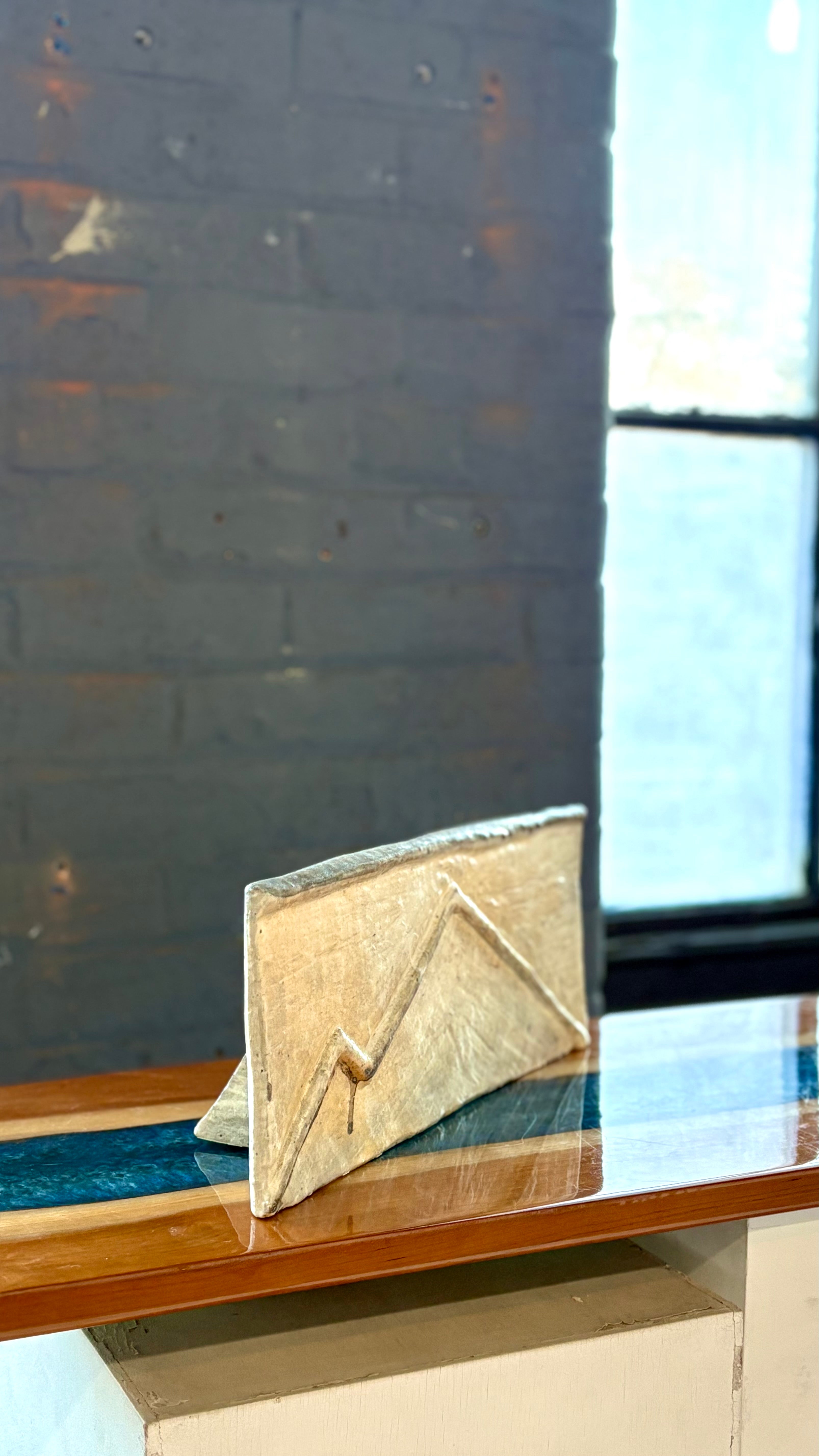 This handbuilt sculptural tablet by Andy Vlock evokes a quiet, elemental presence. Crafted from red clay and coated with porcelain slip, the surface remains unglazed, allowing the raw textures and wood-fired patina to take center stage. A carved mountain relief runs across the front, its subtle lines enhanced by the fire’s natural markings. Triangular ceramic supports attached to the back make this a freestanding piece, designed for display on a shelf or table rather than wall mounting. Measuring 6 inches high by 15 inches wide, it carries the weight of both landscape and form—an evocative work of ceramic artistry.