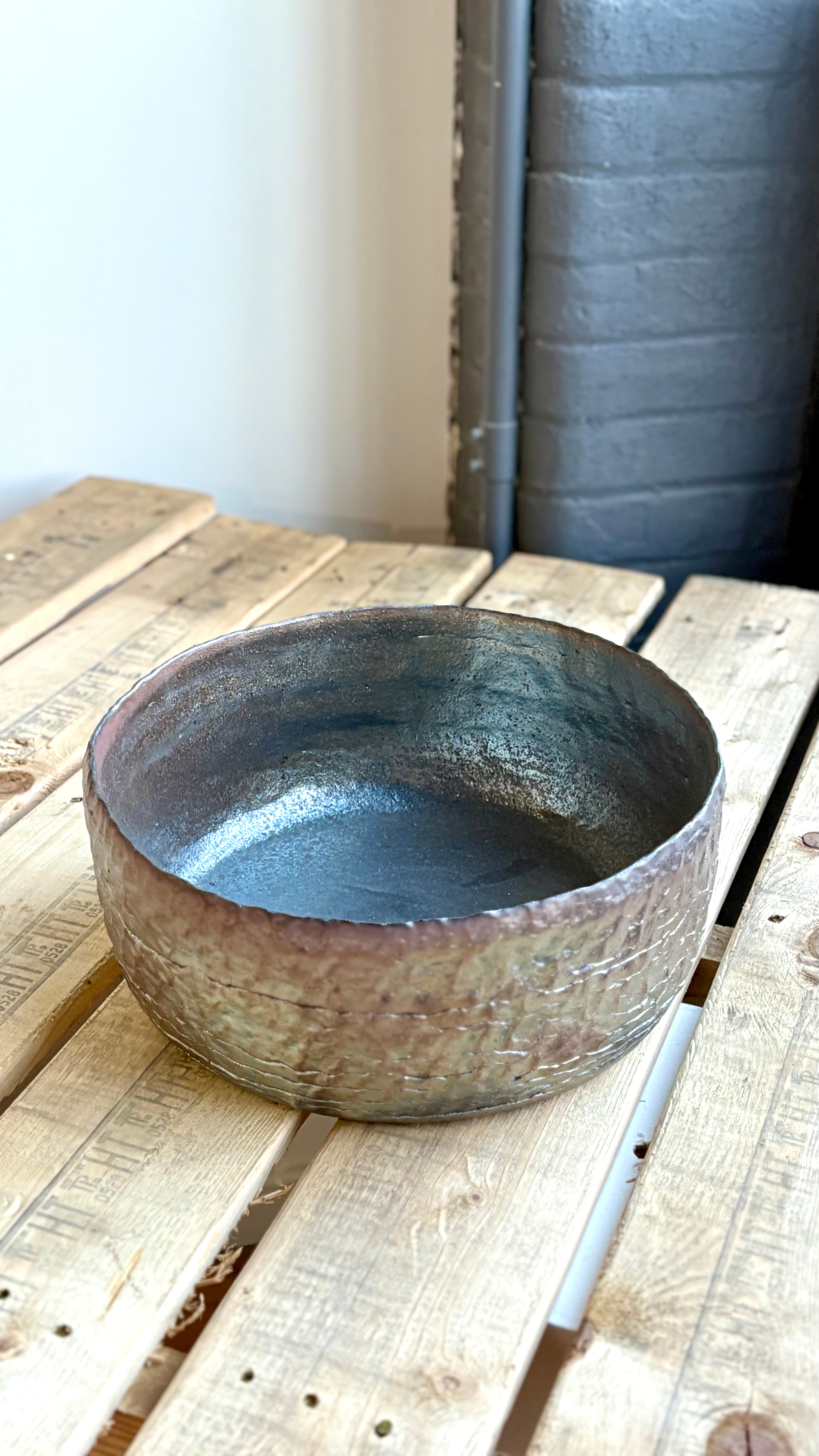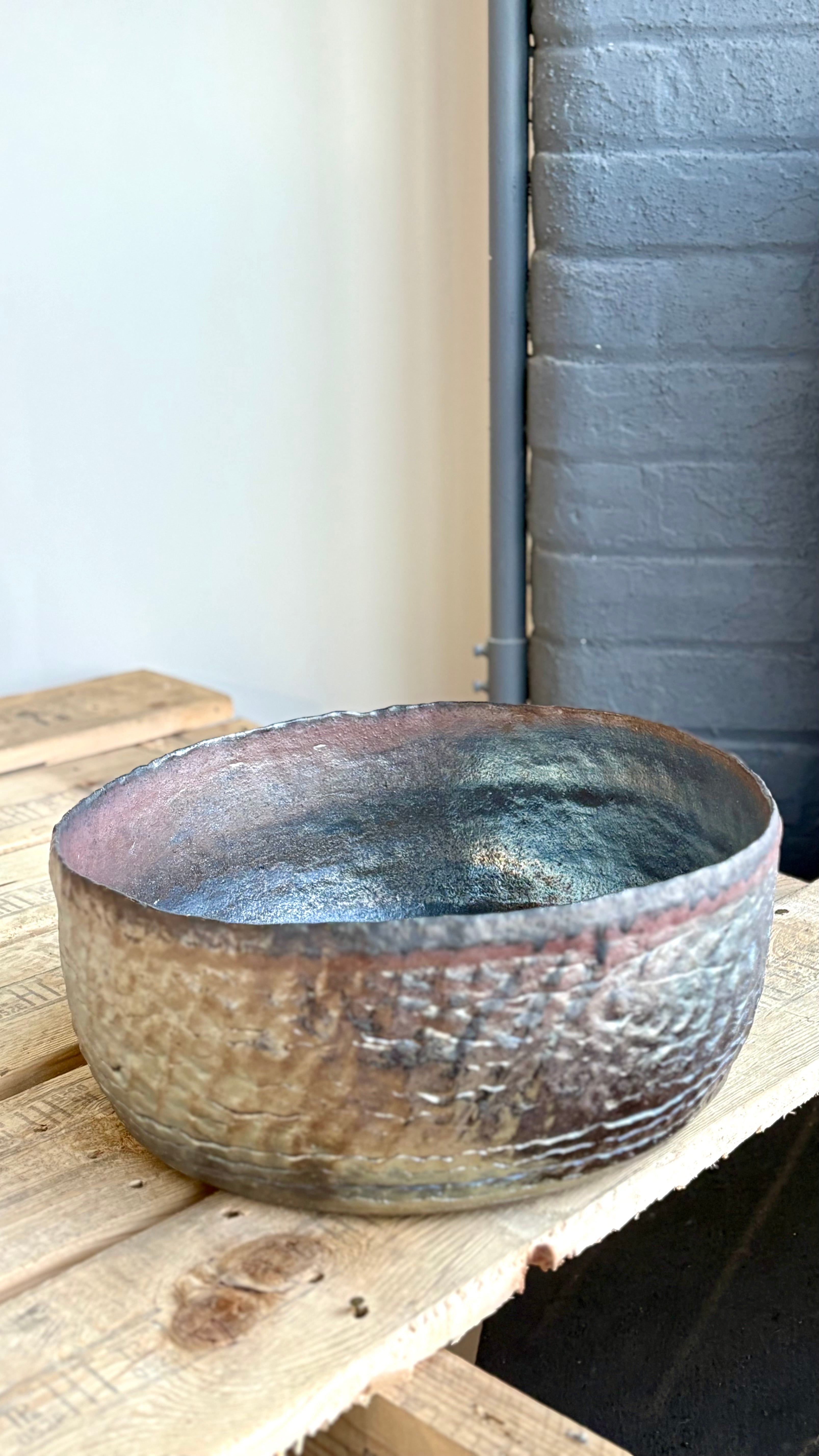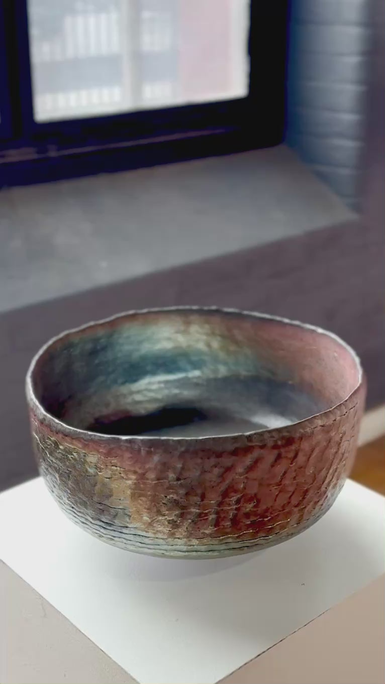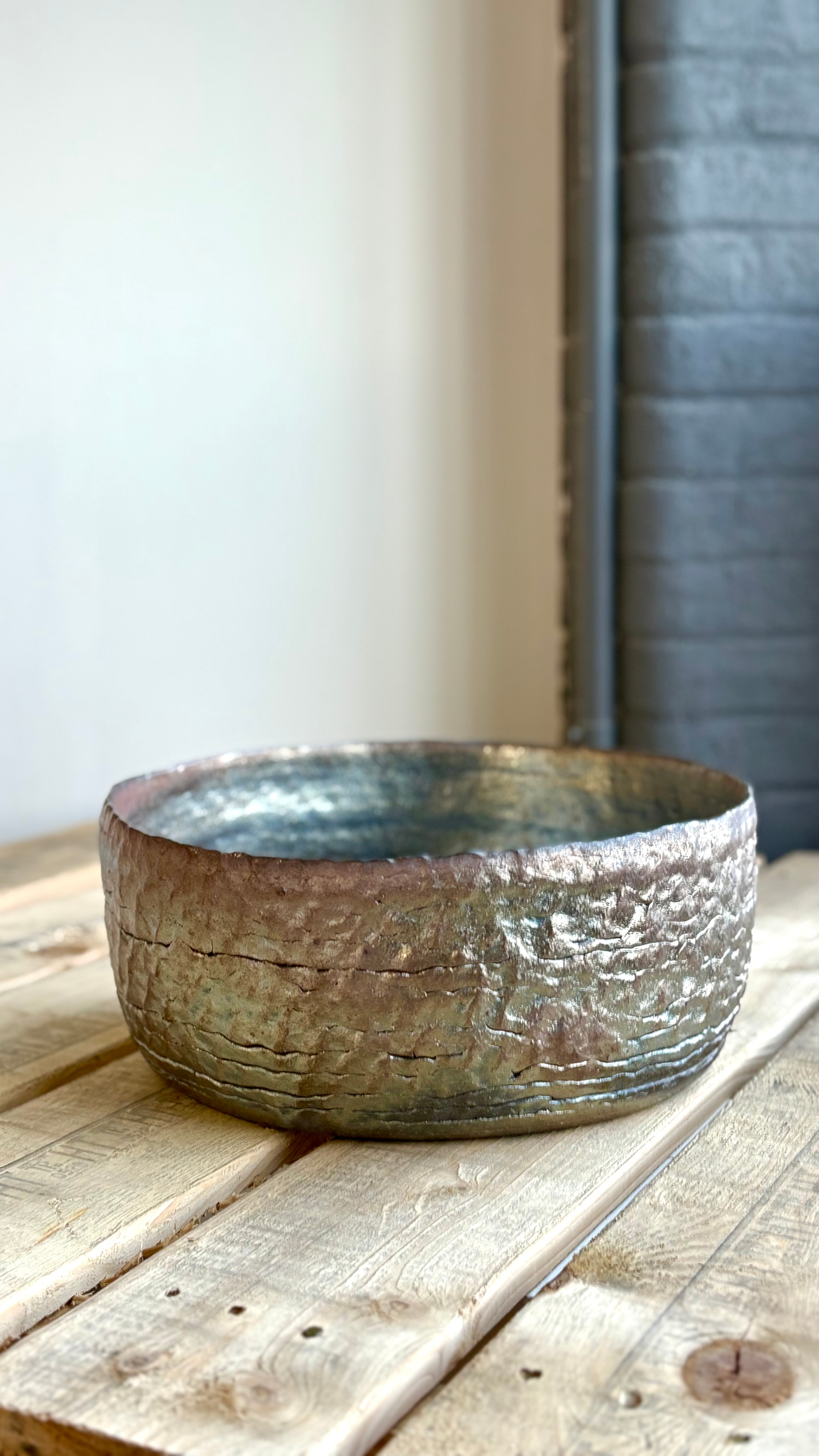 A vessel of presence and transformation, this handbuilt cauldron serving bowl by Andy Vlock is the largest and most commanding piece in the Hashi collection. Formed from red clay and left unglazed, its wood-fired surface is iridescent and semi-reflective, shifting in color depending on light and surroundings. This alchemical quality lends it a dynamic presence—sometimes warm and earthen, sometimes dark and metallic. At 13.25 inches in diameter and 5.75 inches high, it is equally suited for serving, display, or as a sculptural centerpiece. A singular work of raw elegance and fire-forged artistry.