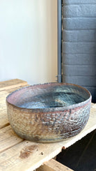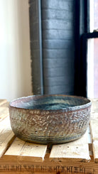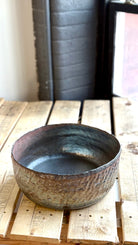 この 手作りの大釜型サービングボウル は、ハシのコレクションの中で最も存在感のある一品です。赤土 で成形され、釉薬を施さずに薪窯で焼成することで、表面が半光沢を帯び、光や周囲の環境によって色彩が微妙に変化する独特の質感 を生み出しています。ある時は温かみのある土の色、またある時は暗く金属的な輝きを放ち、まるで錬金術のような変容を見せます。直径13.25インチ (約34cm)、高さ5.75インチ (約15cm) の堂々たるサイズで、料理の盛り付けや装飾、または芸術的なオブジェとしても最適。火と土が生み出した、唯一無二の作品です。