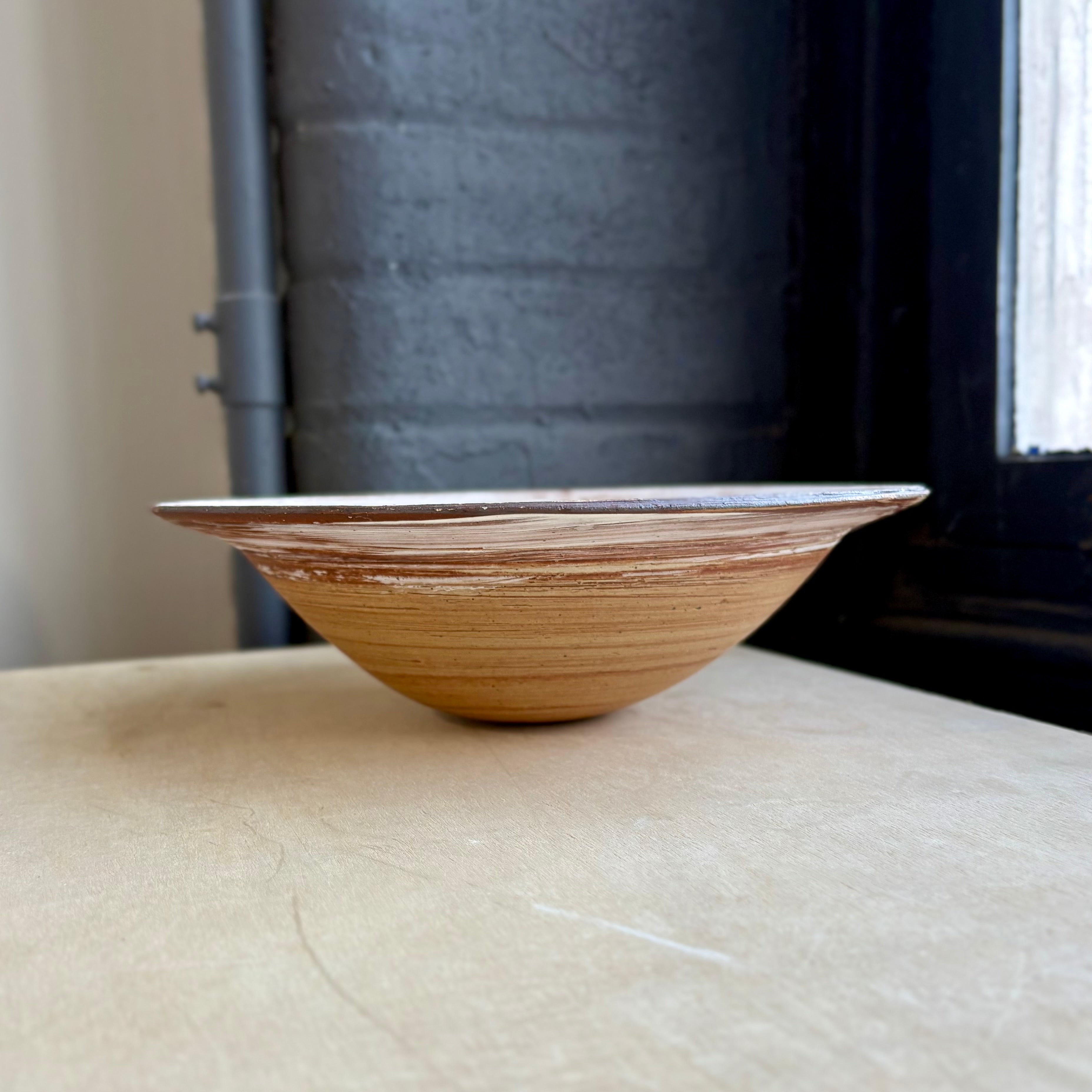 This handbuilt serving bowl by Juli Kirk features a gently banded exterior—horizontal ridges that echo the rhythm of hand and form. The inside glows with soft, layered glazes, creating a visual contrast that heightens the bowl’s presence. Its balanced shape and medium depth make it perfect for shared salads, noodles, or seasonal fruit. Food safe, microwave safe, and dishwasher safe, this piece brings tactility, elegance, and ease to everyday meals.