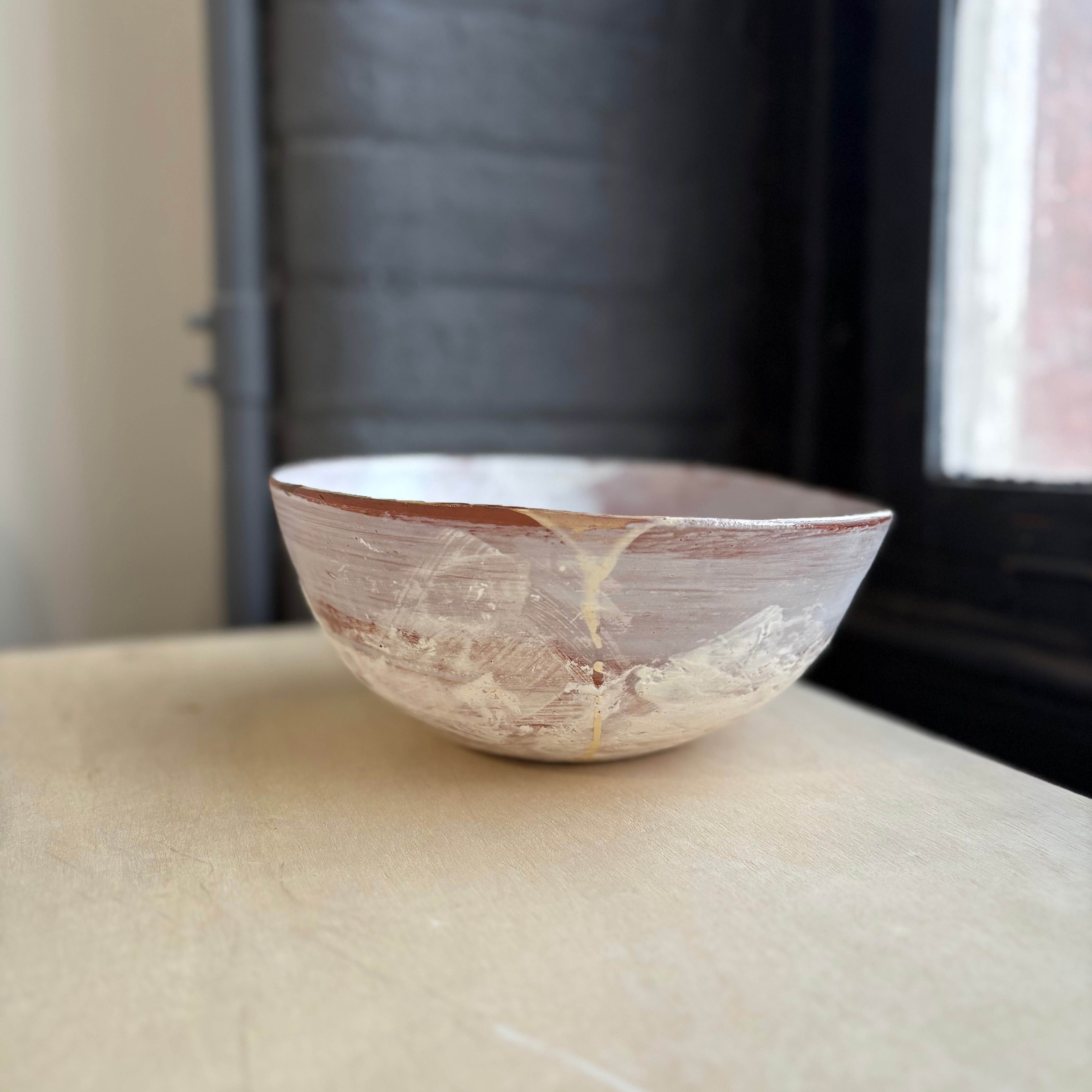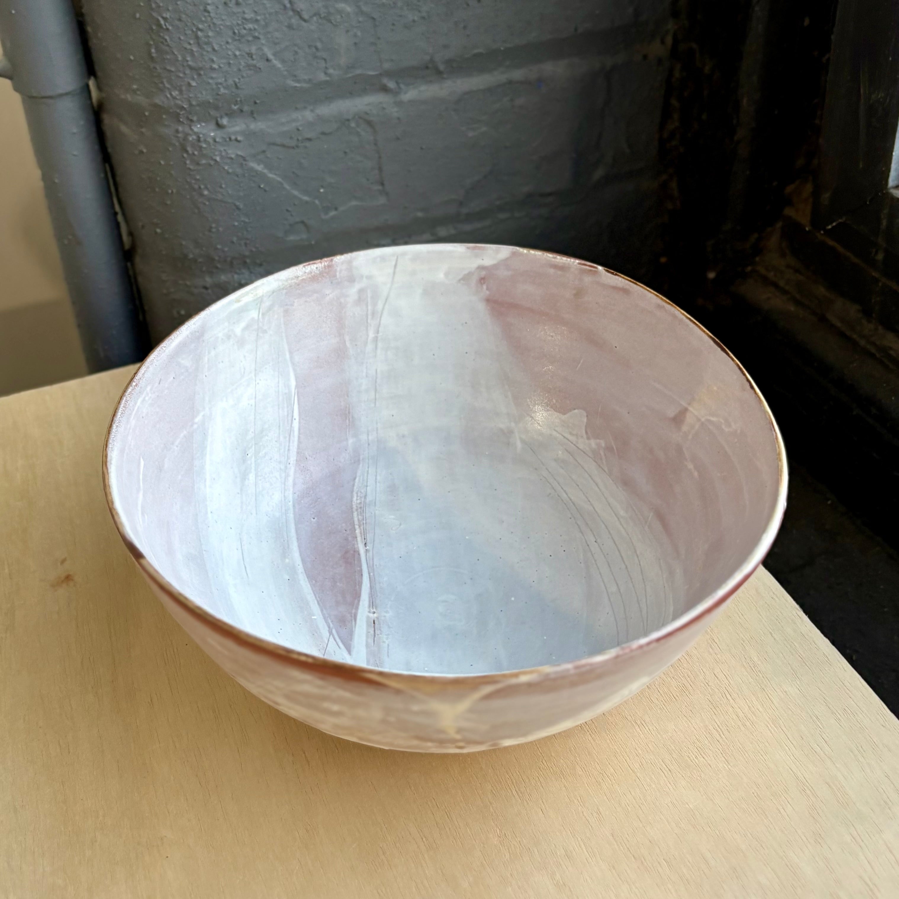 Handbuilt by Juli Kirk, this one-of-a-kind serving bowl invites both touch and gaze. Gentle curves rise from a steady base to a wide, open rim, ideal for salads, shared vegetables, or a heaping pile of summer fruit. Juli’s layered surface treatments—slips, washes, and oxides—create a field of quiet movement, with earthy markings that feel both intuitive and intentional. Though complex in appearance, the bowl is simple to care for: food safe, microwave safe, and dishwasher safe. A piece to be used daily and treasured always.