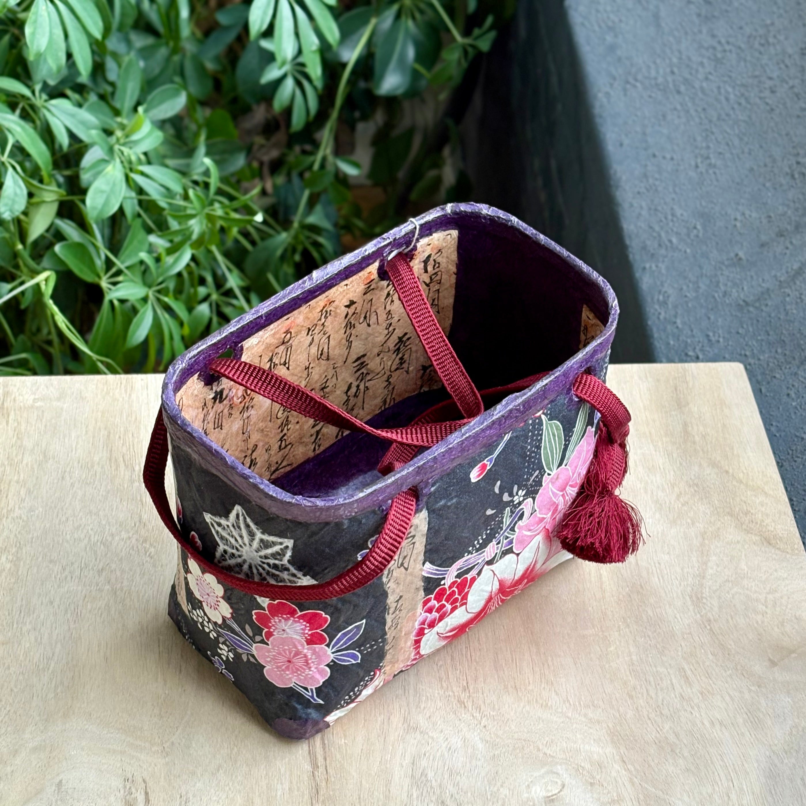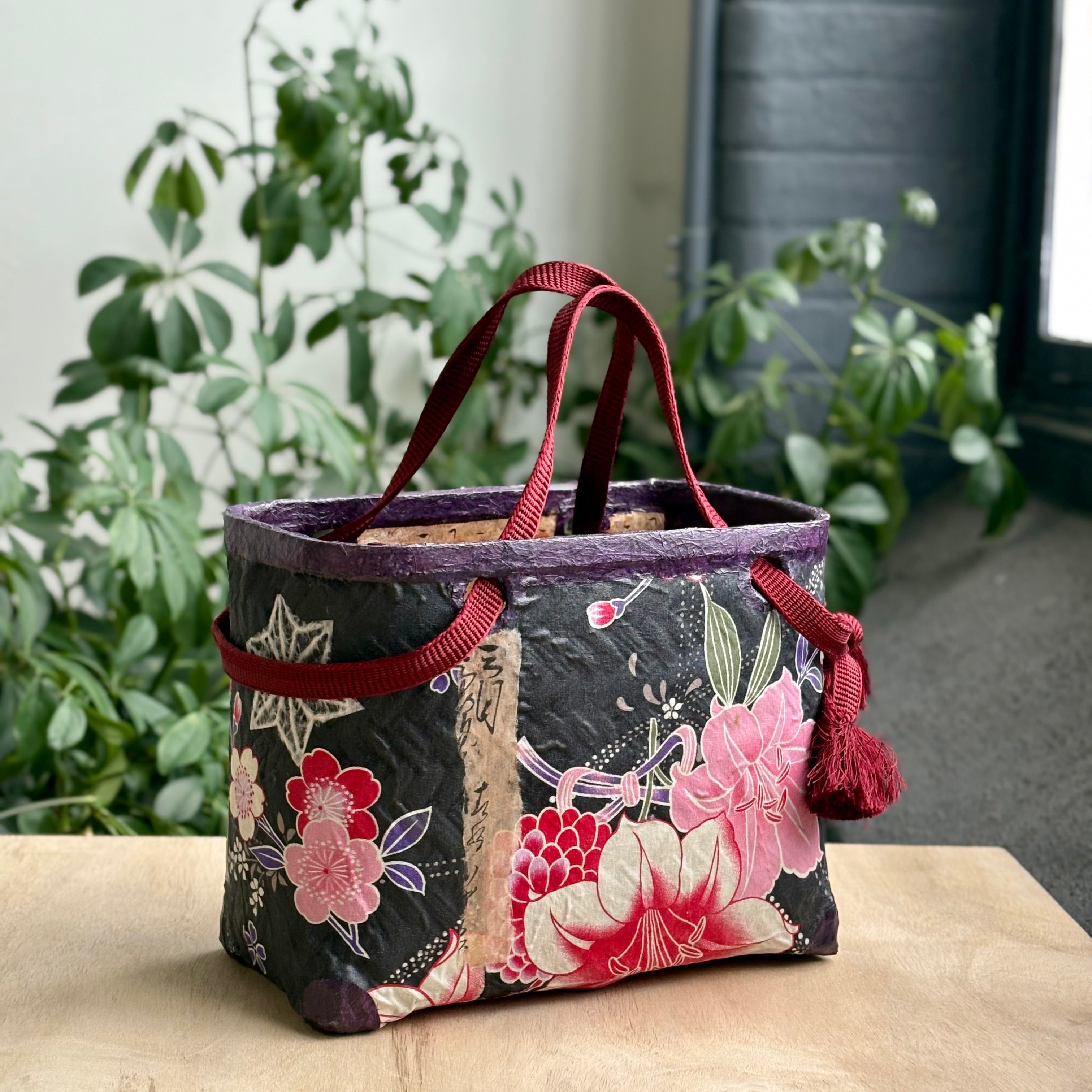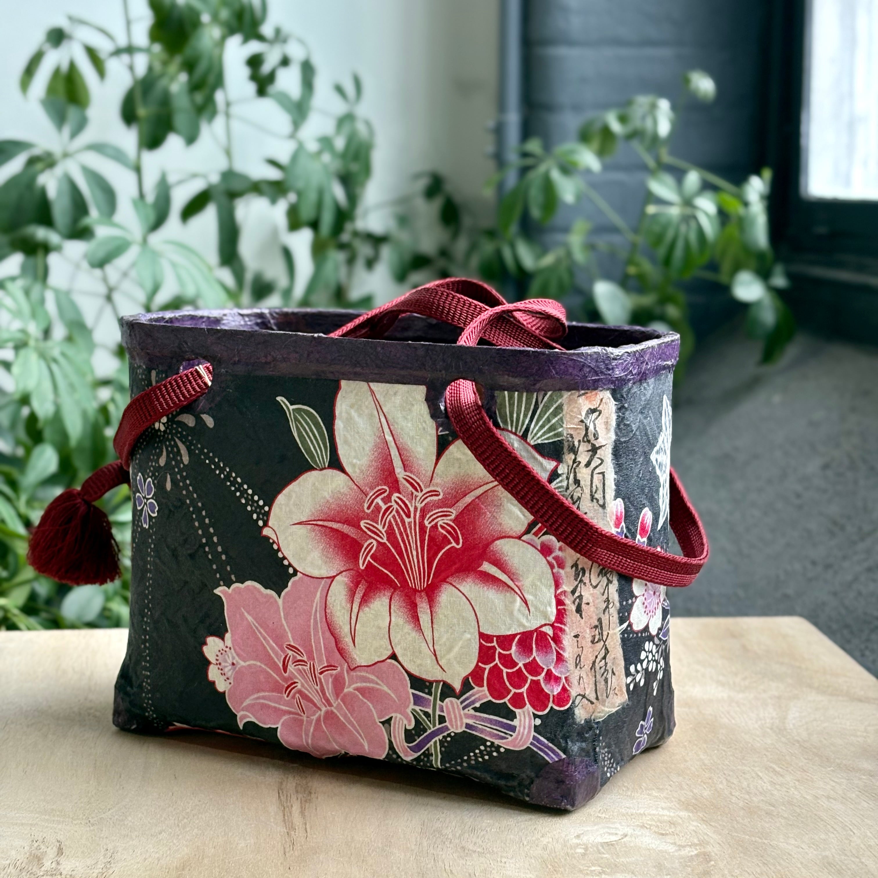 Handcrafted by Akemi Rice using the traditional ikkanbari technique, this one-of-a-kind handbag brings together repurposed basketry, handmade washi, vintage Japanese papers, and woodblock-print imagery. Each layer is brushed, glued, and burnished entirely by hand, creating a richly textured surface that carries the quiet patina of time.