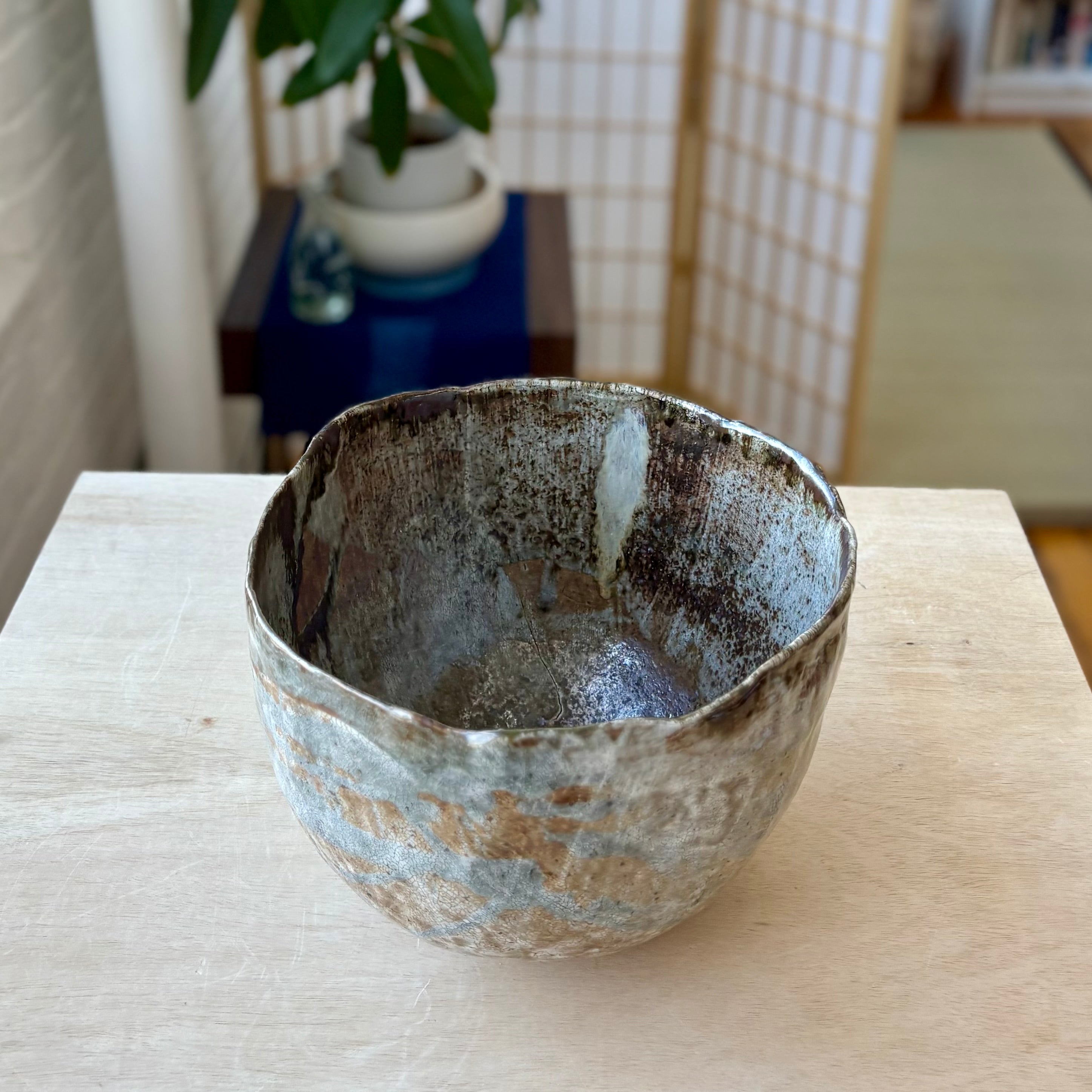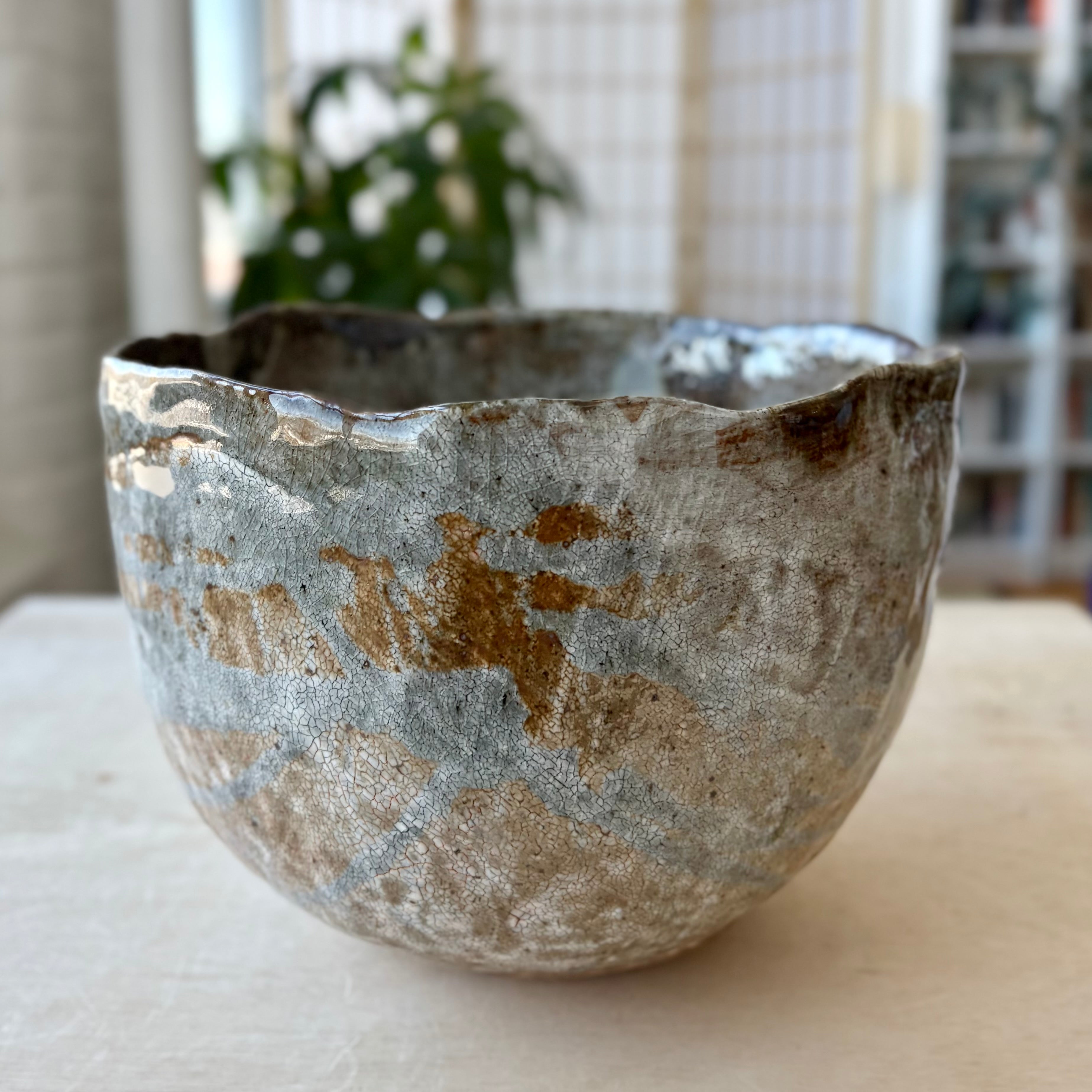 高さ約7インチ、直径約10インチ。たっぷりとしたサラダや果物、パン、取り分け料理に適し、食卓の中心として自然に機能します。また、何も盛らずに置いたときにも、空間を落ち着かせる存在となる一碗です。日常の使用と静かな鑑賞の両方に応える作品です。
