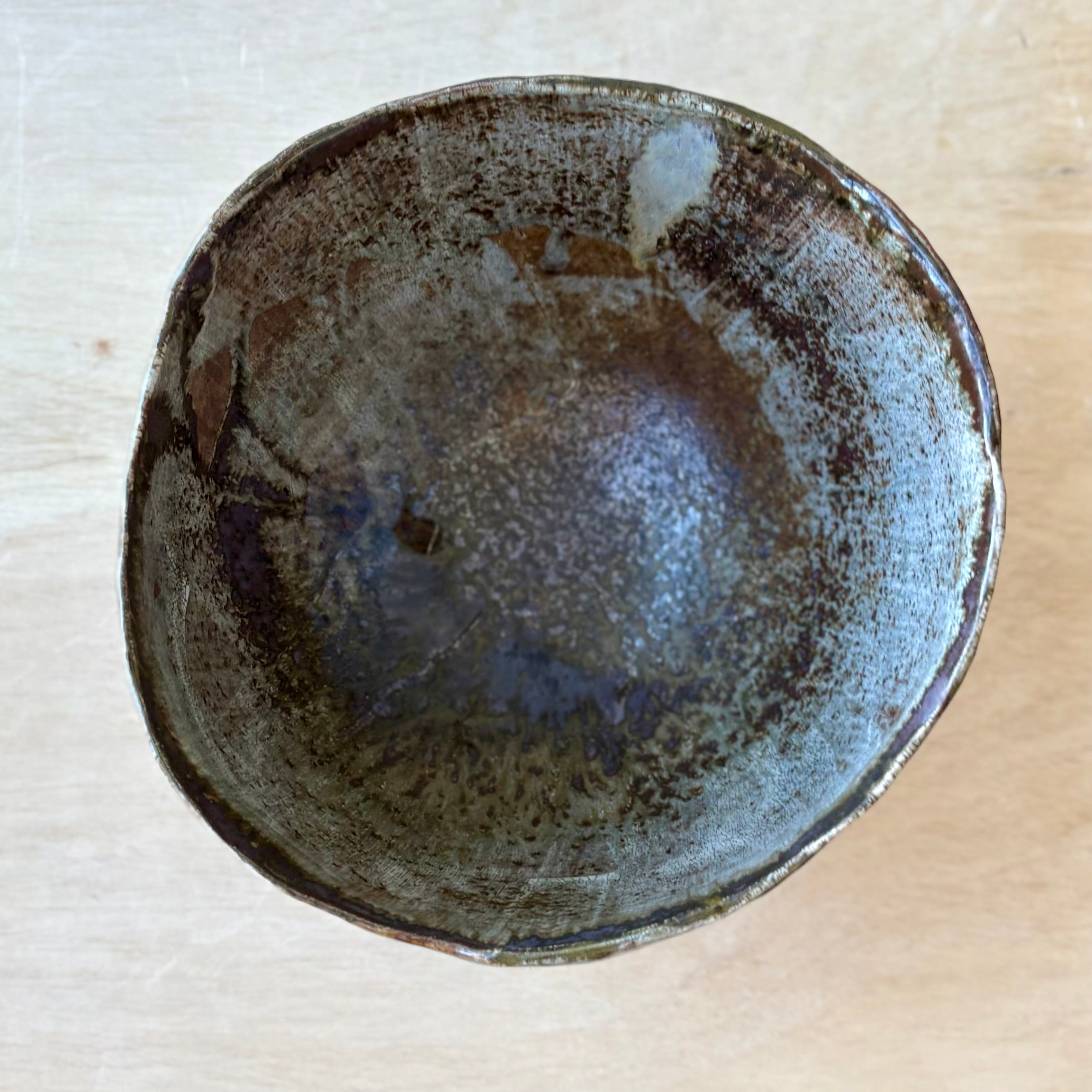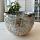 The surface carries a complex, weathered beauty—softly mottled, layered, and quietly luminous in places. Subtle shifts in tone and texture unfold across the interior and exterior, evoking stone, ash, and mineral deposits shaped by natural forces. Light settles into the bowl rather than bouncing away, emphasizing depth and stillness.