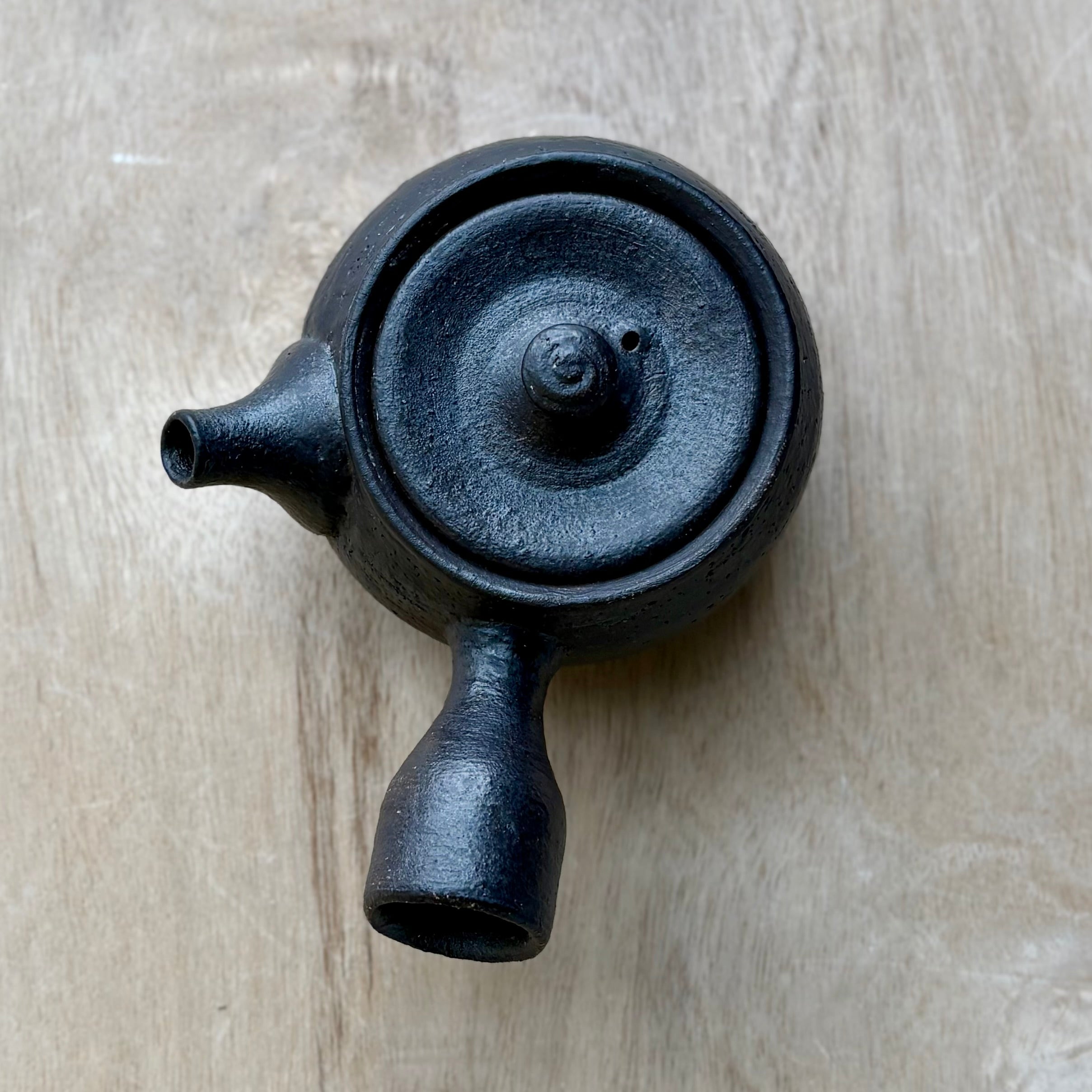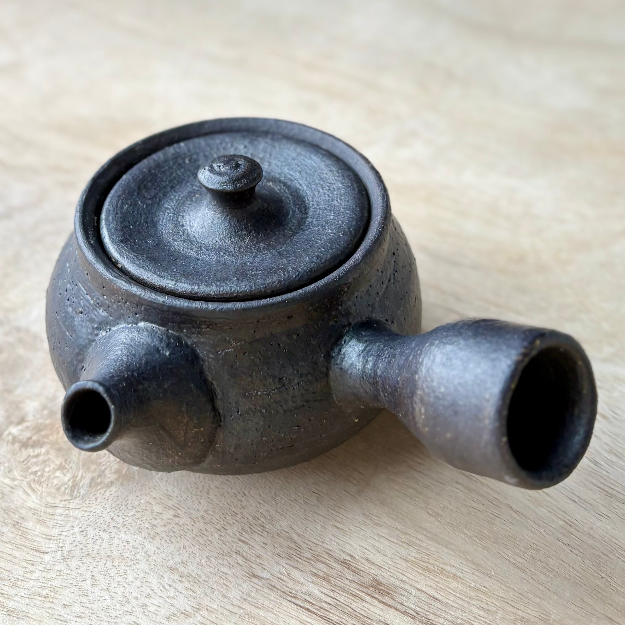 This handmade kyuusu teapot by Brandon Hale is formed from locally sourced wild clay and finished with a black slip, then electric fired to a soft, charcoal-toned surface. The form is compact and balanced, with a side handle that allows for steady, precise pouring—well suited to Japanese green teas and other delicate infusions.