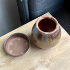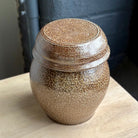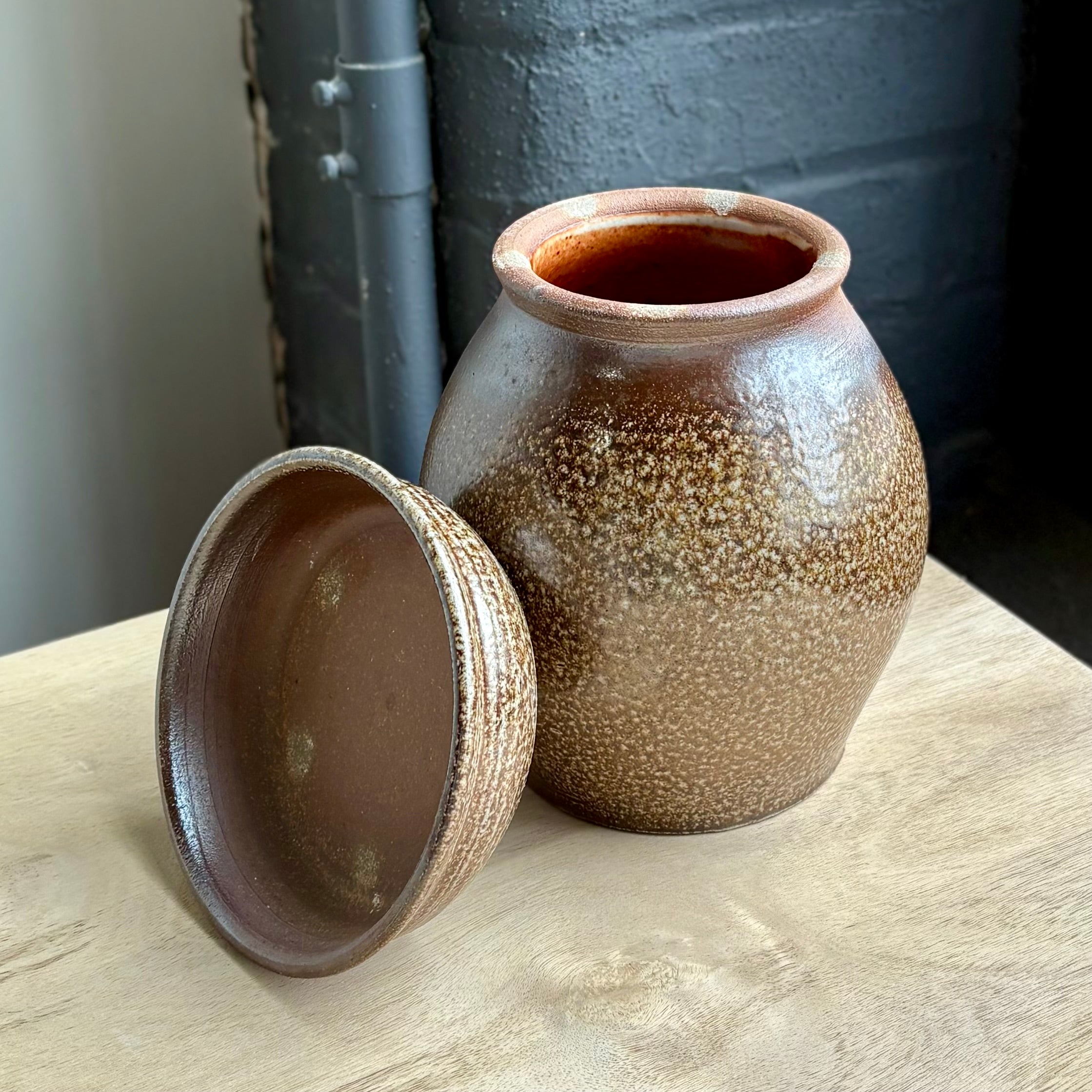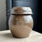 This wood and salt fired fermenting jar by Brandon Hale blends functional versatility with sculptural presence. Made from dark stoneware clay with a soft shino interior, the vessel breathes through its unglazed outer surface, bearing gentle traces of flame and ash. Its lidded form invites daily use: the lid itself doubles as a small serving bowl—for kimchi, pickled daikon, or whatever seasonal ferment you keep close at hand. A subtle indentation near the base marks the potter’s wheel-thrown rhythm, grounding the piece in the quiet pulse of handmade work.