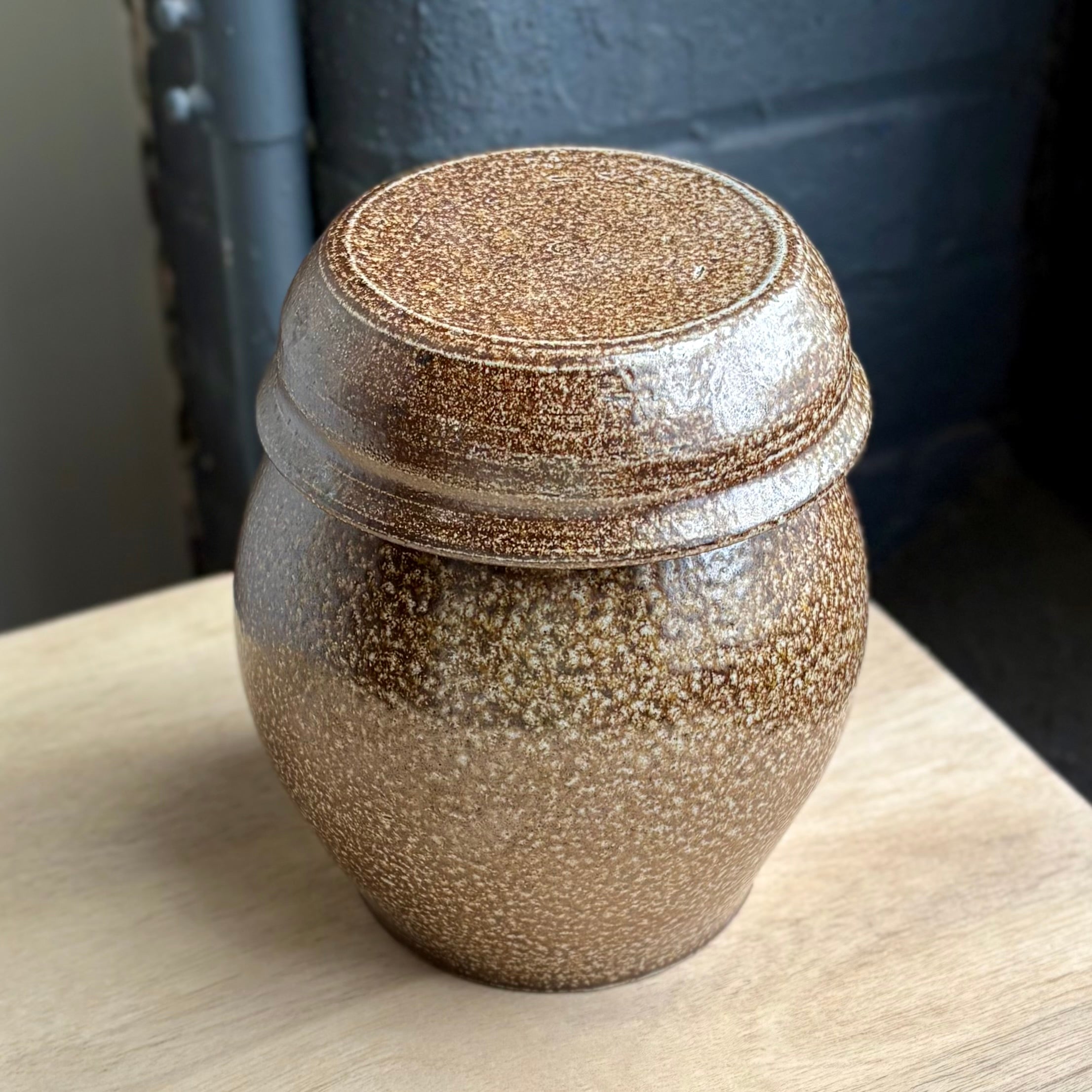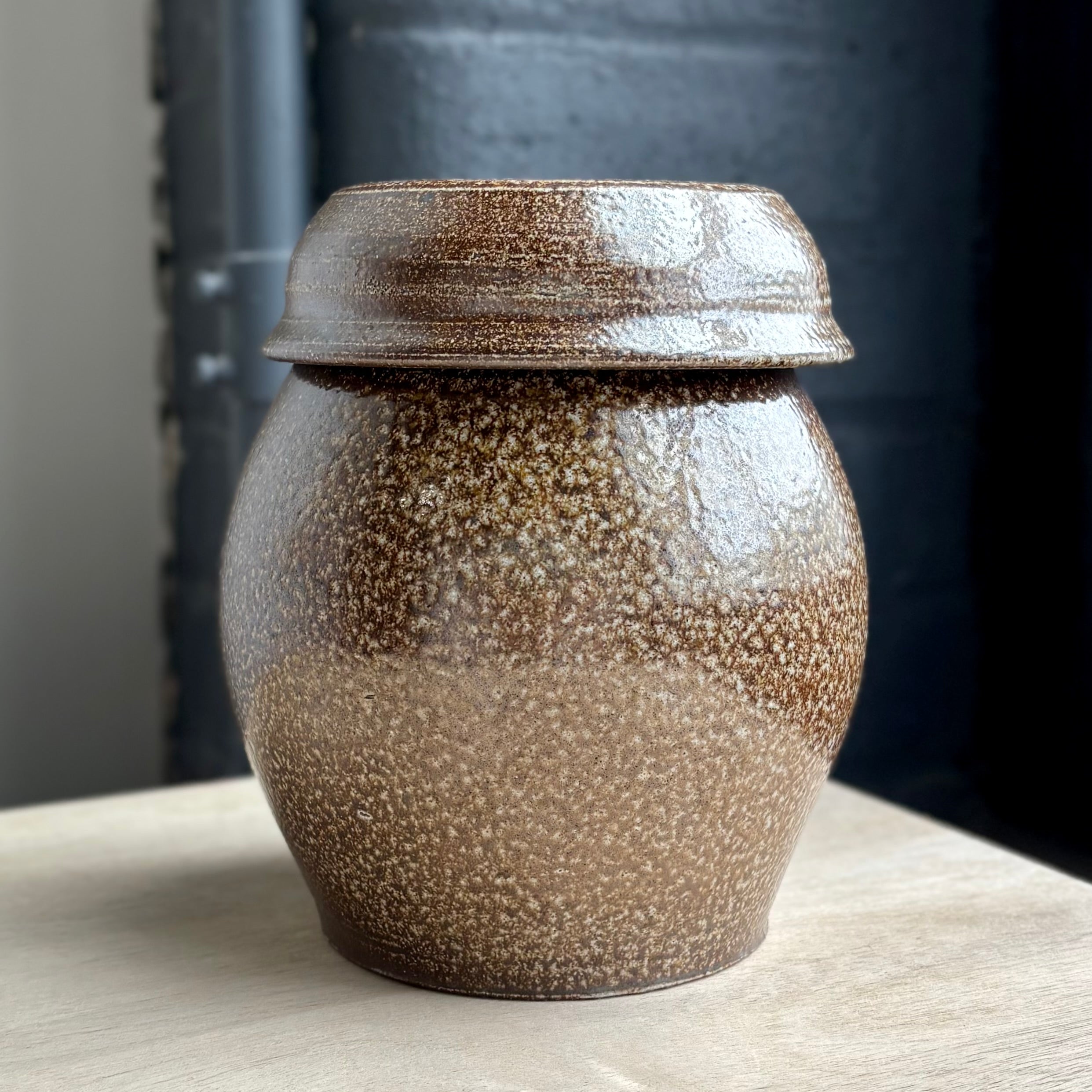 ブランドン・ヘイルによるこの発酵壺は、彫刻的な存在感と実用性が調和した一品です。ダークストーンウェアに志野釉の内側、外側は無釉で、薪と塩による焼成で炎や灰の痕跡が柔らかく浮かび上がります。蓋は小さな鉢としても使える設計で、キムチや大根の漬物、季節の発酵食品の取り分けにぴったり。ろくろ成形のリズムを残す底部のわずかな凹みが、手仕事の静かな息づかいを伝えます。