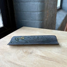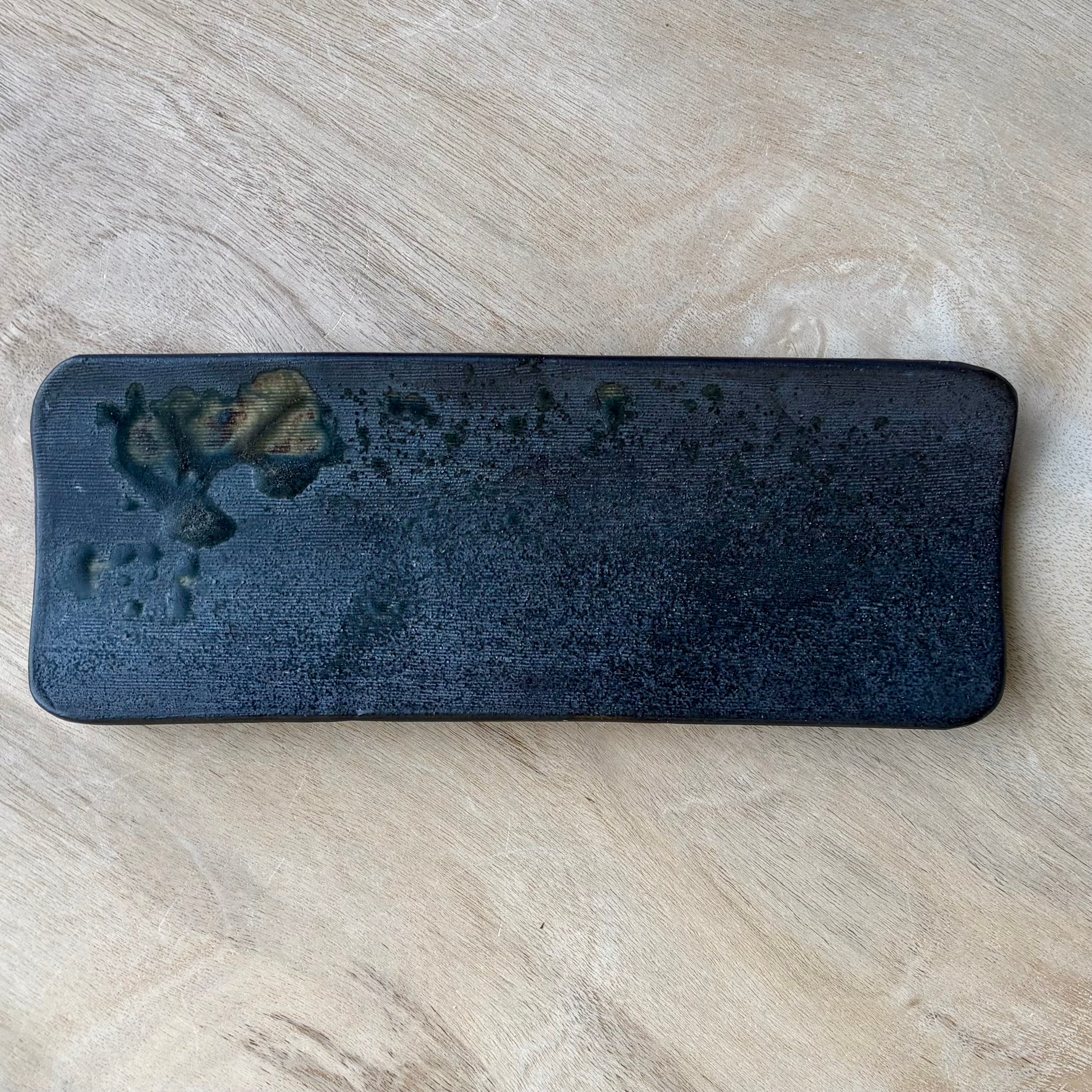 こちらのロングサービングトレイは、Brandon Haleが野生粘土を押し出し成形し、彫りを加えた後、黒化粧土と木灰を施して電気窯で焼成した作品です。表面には制作の過程を映す細かな線状のテクスチャーが連なり、静かなリズムを生み出しています。