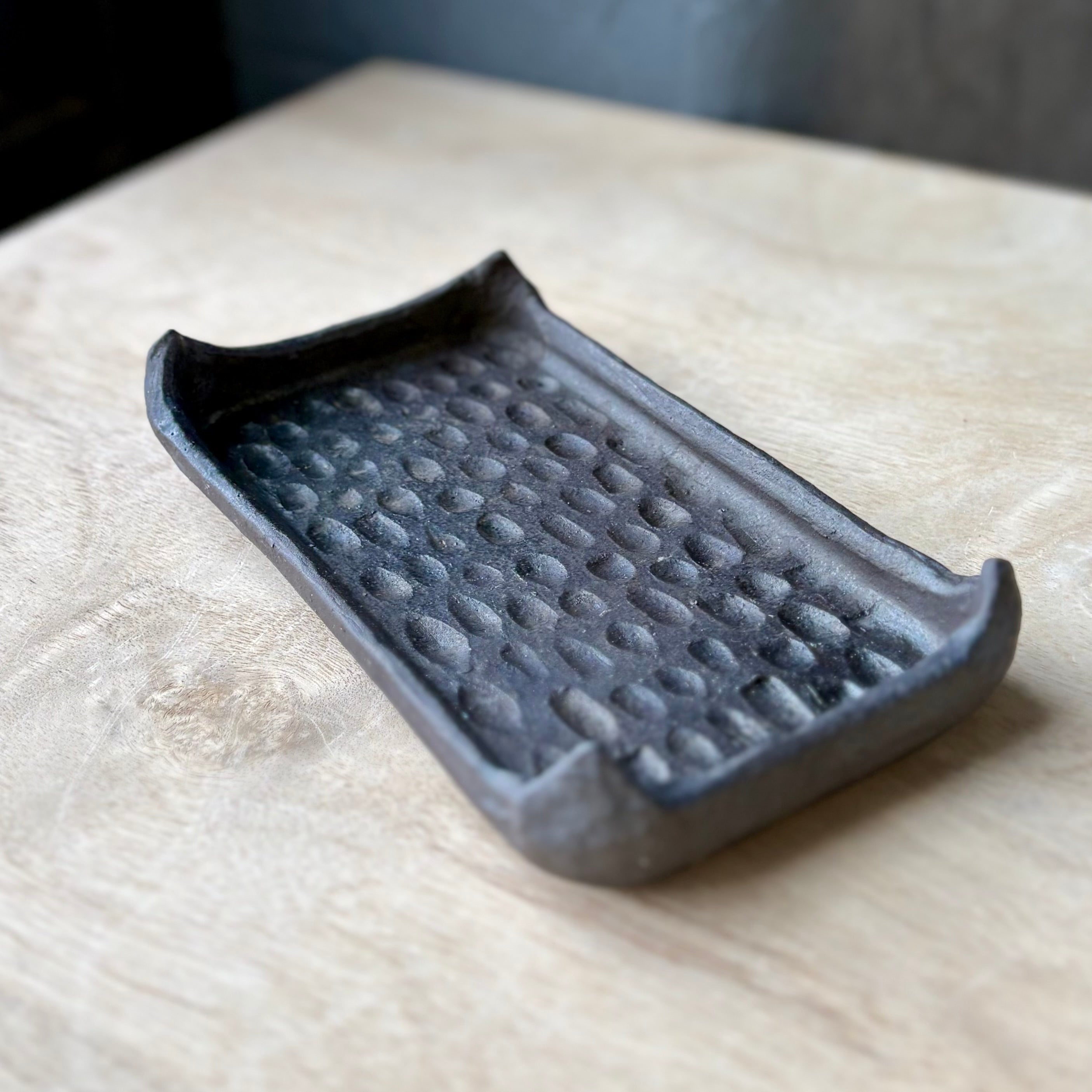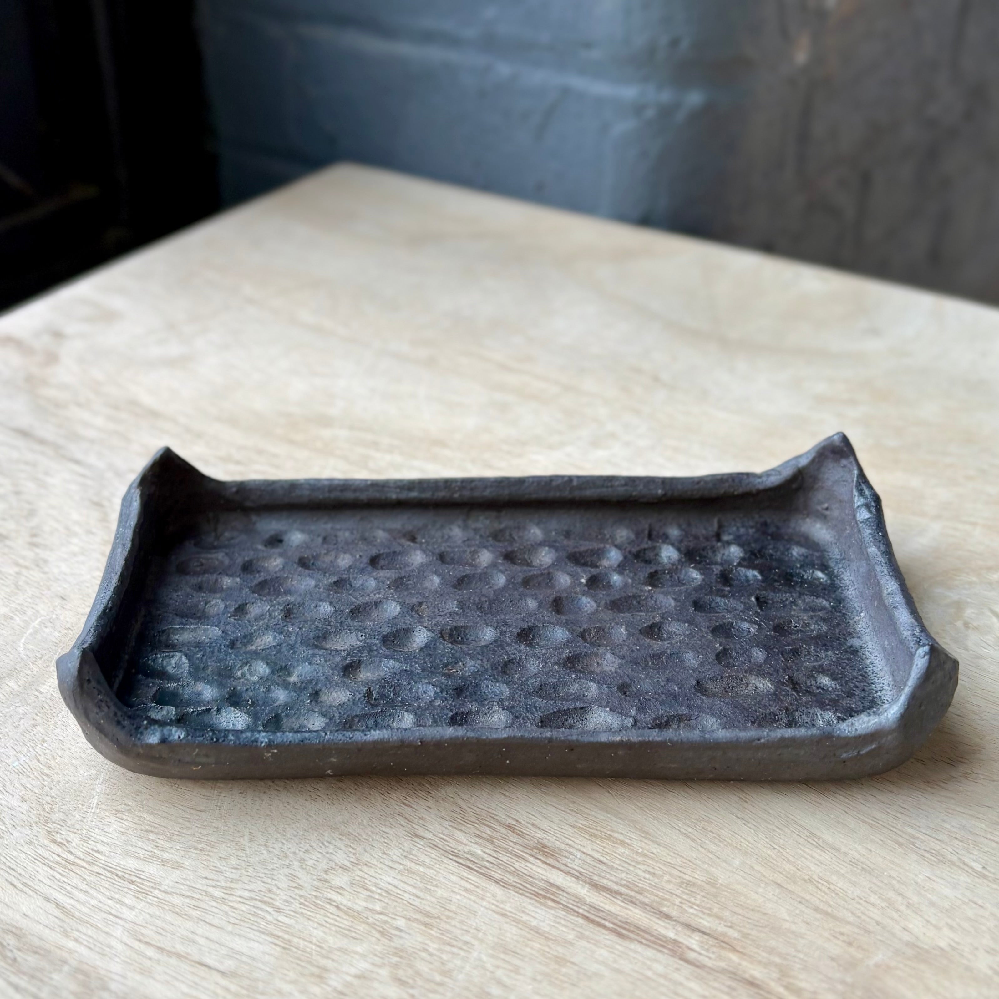 Handmade by Brandon Hale, this pebbled serving tray is formed from wild clay and shaped through extrusion and carving. A black slip and wood ash interact during electric firing, creating a softly reduced surface with layered gray-blue tones and a quiet, earthen depth.