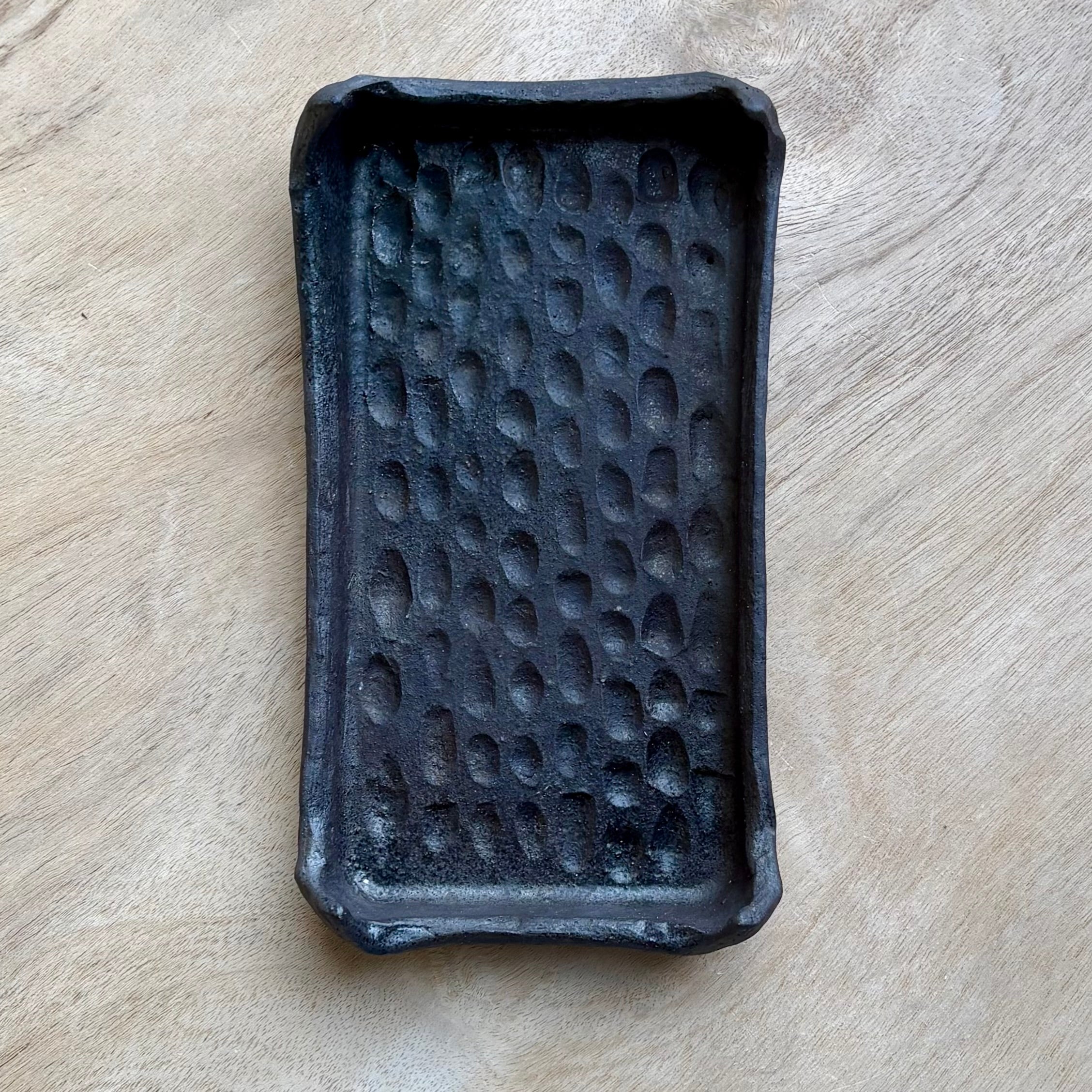 The interior is patterned with a field of thumb-pressed impressions—small, rounded dimples that give the tray both visual rhythm and a tactile presence. The gently lifted sides frame the surface, making it well suited for serving while also inviting use as a composed resting place.